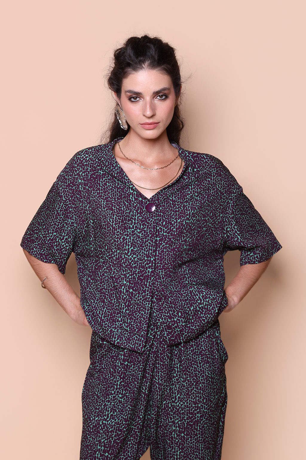 A blusa dois botões tem um caimento amplo e comprimento curto. Além disso, nossa blusa dois botões é produzida em tecido de viscose, tornando a roupa prática e leve, ideal para os dias de verão.
