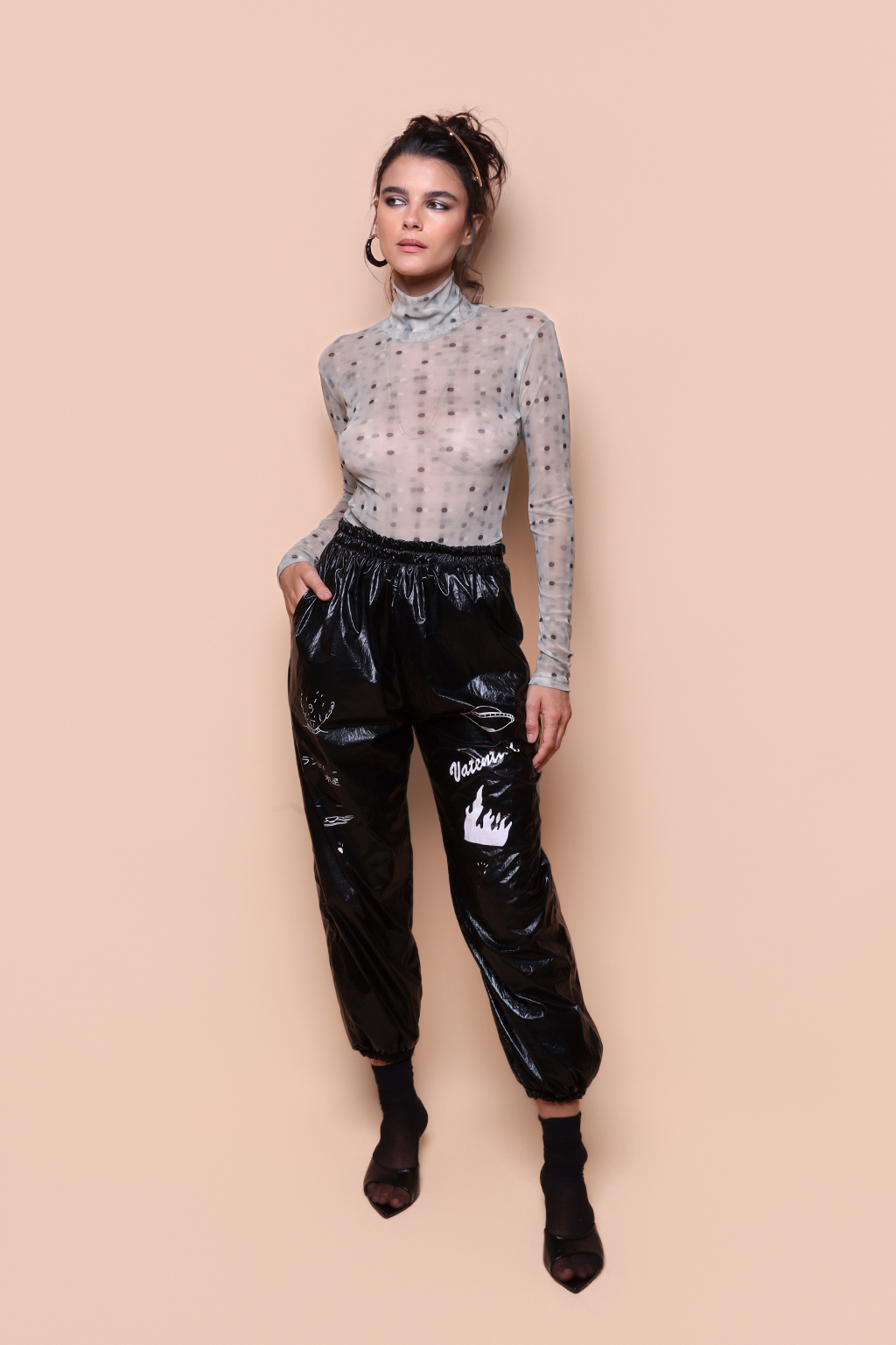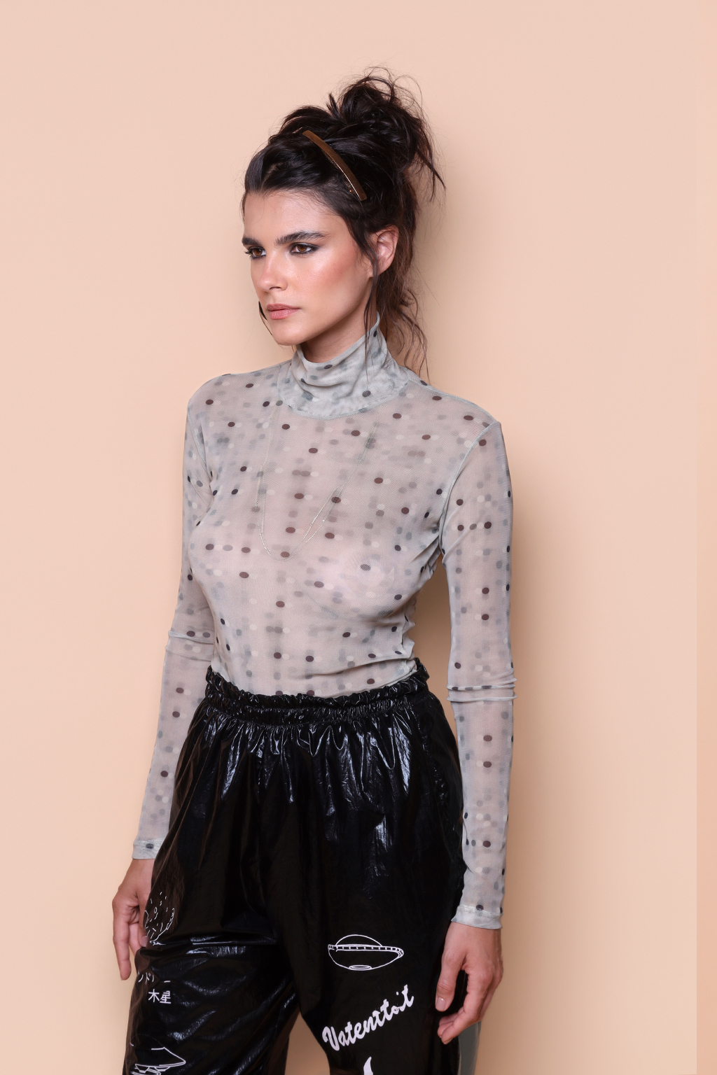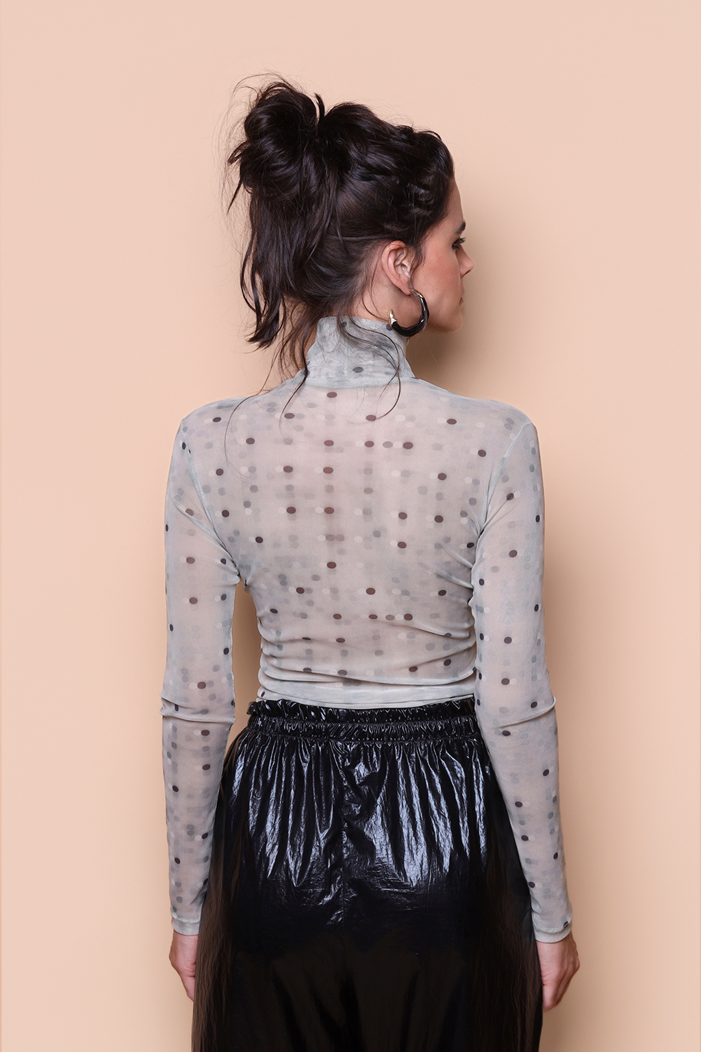 Blusa gola alta manga longa tule estampada Polka. A modelo veste tamanho P.
