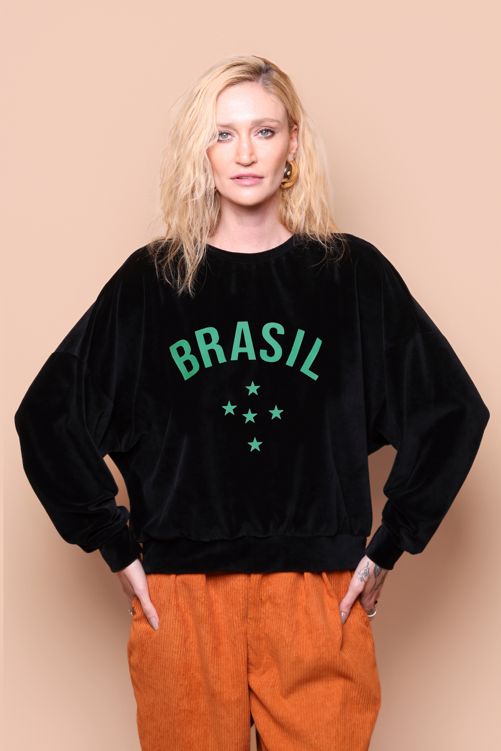 O blusão curto plush é confeccionado em malha de tecido similar à pelúcia, sendo ótimo para dias mais frios, proporcionando um toque agradável e sensação de conforto. Além disso, tem como estampa o nome do Brasil acima do Cruzeiro do Sul, constelação facilmente reconhecível, presente na bandeira do nosso país. O Cruzeiro do Sul aparece de forma invertida na bandeira do Brasil em relação à visão do céu, de forma que as estrelas da bandeira retratam a posição astronômica exata do céu do Rio de Janeiro, capital do Brasil, no dia 15 de novembro de 1889, data da proclamação da República do Brasil.