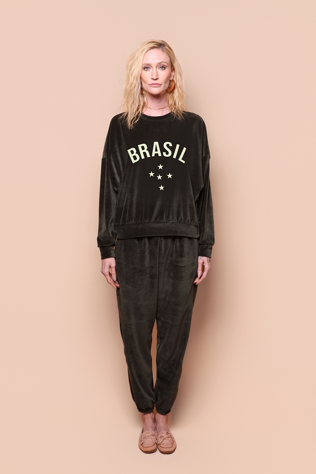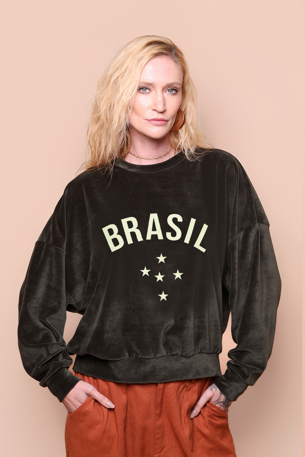 O blusão curto plush é confeccionado em malha de tecido similar à pelúcia, sendo ótimo para dias mais frios, proporcionando um toque agradável e sensação de conforto. Além disso, tem como estampa o nome do Brasil acima do Cruzeiro do Sul, constelação facilmente reconhecível, presente na bandeira do nosso país. O Cruzeiro do Sul aparece de forma invertida na bandeira do Brasil em relação à visão do céu, de forma que as estrelas da bandeira retratam a posição astronômica exata do céu do Rio de Janeiro, capital do Brasil, no dia 15 de novembro de 1889, data da proclamação da República do Brasil.