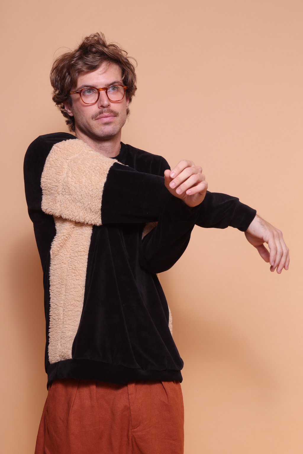 Blusão oversize plush preto Recortes Cava bege. A modelo mede 1,64 e o modelo mede 1,81 e ambos usam tamanho P.