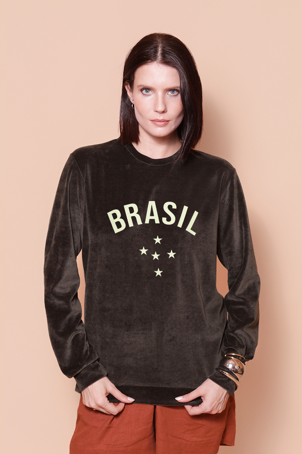 O blusão plush é confeccionado em malha de tecido similar à pelúcia, sendo ótimo para dias mais frios, proporcionando um toque agradável e sensação de conforto. Além disso, tem como estampa o nome do Brasil acima do Cruzeiro do Sul, constelação facilmente reconhecível, presente na bandeira do nosso país. O Cruzeiro do Sul aparece de forma invertida na bandeira do Brasil em relação à visão do céu, de forma que as estrelas da bandeira retratam a posição astronômica exata do céu do Rio de Janeiro, capital do Brasil, no dia 15 de novembro de 1889, data da proclamação da República do Brasil.