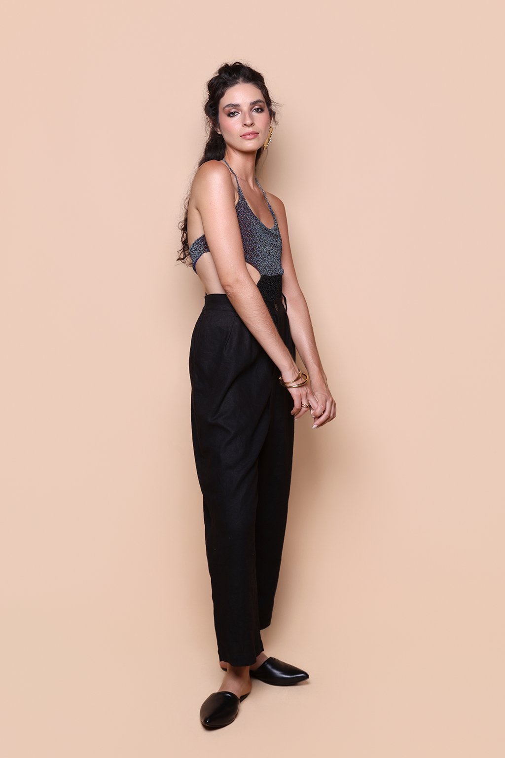Body recorte lateral lurex furta-cor e preto. A modelo veste tamanho P.