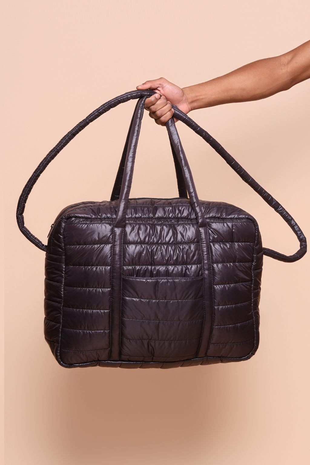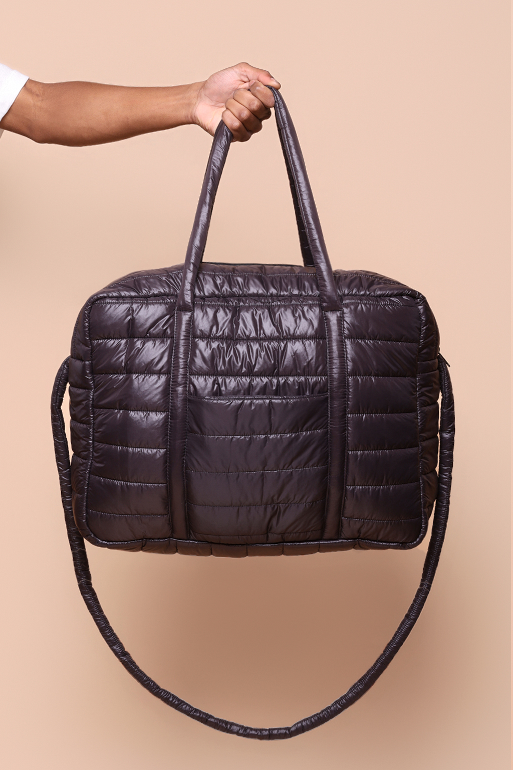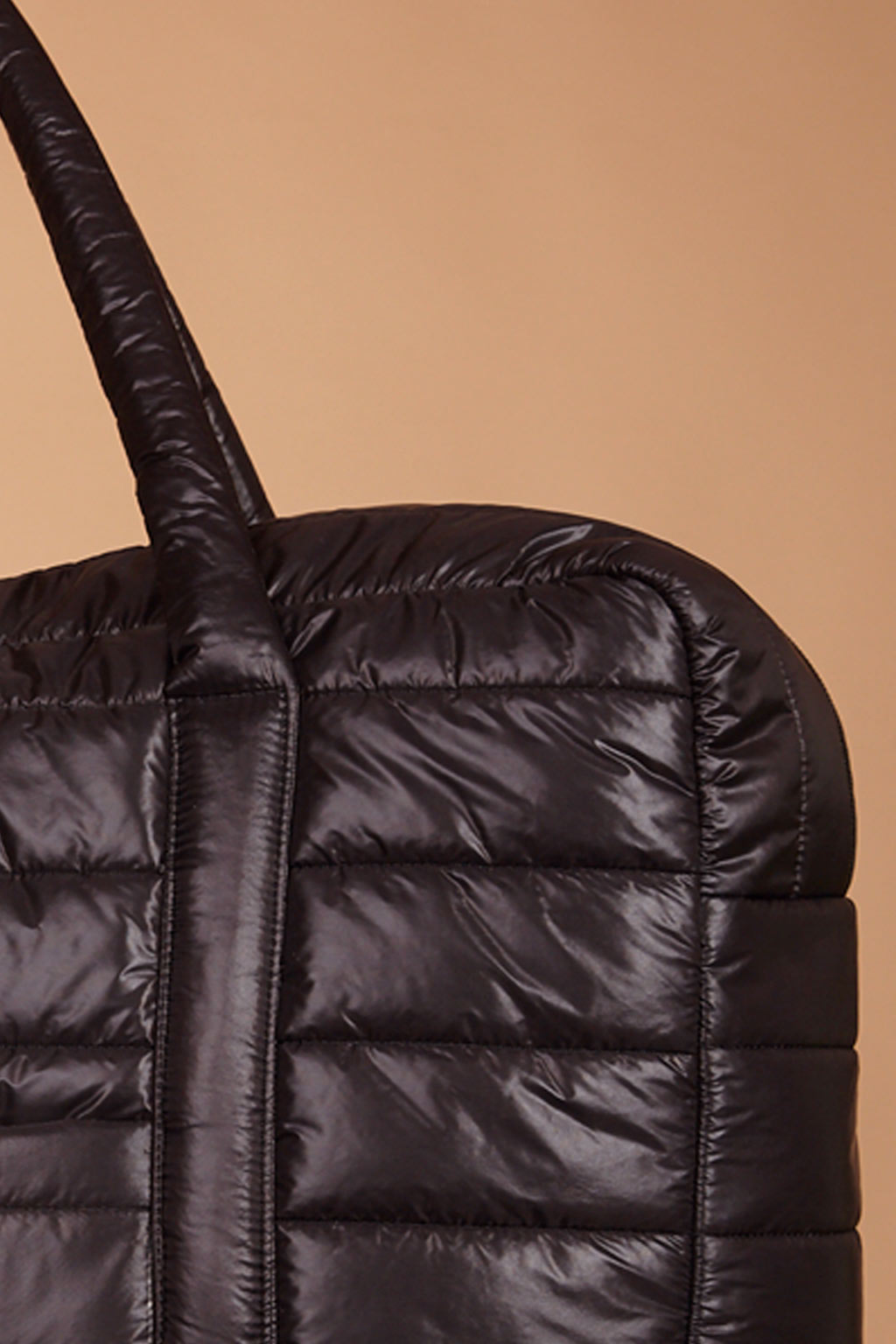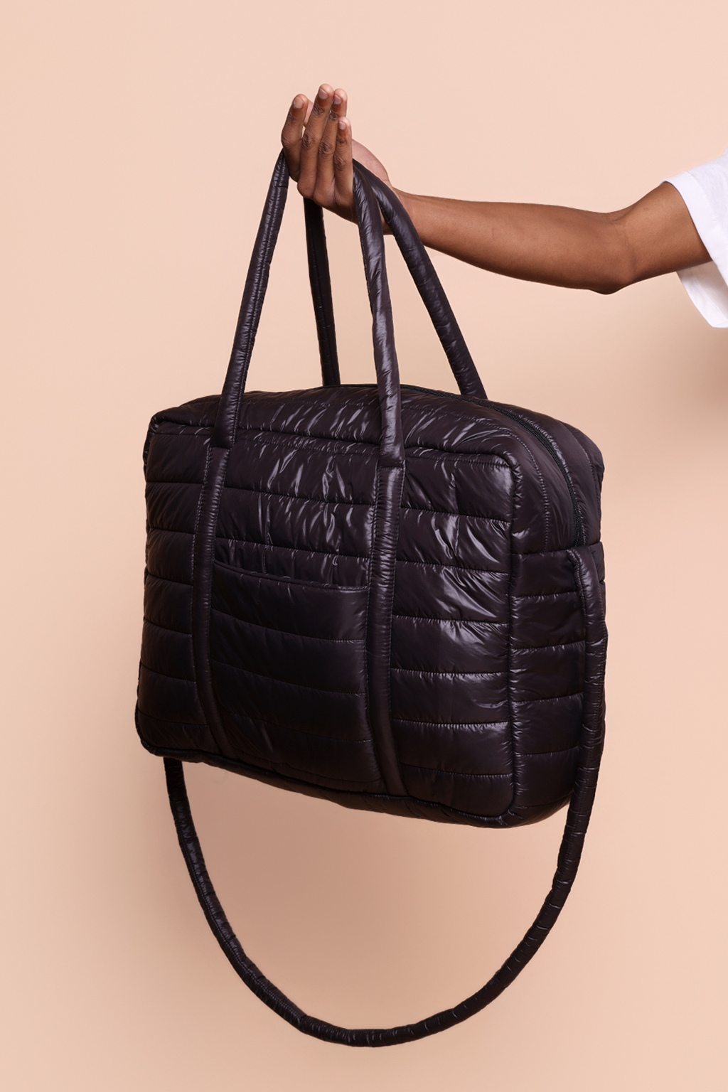 A bolsa de viagem da AMP é feita em tecido matelassê de nylon, atribuindo resistência e leveza à peça. Também apresenta acabamento em cirê, dando brilho ao tecido. A bolsa de viagem puffer conta com um bolso lateral grande, de 20 x 21 cm, para garantir conforto e praticidade . Apresenta alças fixas de mão e fechamento em zíper.