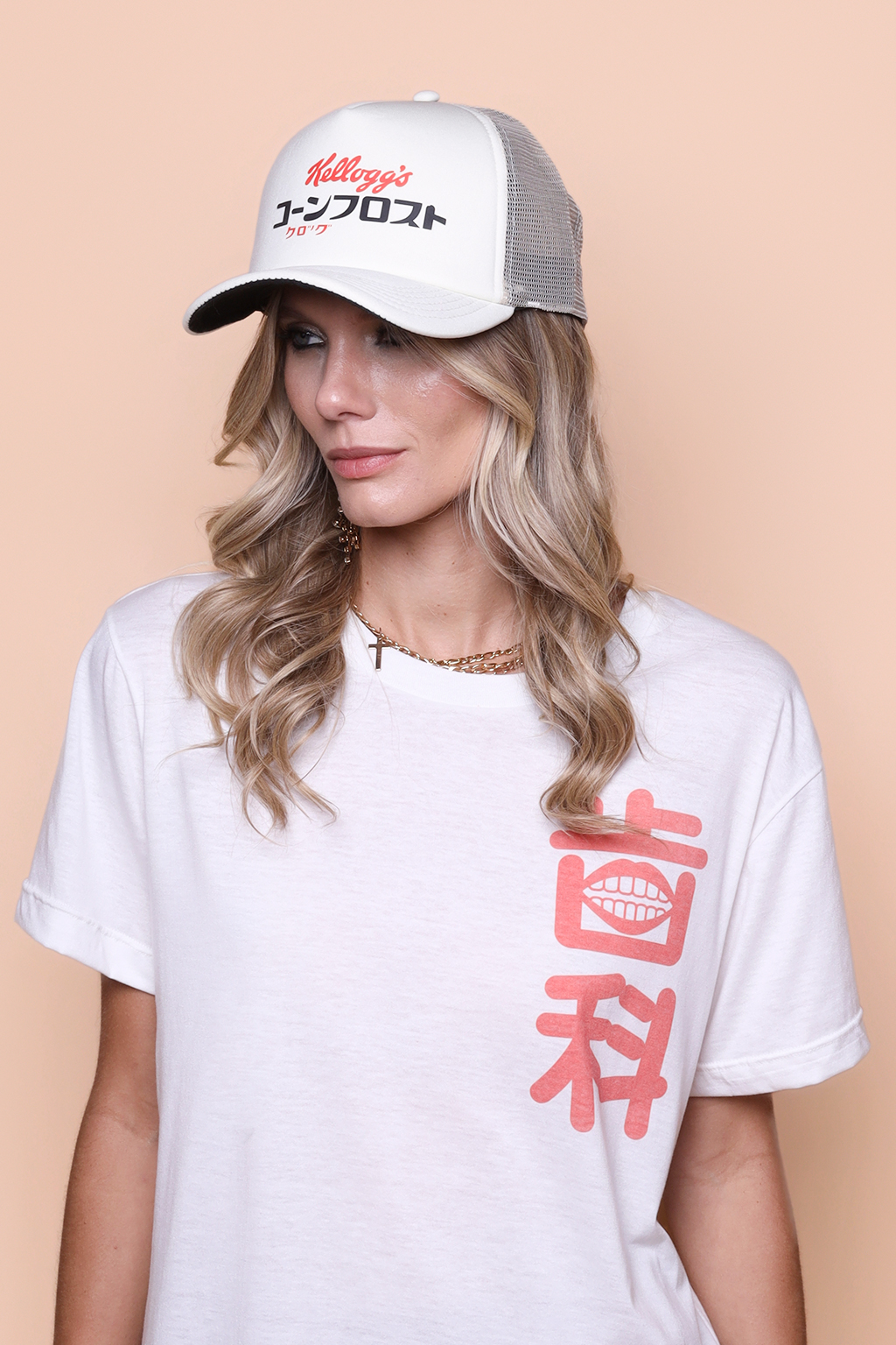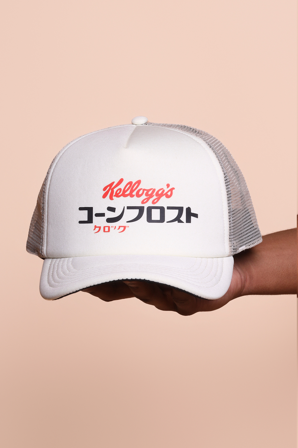 O boné trucker Kellogg’s é confeccionado na modelagem trucker, com enchimento na frente e tela atrás. Além disso, tem como estampa o logo da Kellogg’s, empresa estadunidense do setor alimentício, atualmente sob o nome de Kellanova, após rebranding em 2023. O famoso cereal de flocos de milho (corn flakes) surgiu de experimentos com farinhas “deixadas de molho”, tendo o processo de fabricação patenteado em 1896.