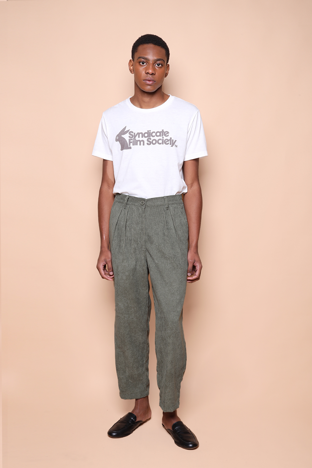 A calça alfaiataria AMP é produzida em malha com acabamento cotelê, que é parecido com o veludo, tendo um toque felpudo.