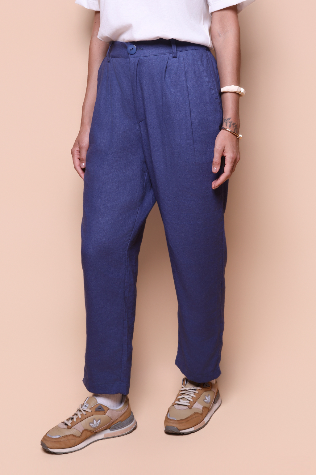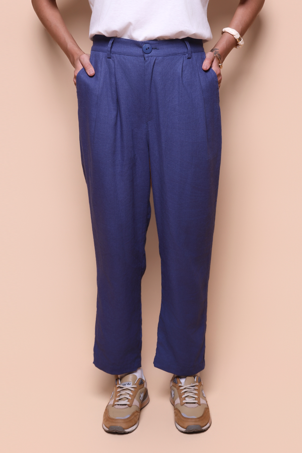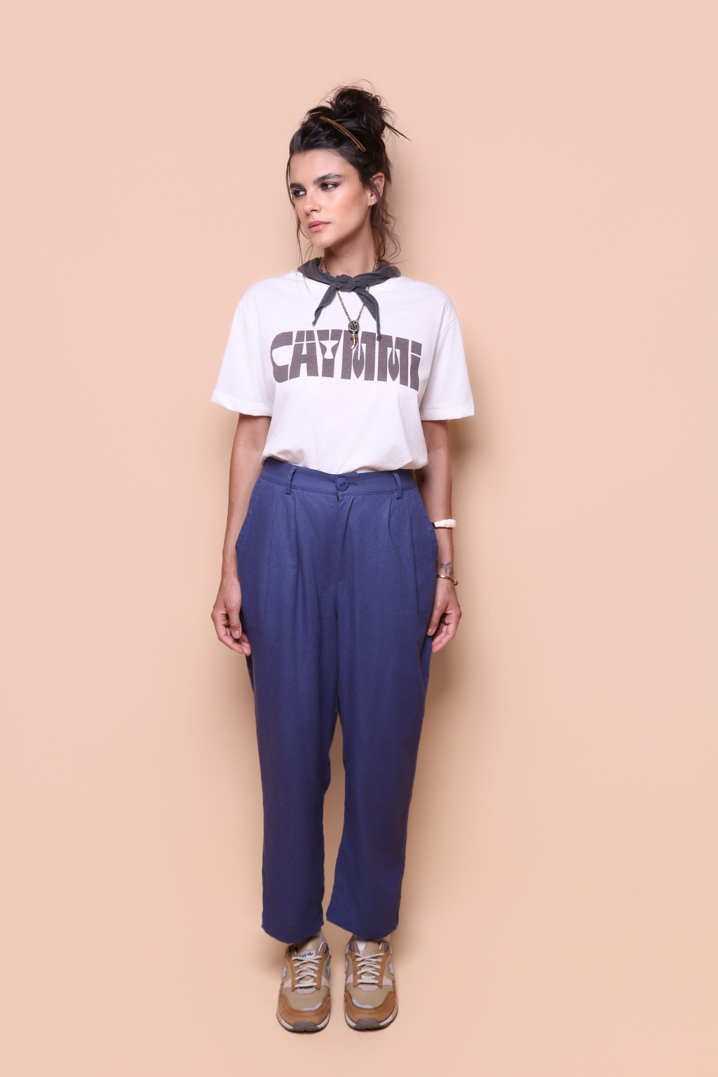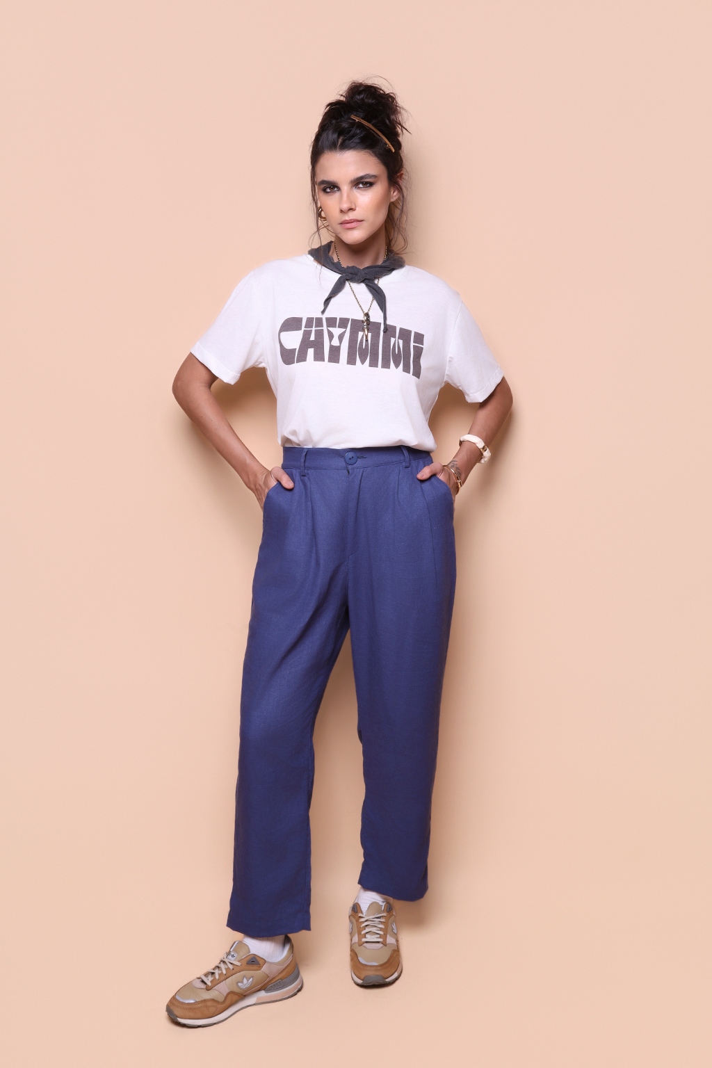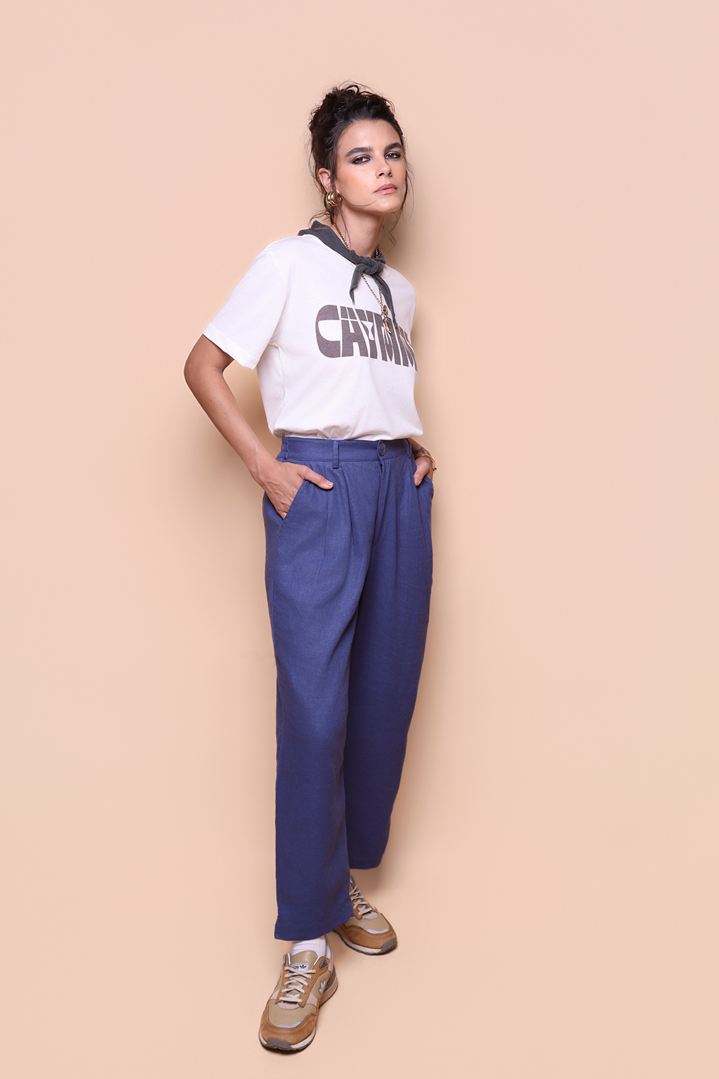 Calça alfaiataria linho azul. Ambos os modelos vestem tamanho P.