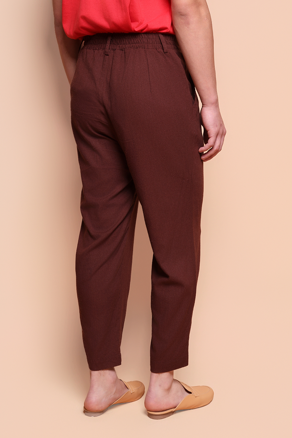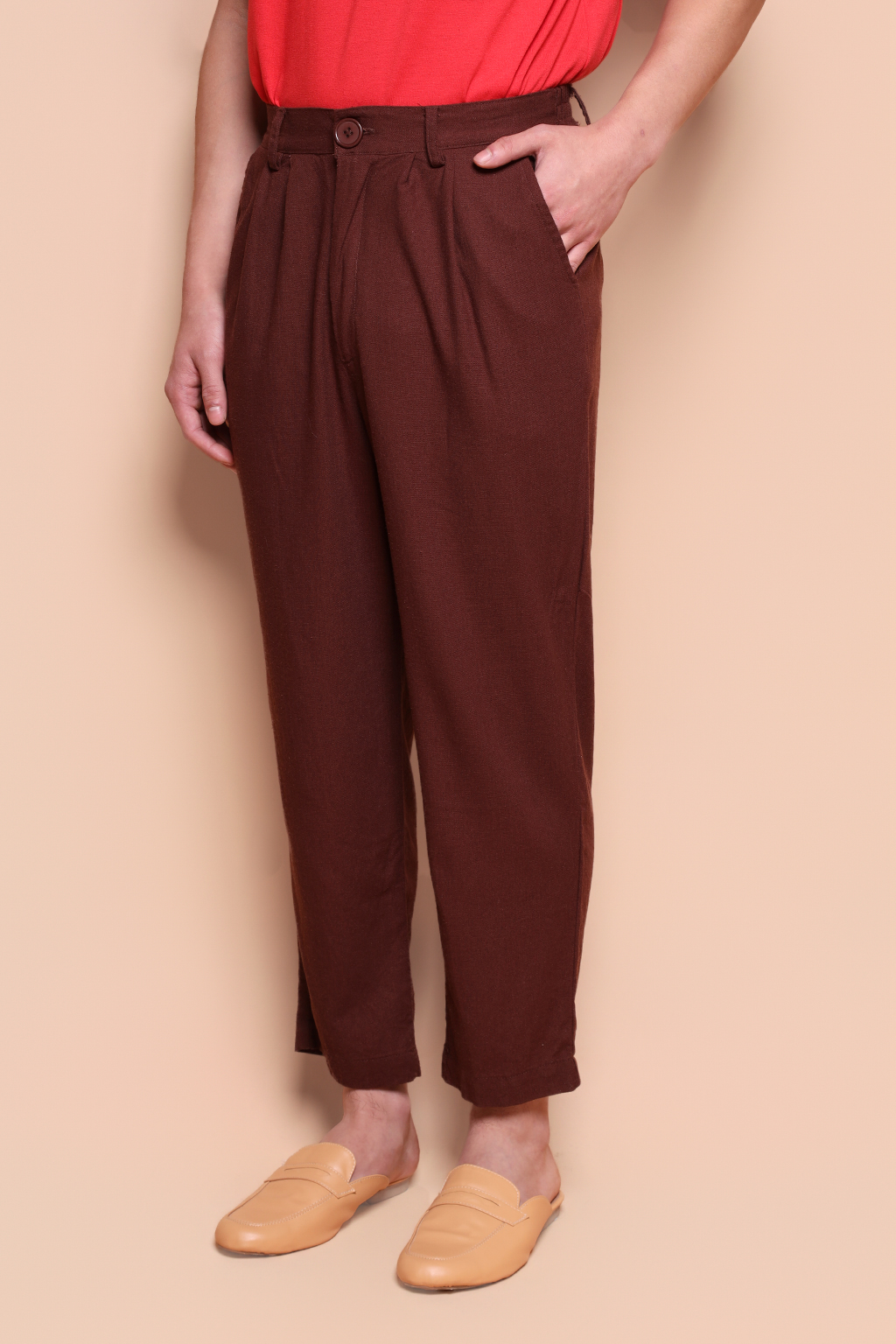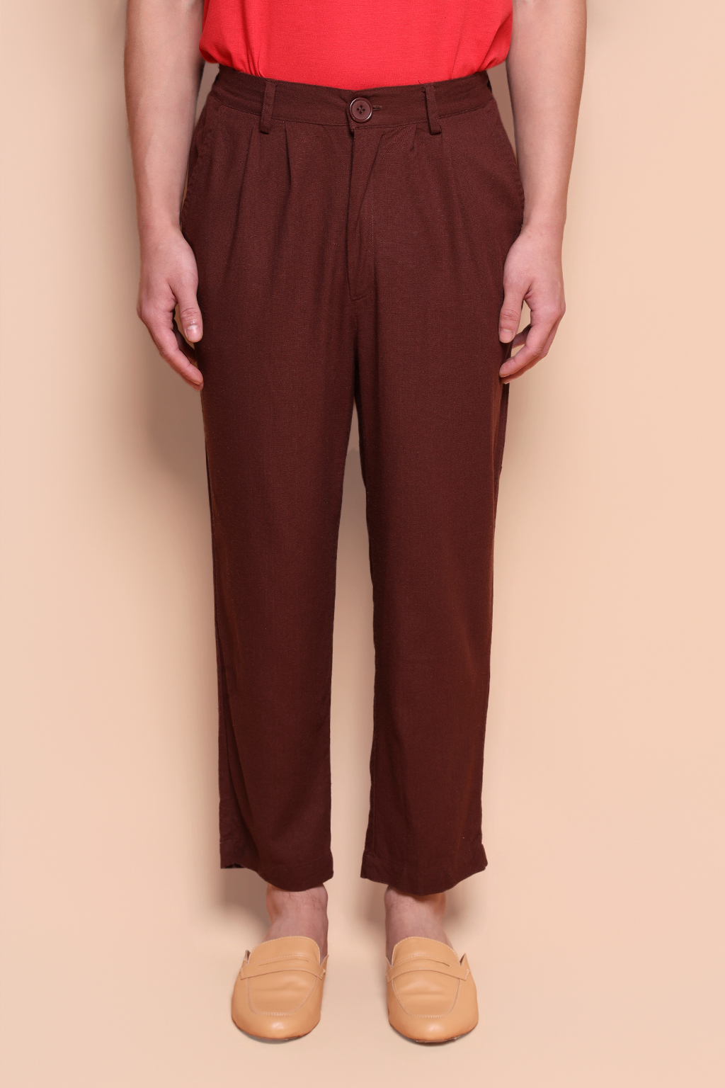 Calça alfaiataria linho marrom. A modelo mede 1,72 e usa tamanho P.