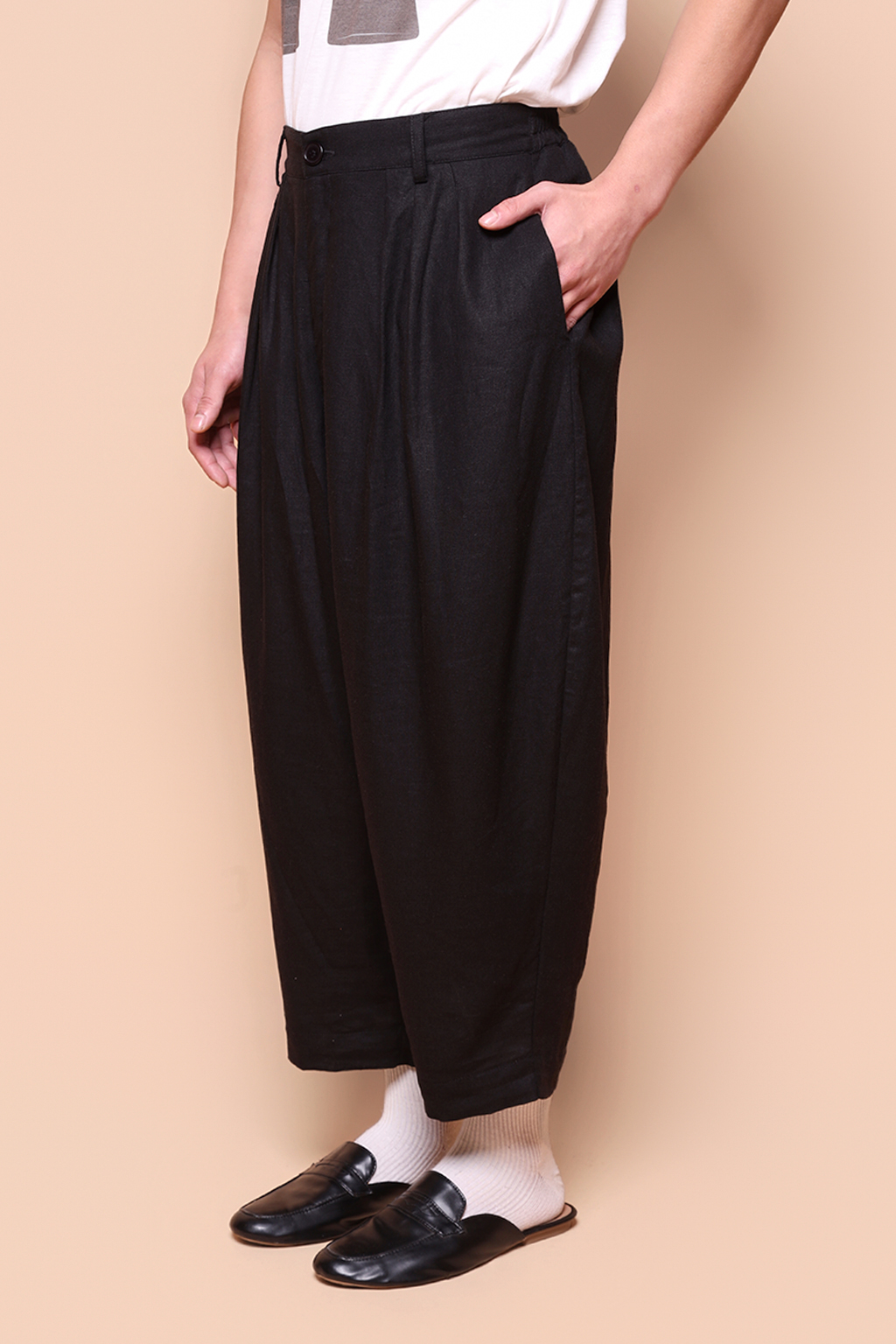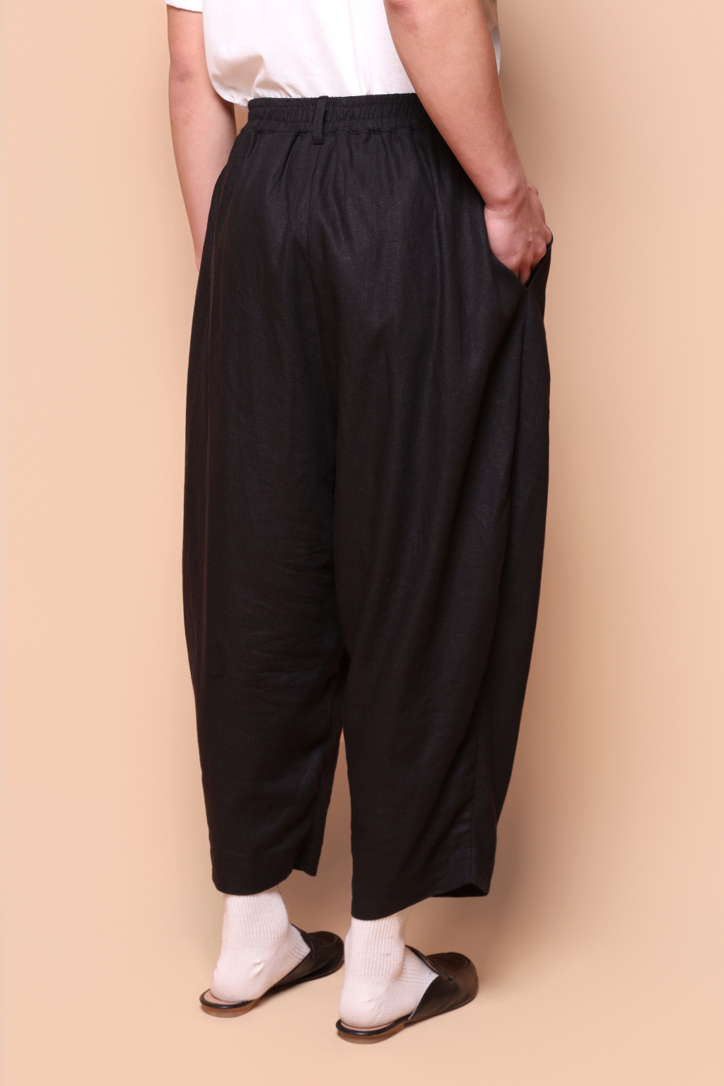 A calça ampla apresenta uma modelagem mais folgada, similar a uma calça saruel. Além disso, o linho dá leveza e resistência à peça.
