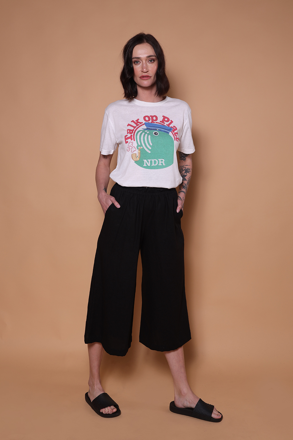 Calça pantacourt preta em linho. A modelo mede 1,82 e usa tamanho P.