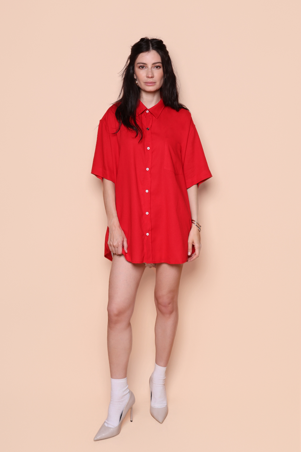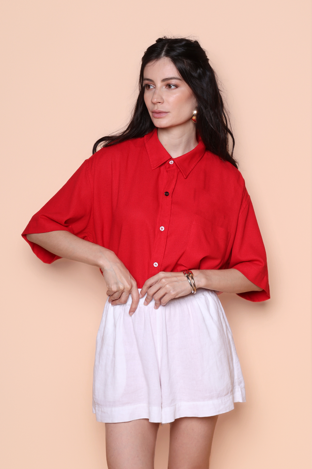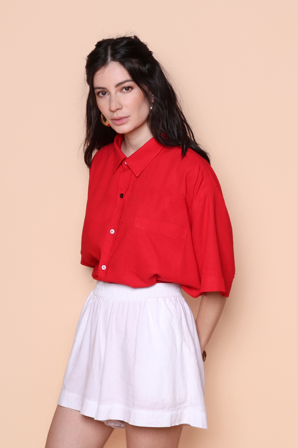 Camisa ampla linho vermelho. A modelo mede 1,72 e usa tamanho P.