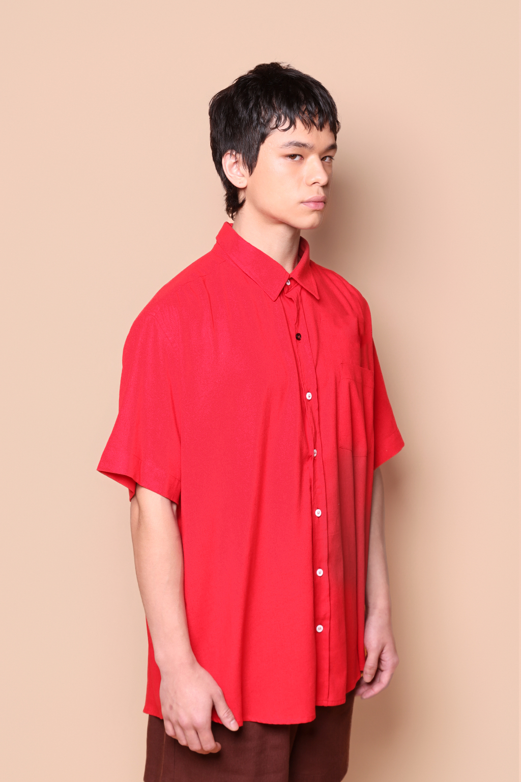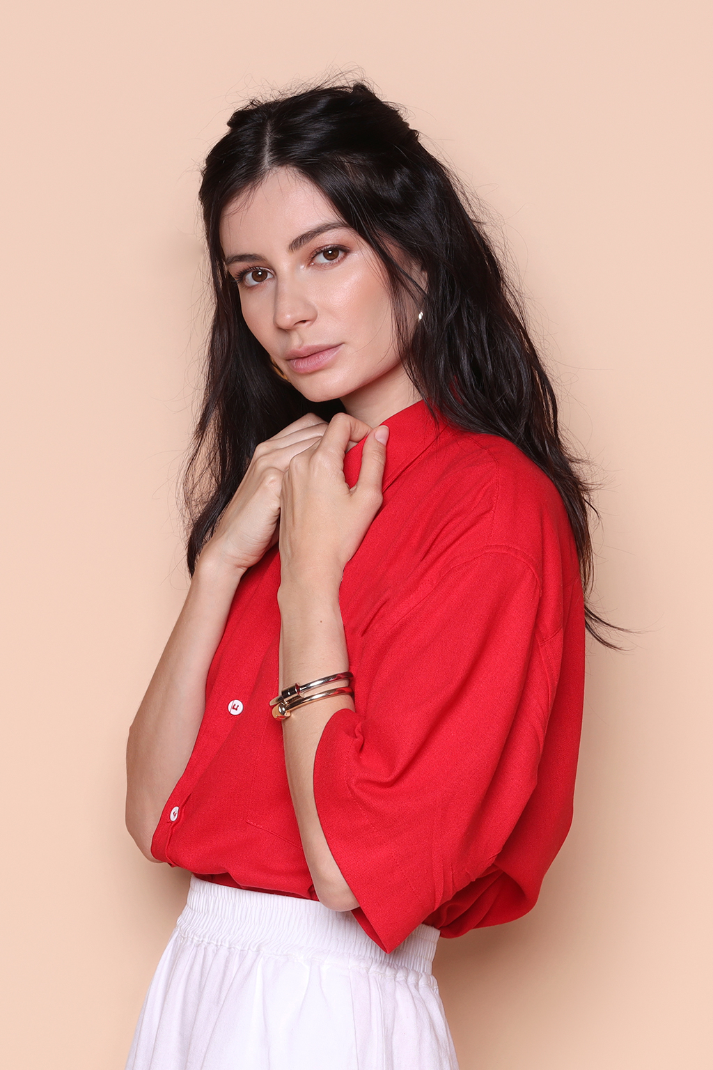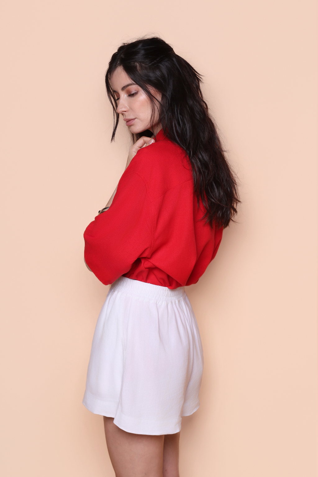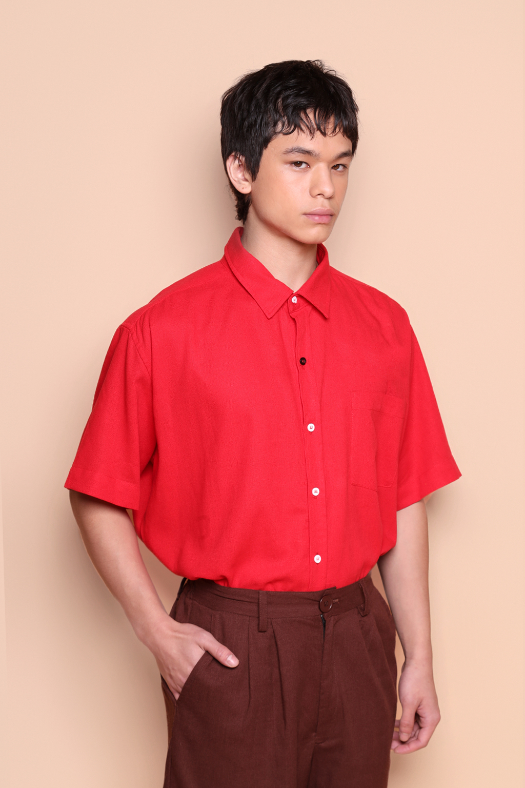 Camisa ampla linho vermelho. A modelo mede 1,72 e usa tamanho P.