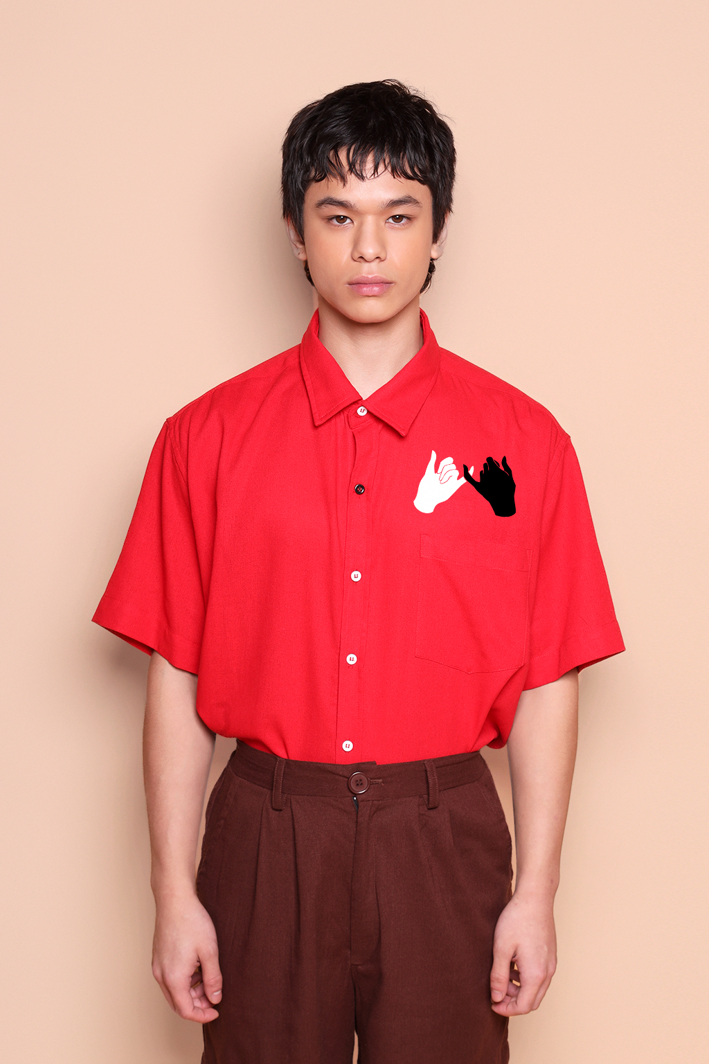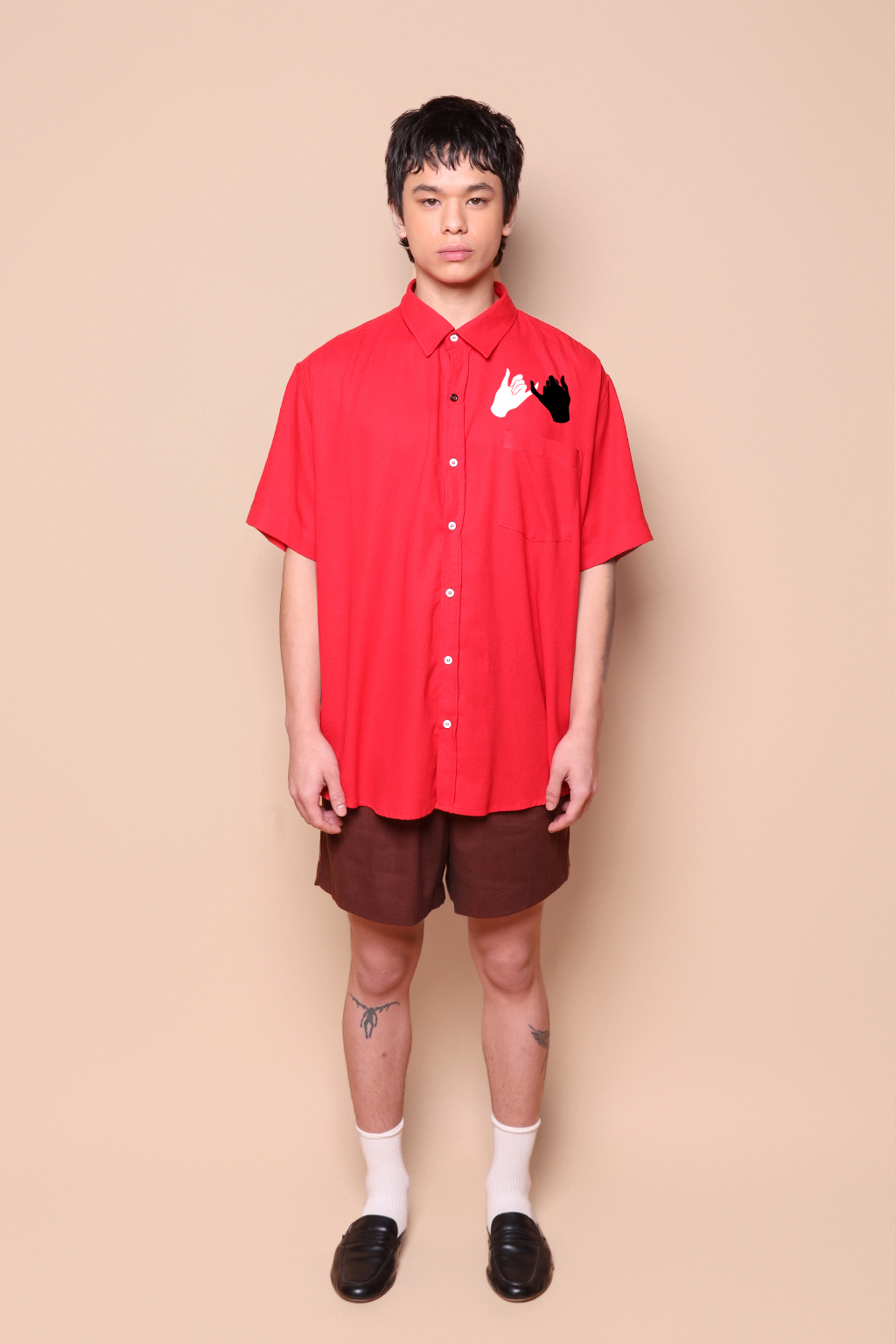 Camisa ampla linho vermelho Luvas. A modelo mede 1,72 e usa tamanho P.