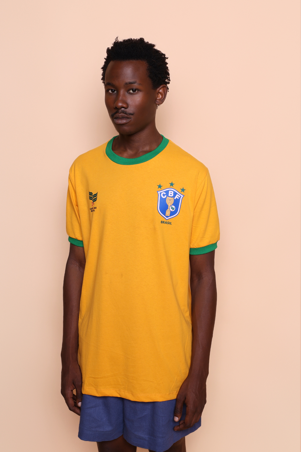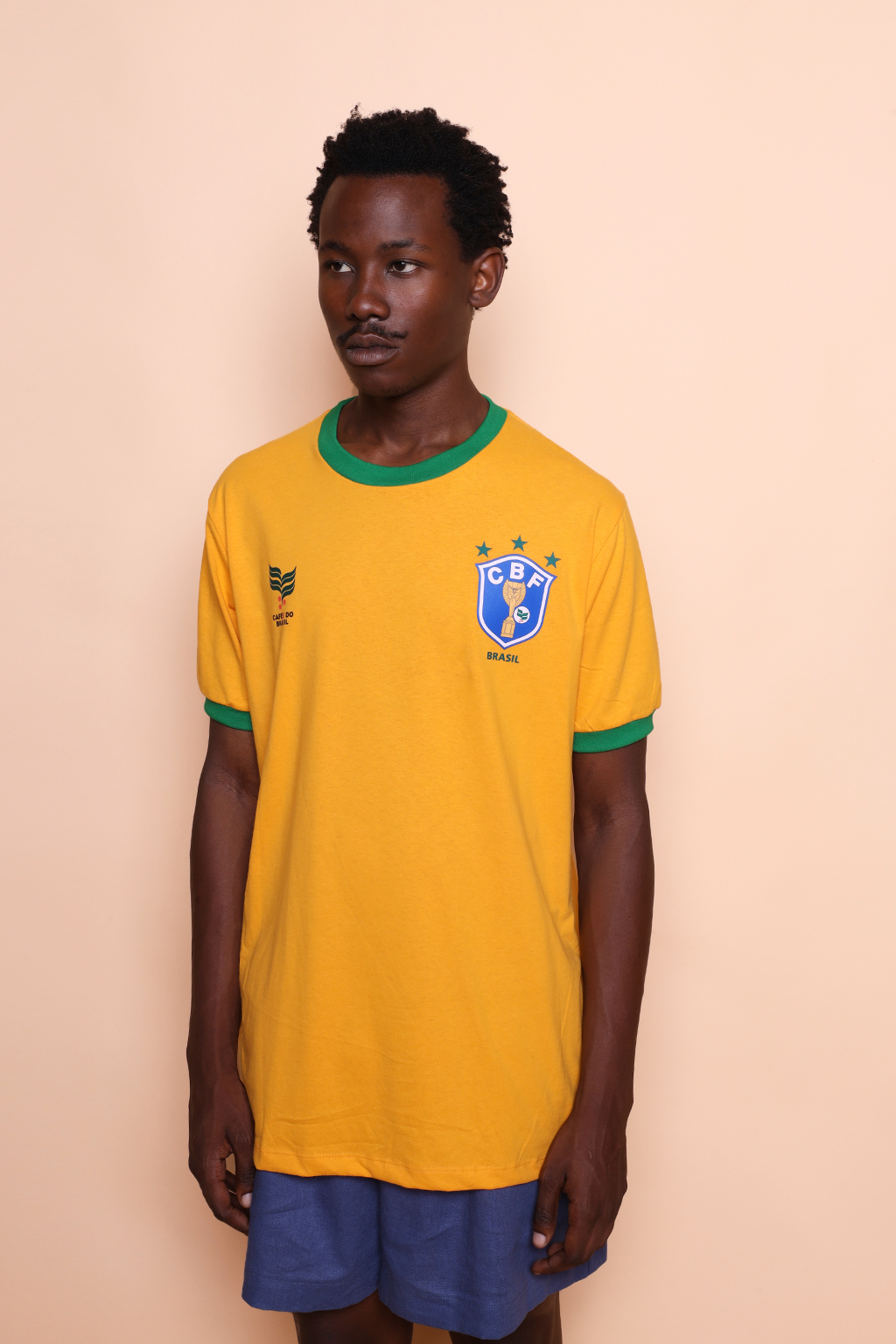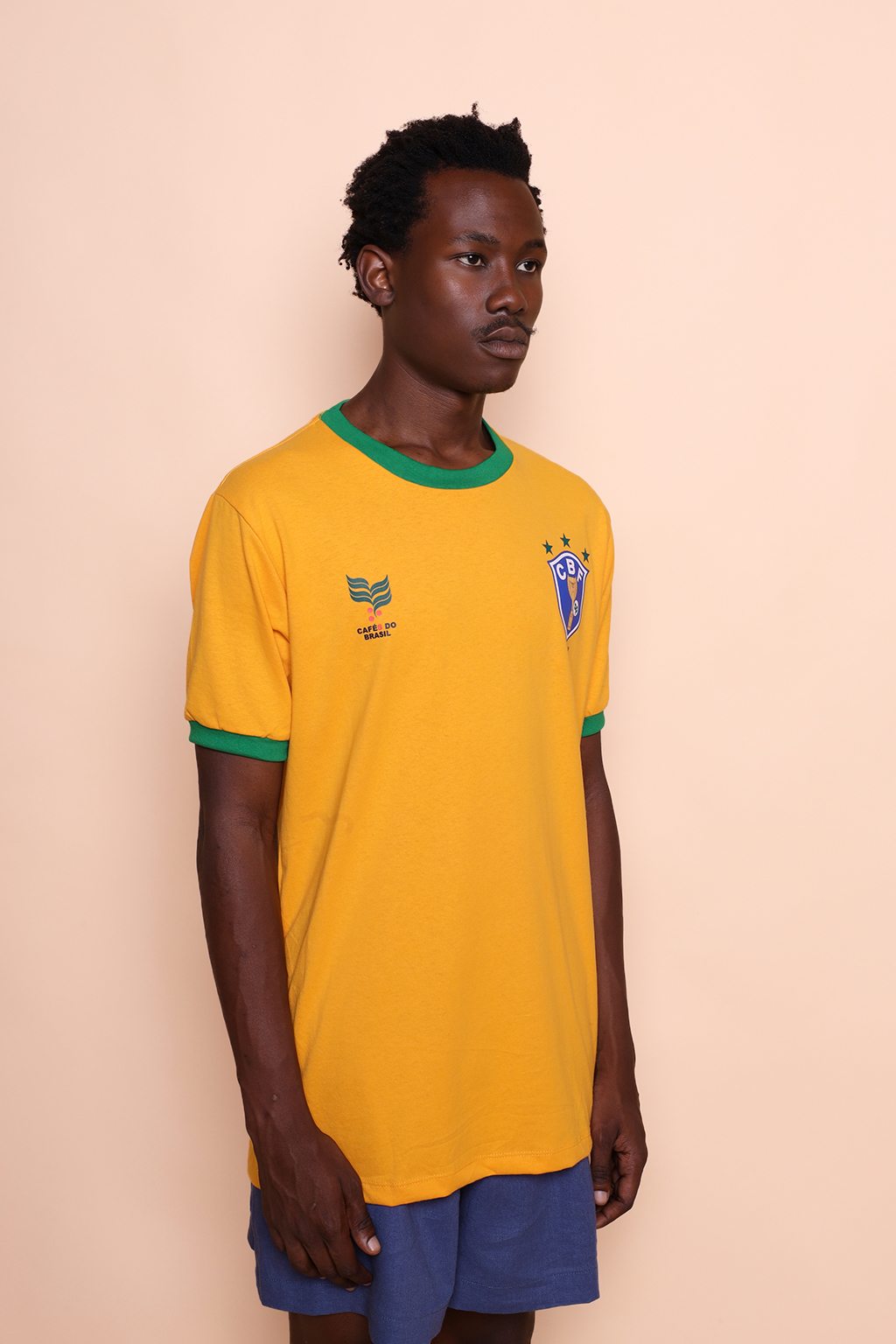 Camiseta algodão amarela Seleção de 82. Ambos os modelos vestem tamanho P.