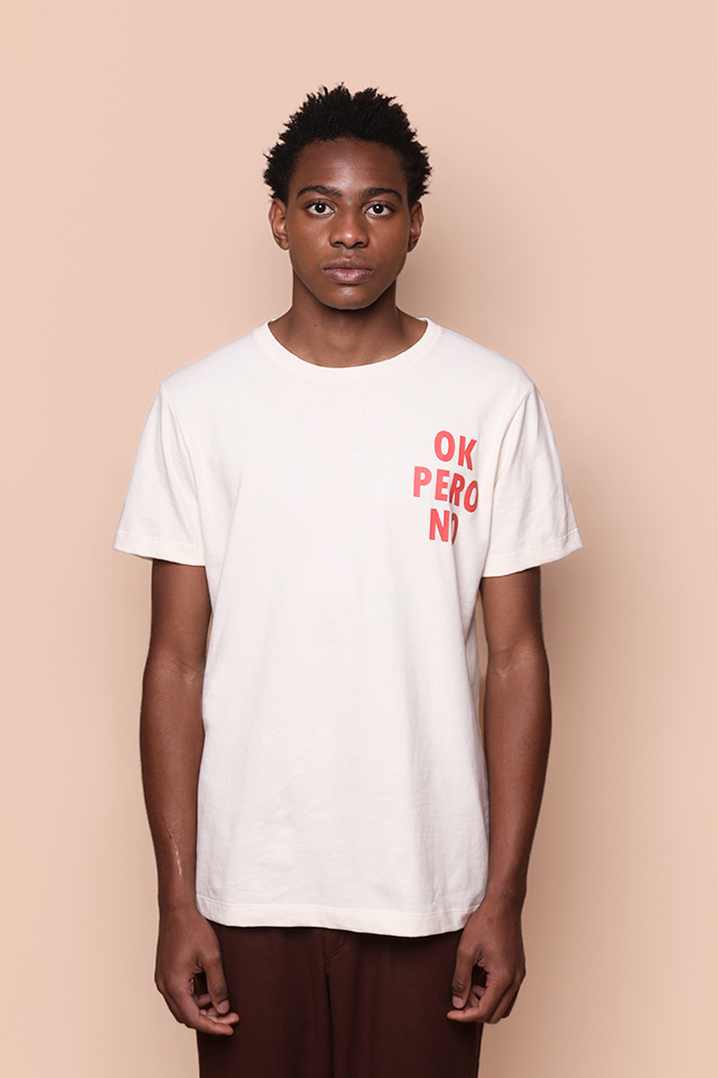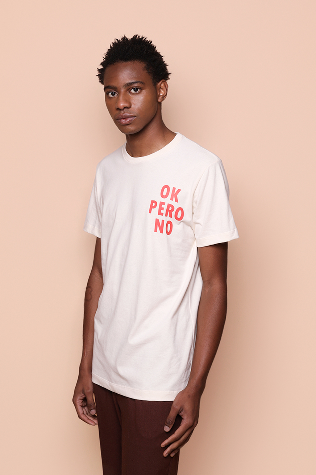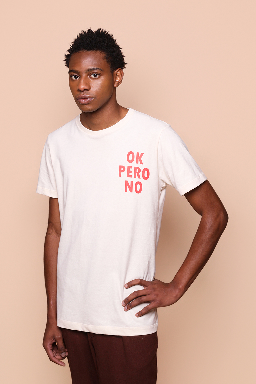 A camiseta Ok Pero No é uma peça unissex, com modelagem reta e manga curta, e é feita em tecido 100% algodão, que dá um toque macio e delicado à camiseta. Além disso, tem como estampa uma frase em espanhol localizada no peito, “Ok Pero No”, que significa “Ok porém não”.