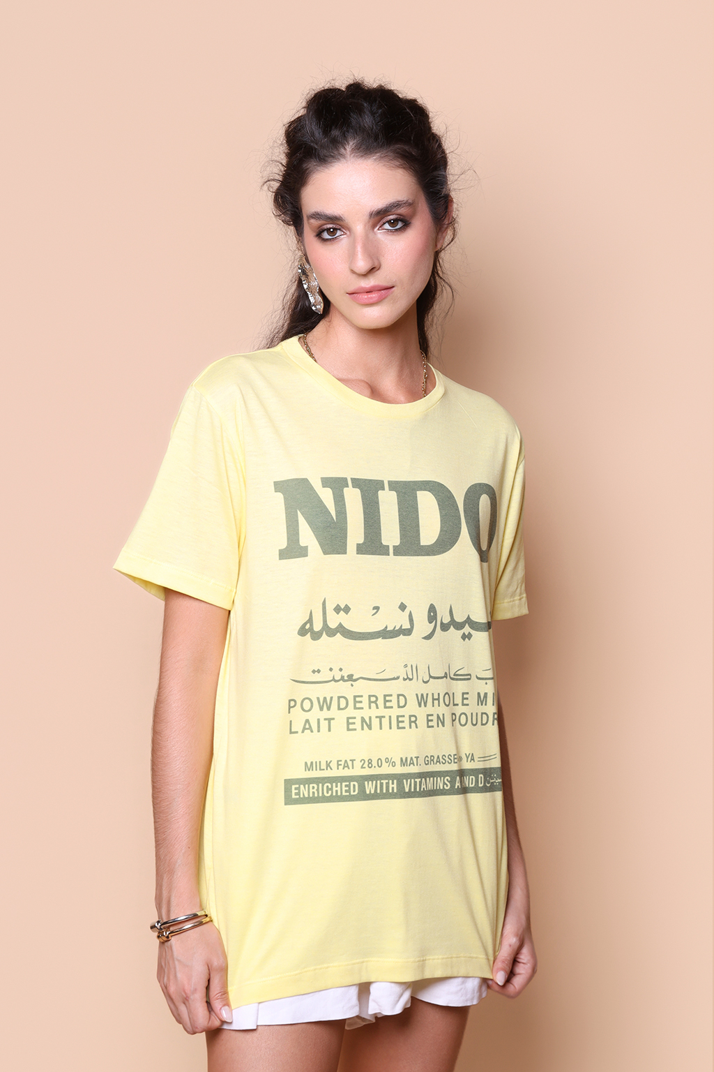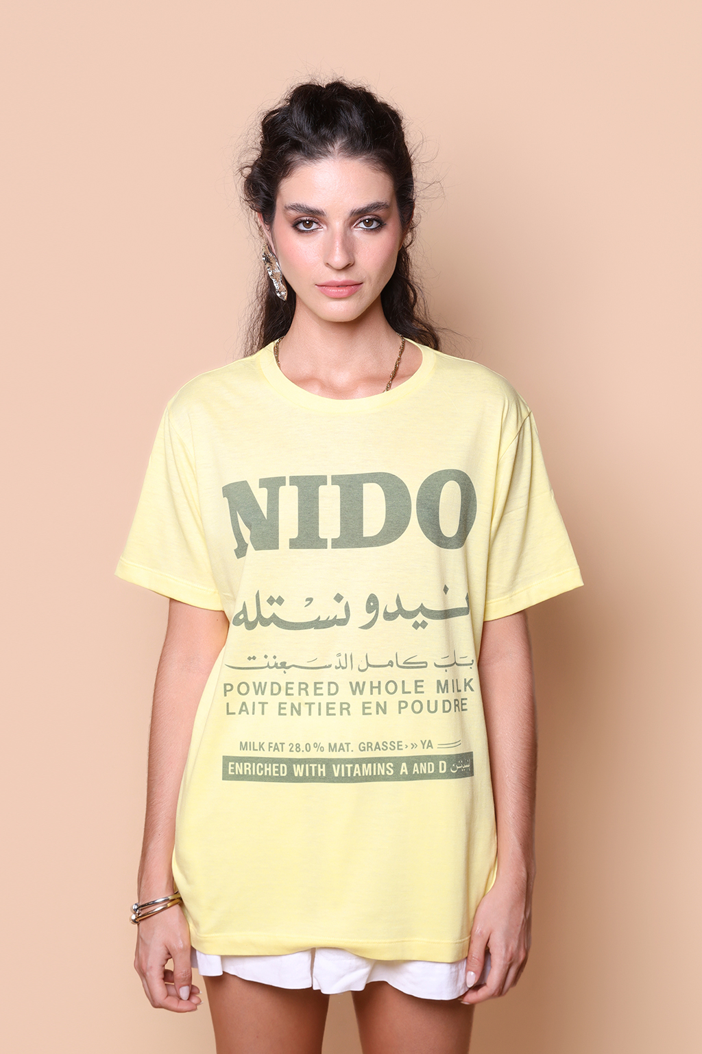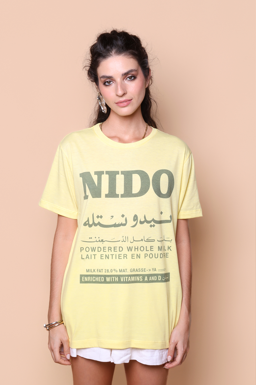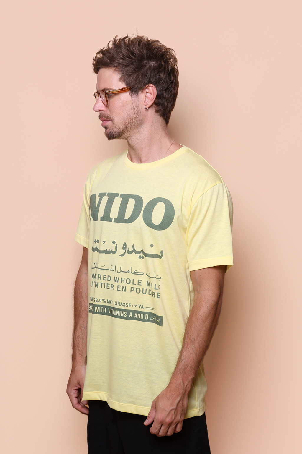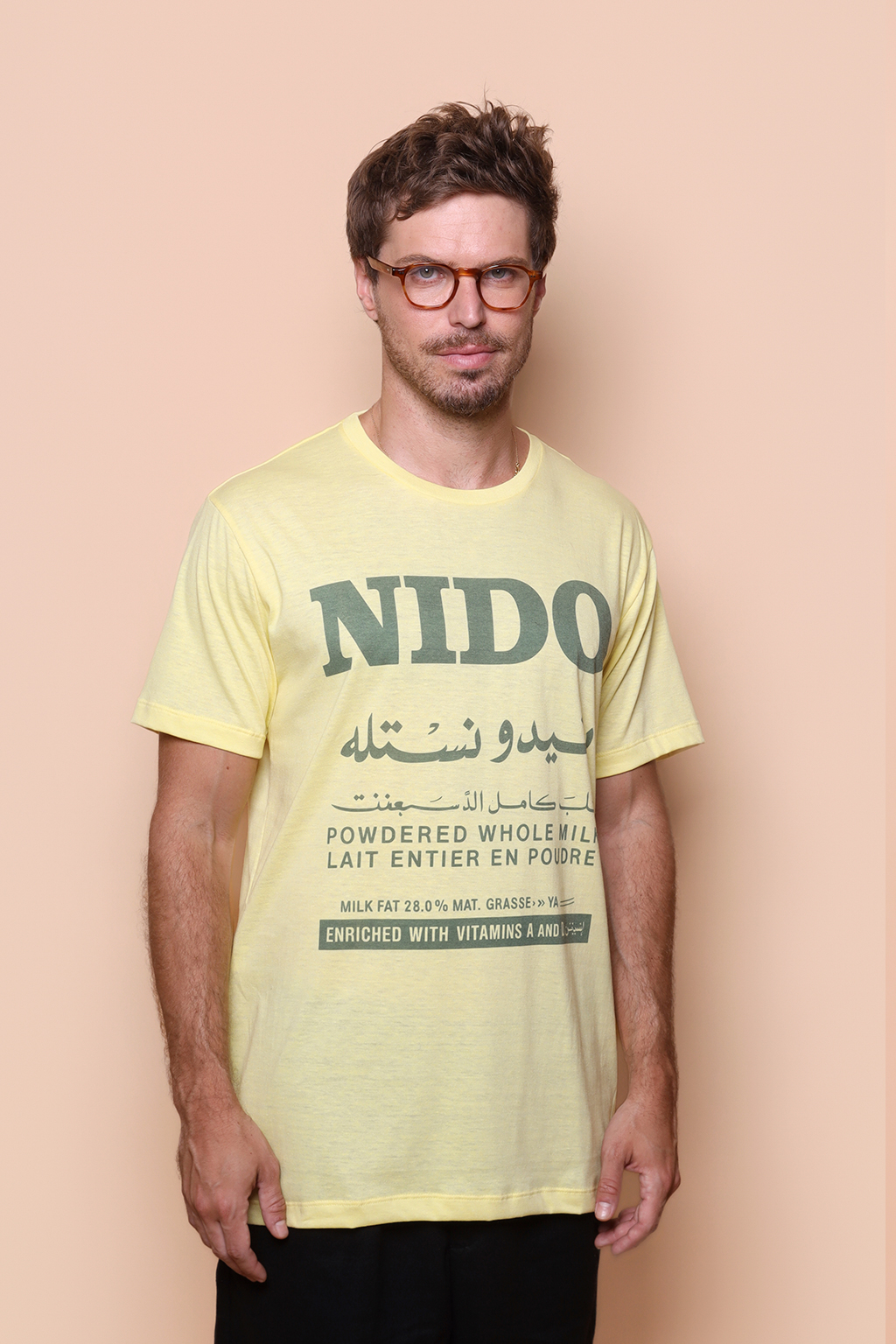 A camiseta Nido é confeccionada em tecido meia malha de algodão, dando um toque mais macio e agradável. Além disso, tem como estampa o rótulo em árabe do Nido, nome de exportação do que conhecemos aqui por leite Ninho, leite em pó da Nestlé.
