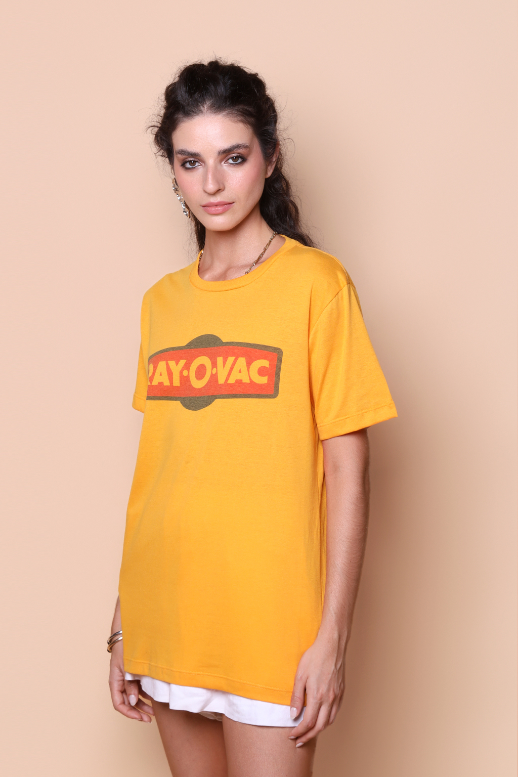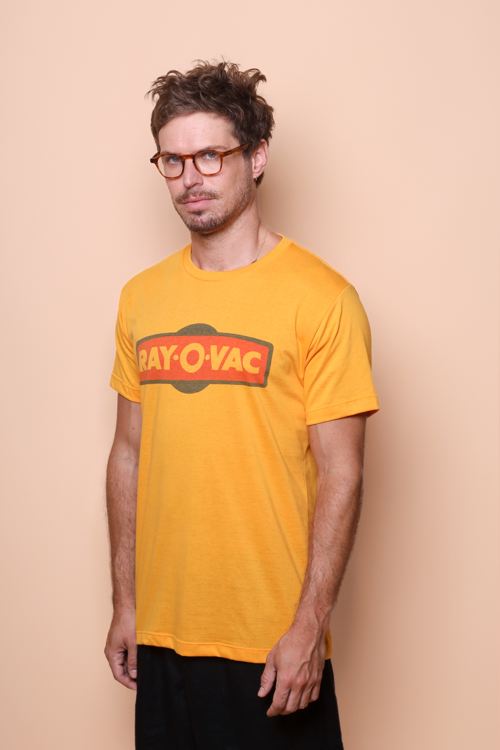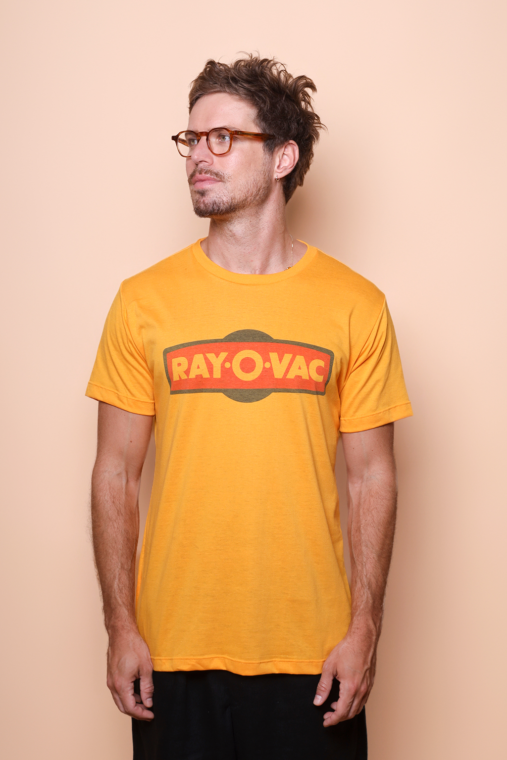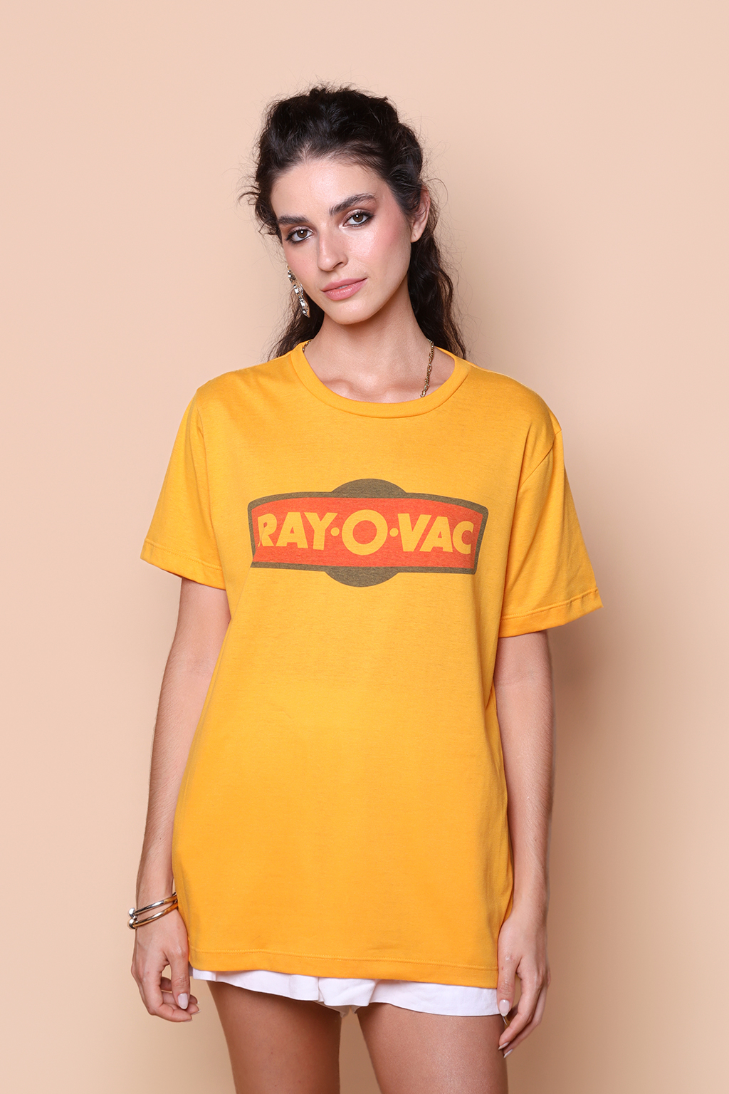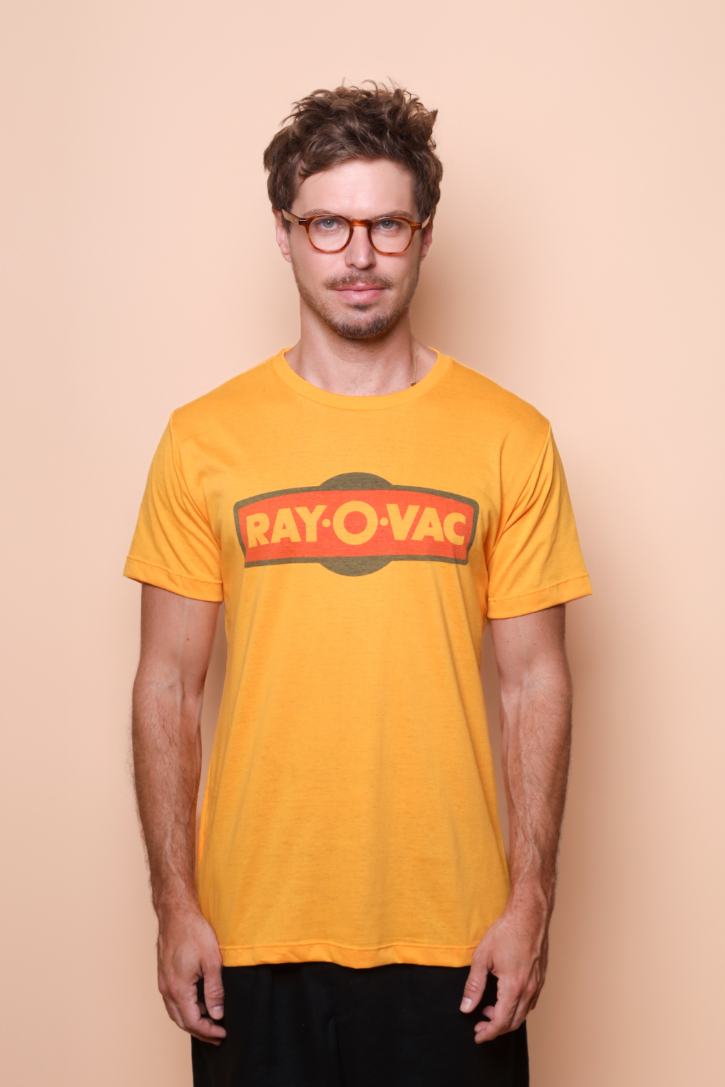 Camiseta amarela estampada Ray-O-Vac. Ambos modelos vestem tamanho P.