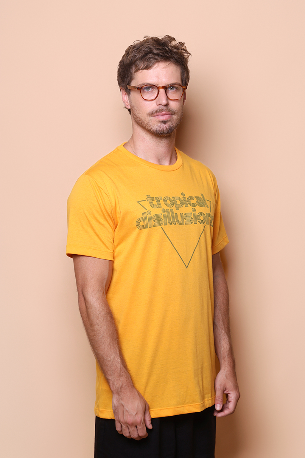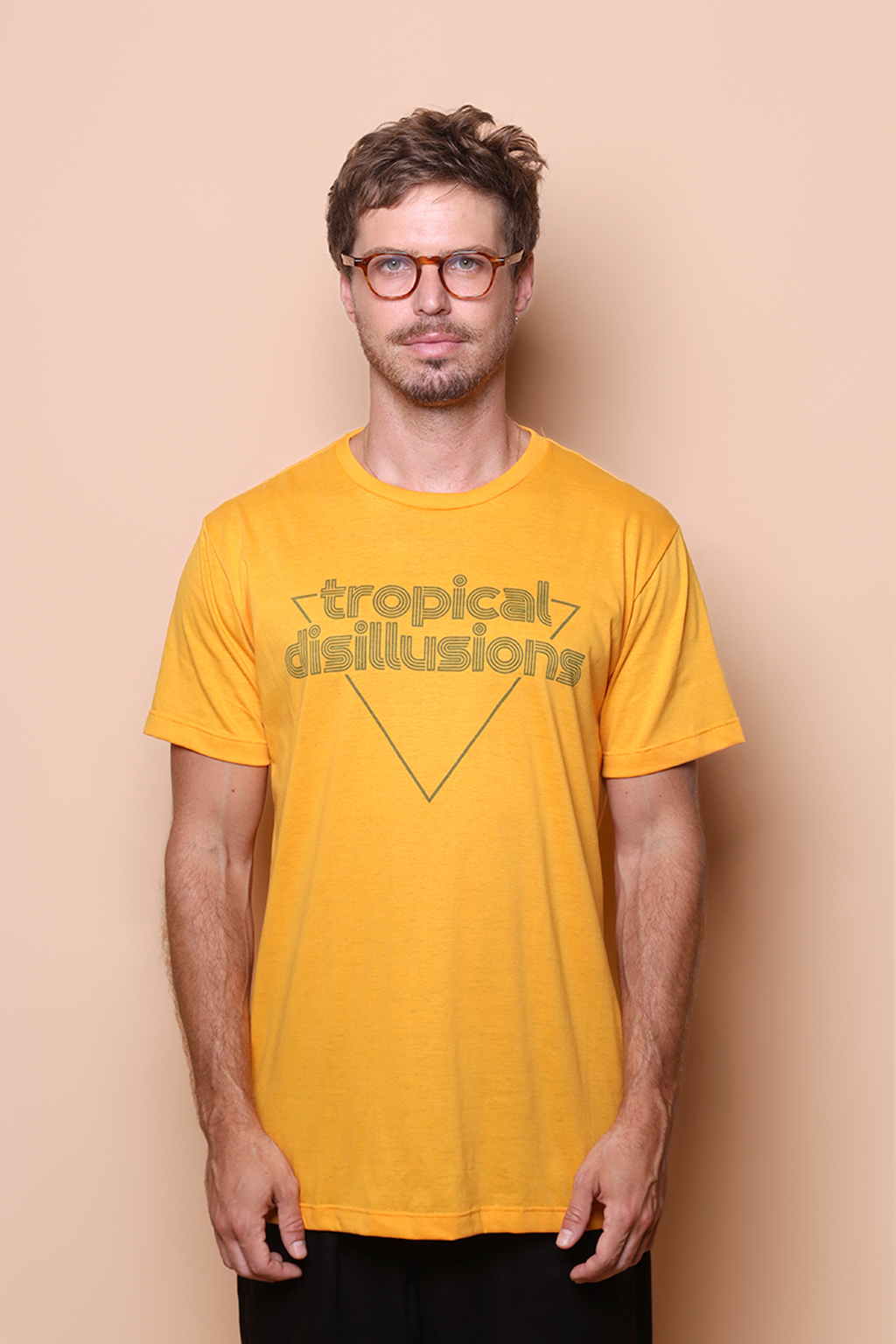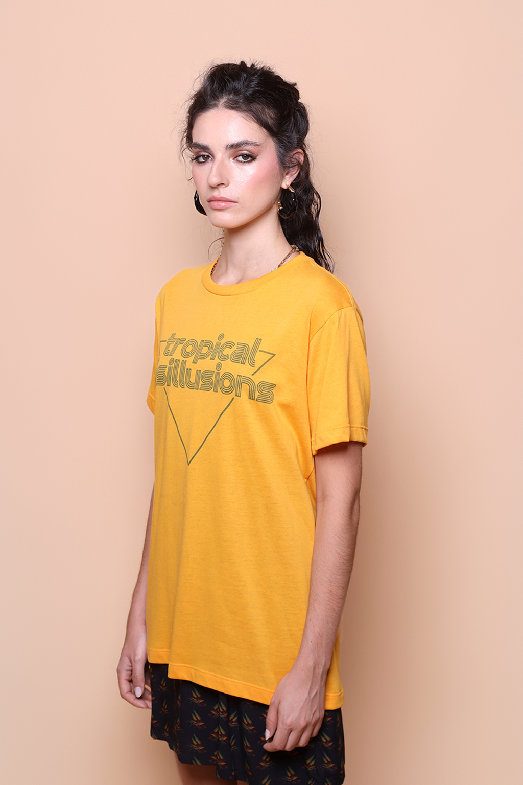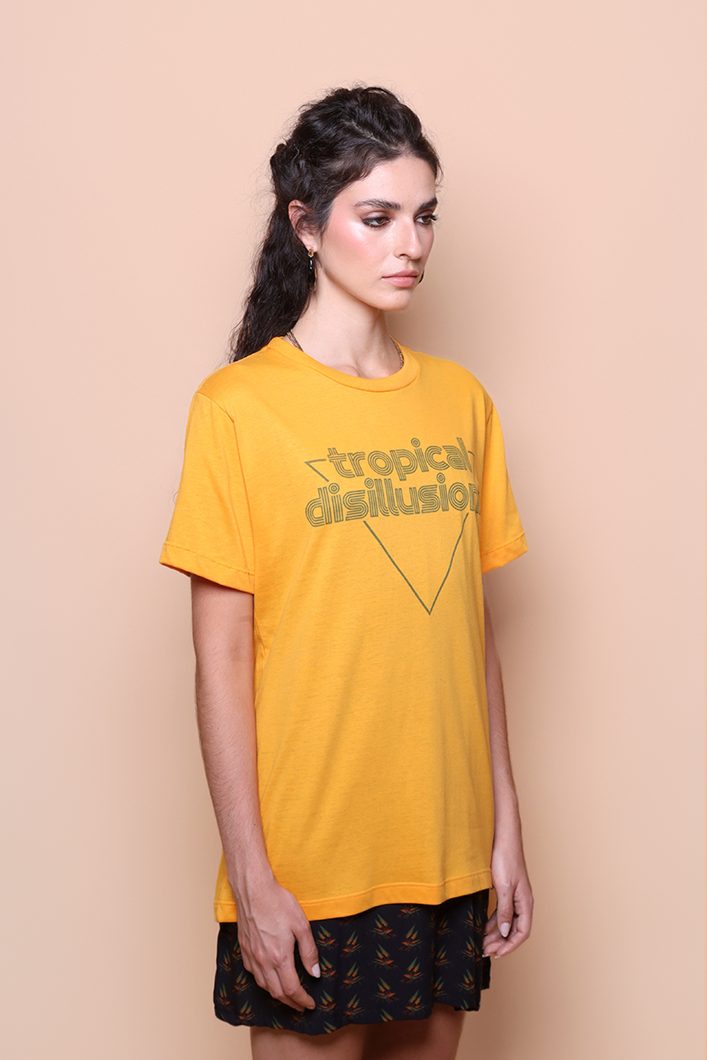 Camiseta amarela estampada Tropical Disillusions. A modelo mede 1,72 e o modelo mede 1,78 e ambos usam tamanho P.
