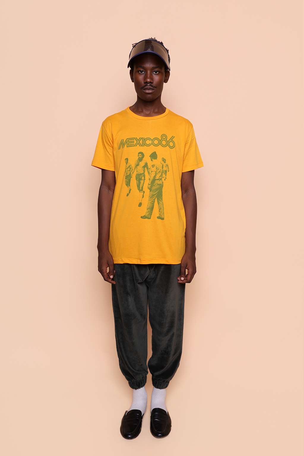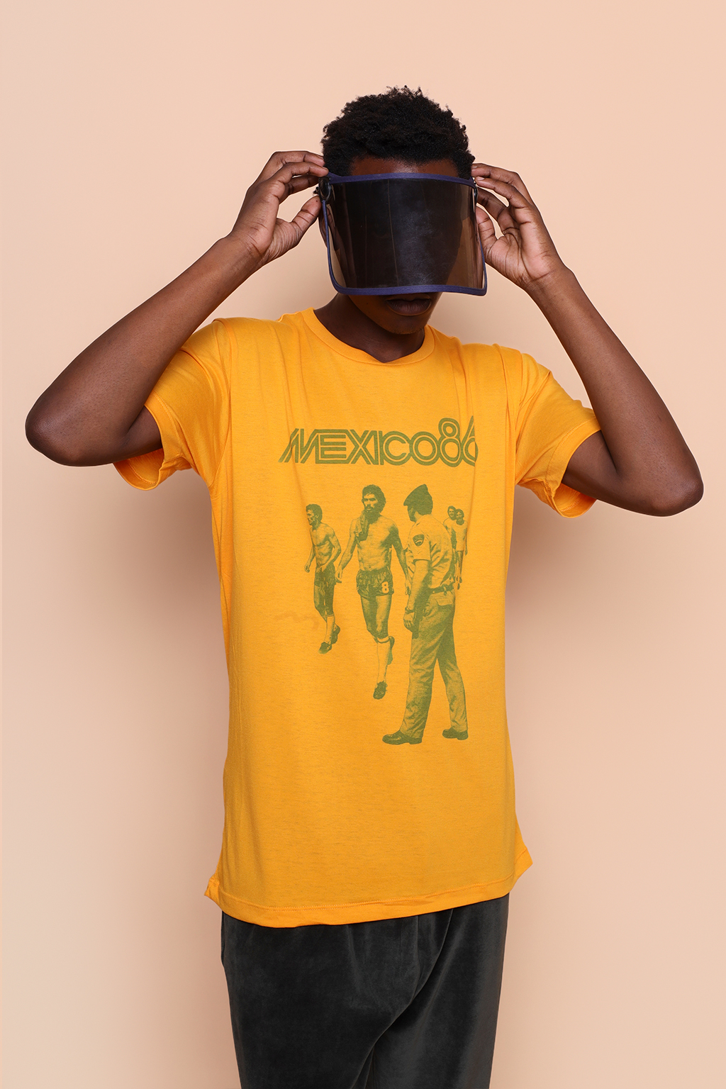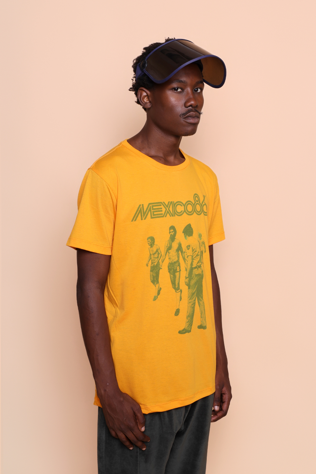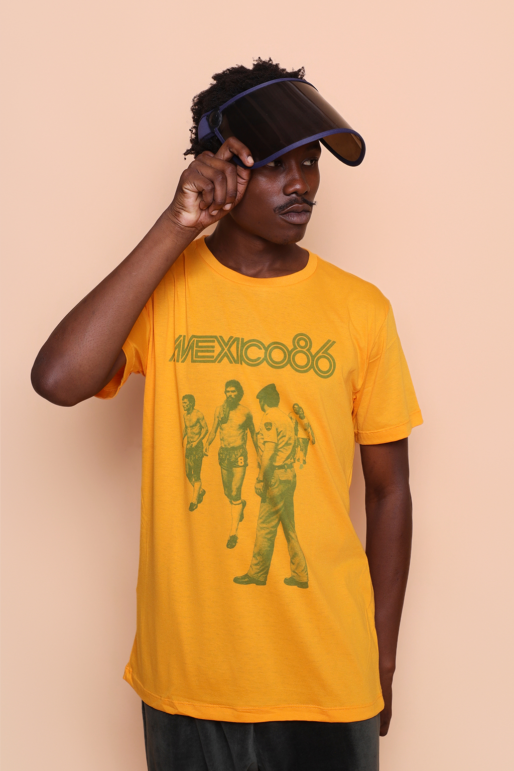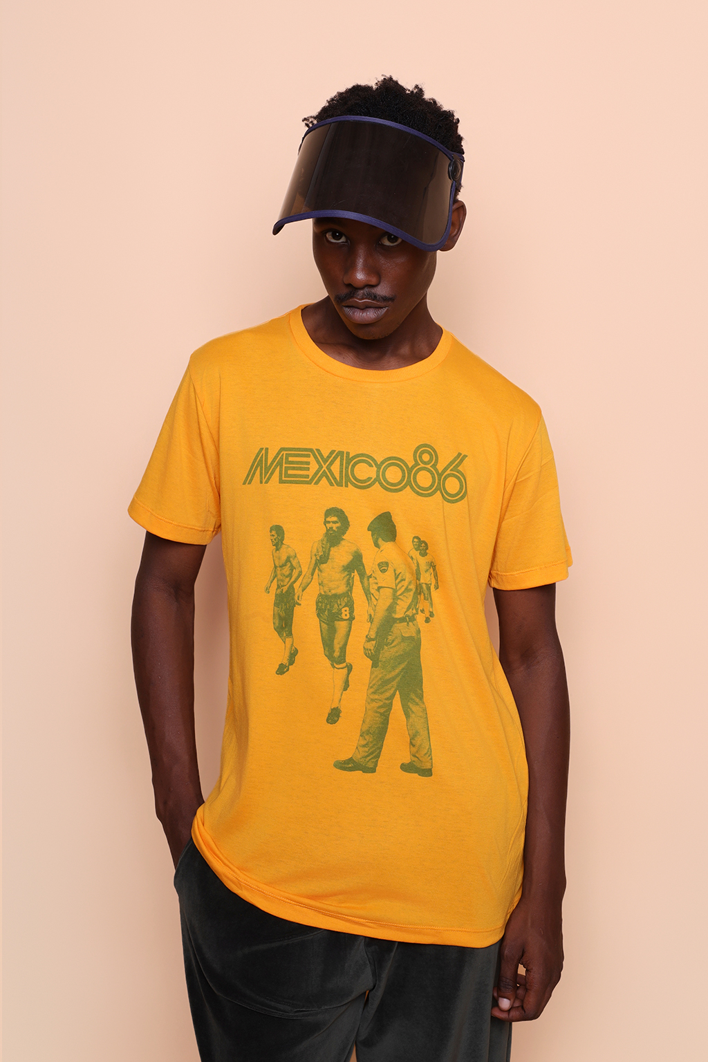 Camiseta amarela México 86. Ambos os modelos vestem tamanho P.