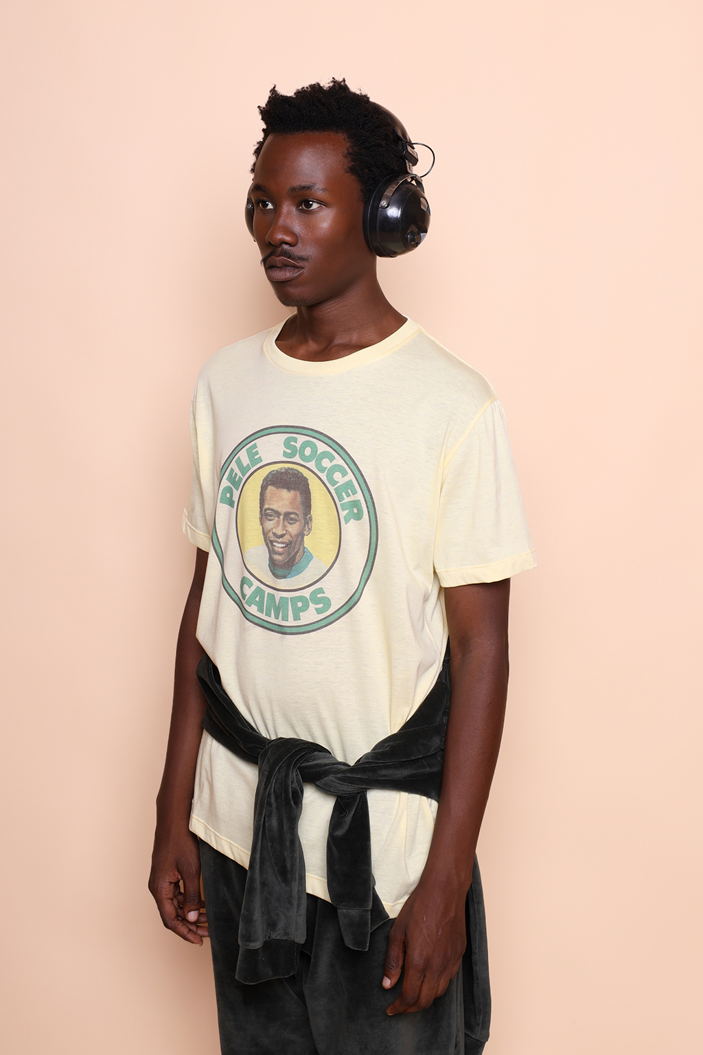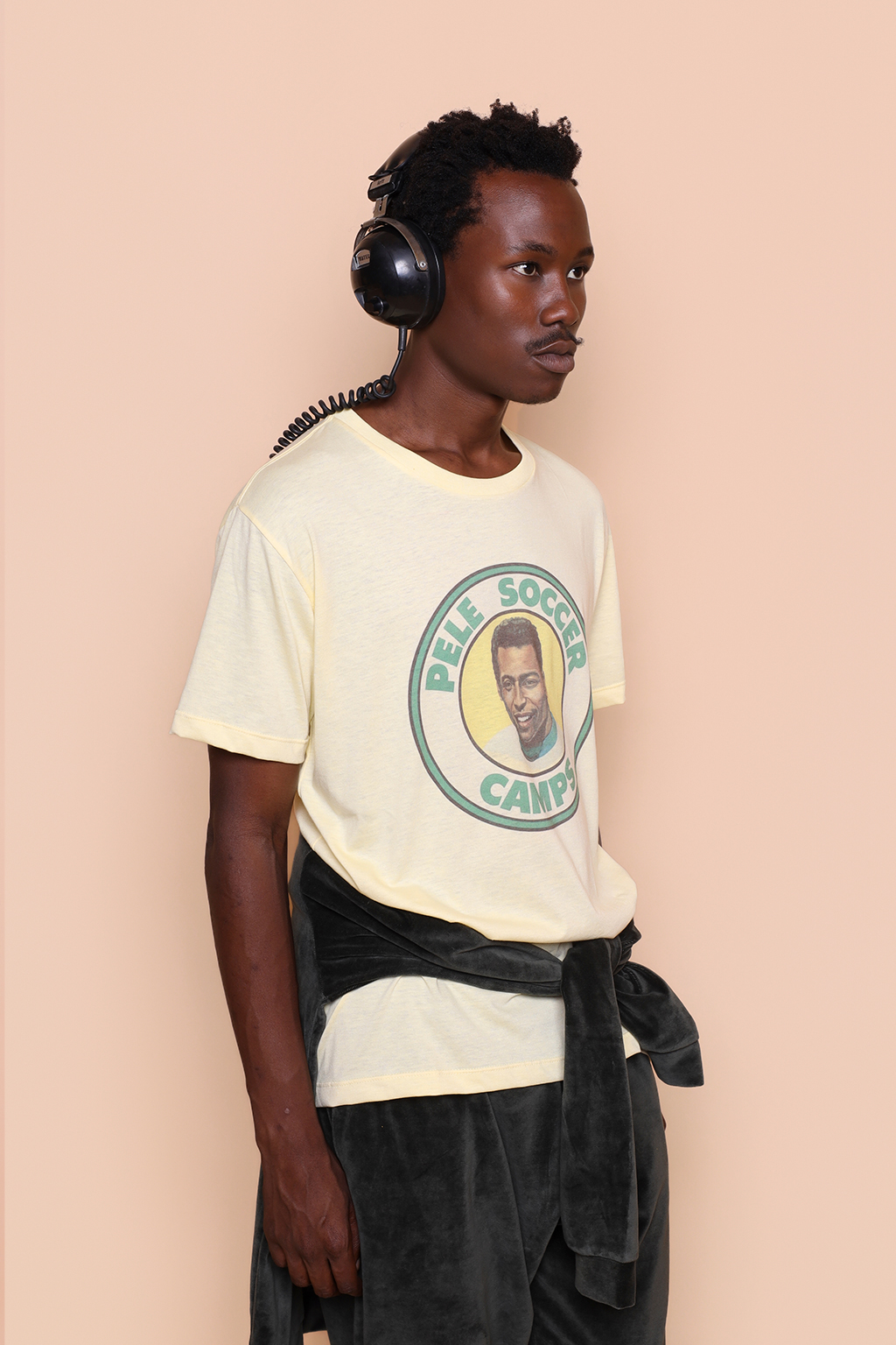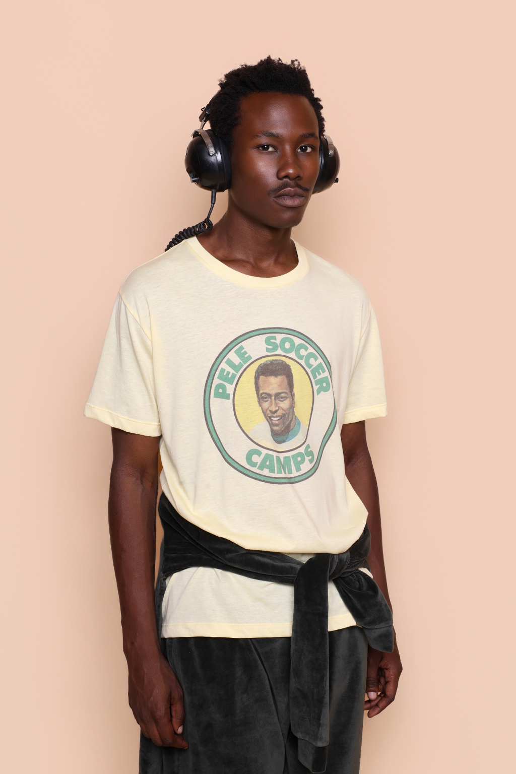 Camiseta amarela Pelé Soccer Camps. Ambos os modelos vestem tamanho P.