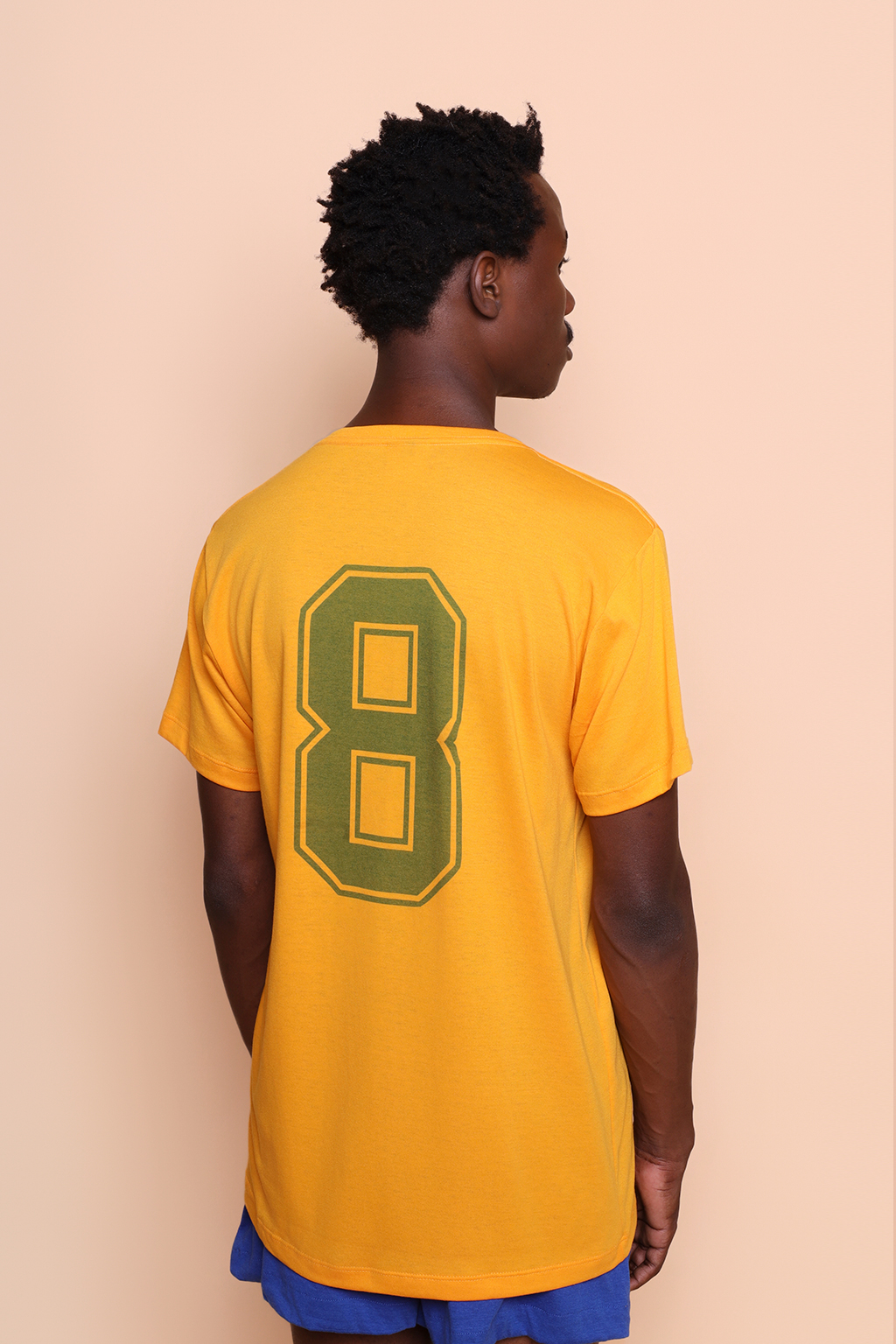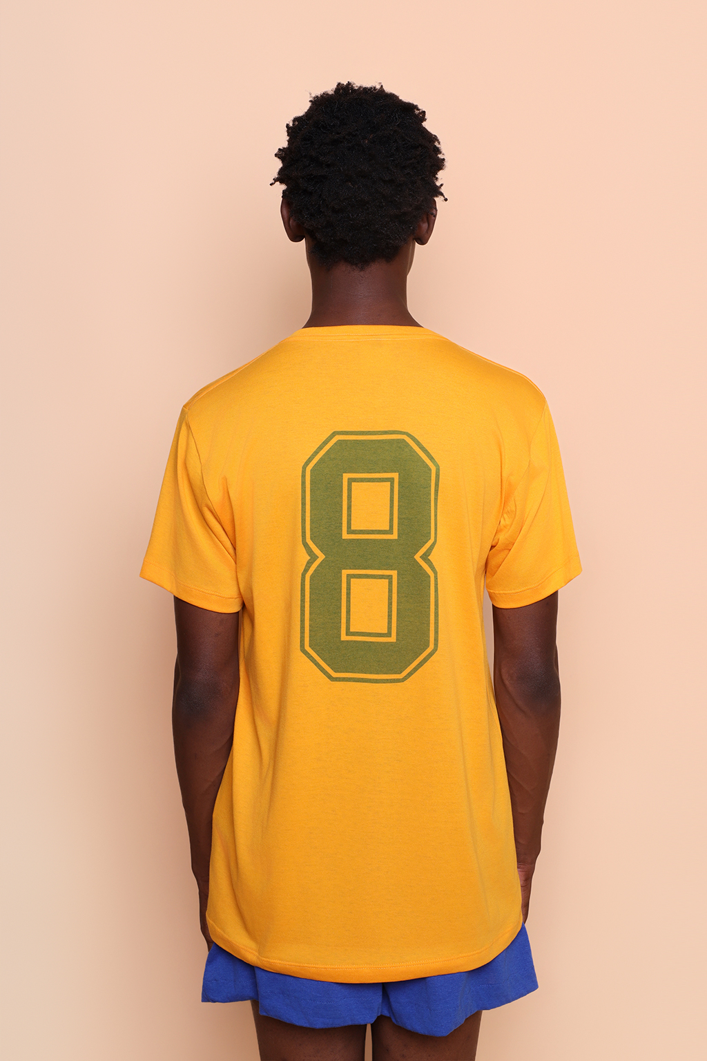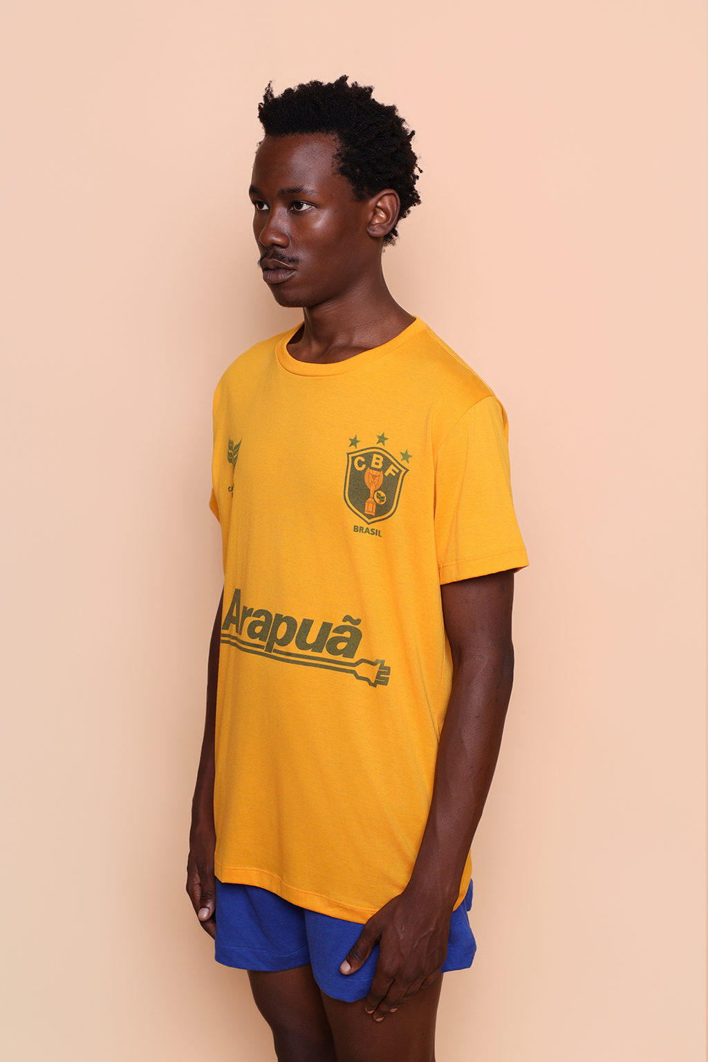 Camiseta amarela Seleção de 82. Ambos os modelos vestem tamanho P.