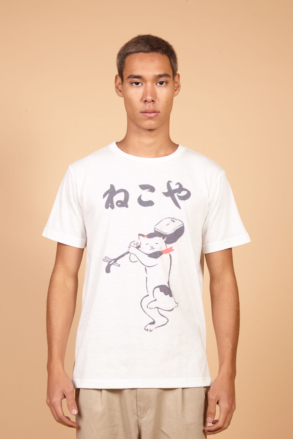 A camiseta AMP Gato Bandolim é uma camiseta unissex, com modelagem reta e manga curta, feita em tecido meia malha de algodão. A camiseta tem como estampa uma imagem de um gato segurando um bandolim como um taco de baseball, e escritos em japonês.