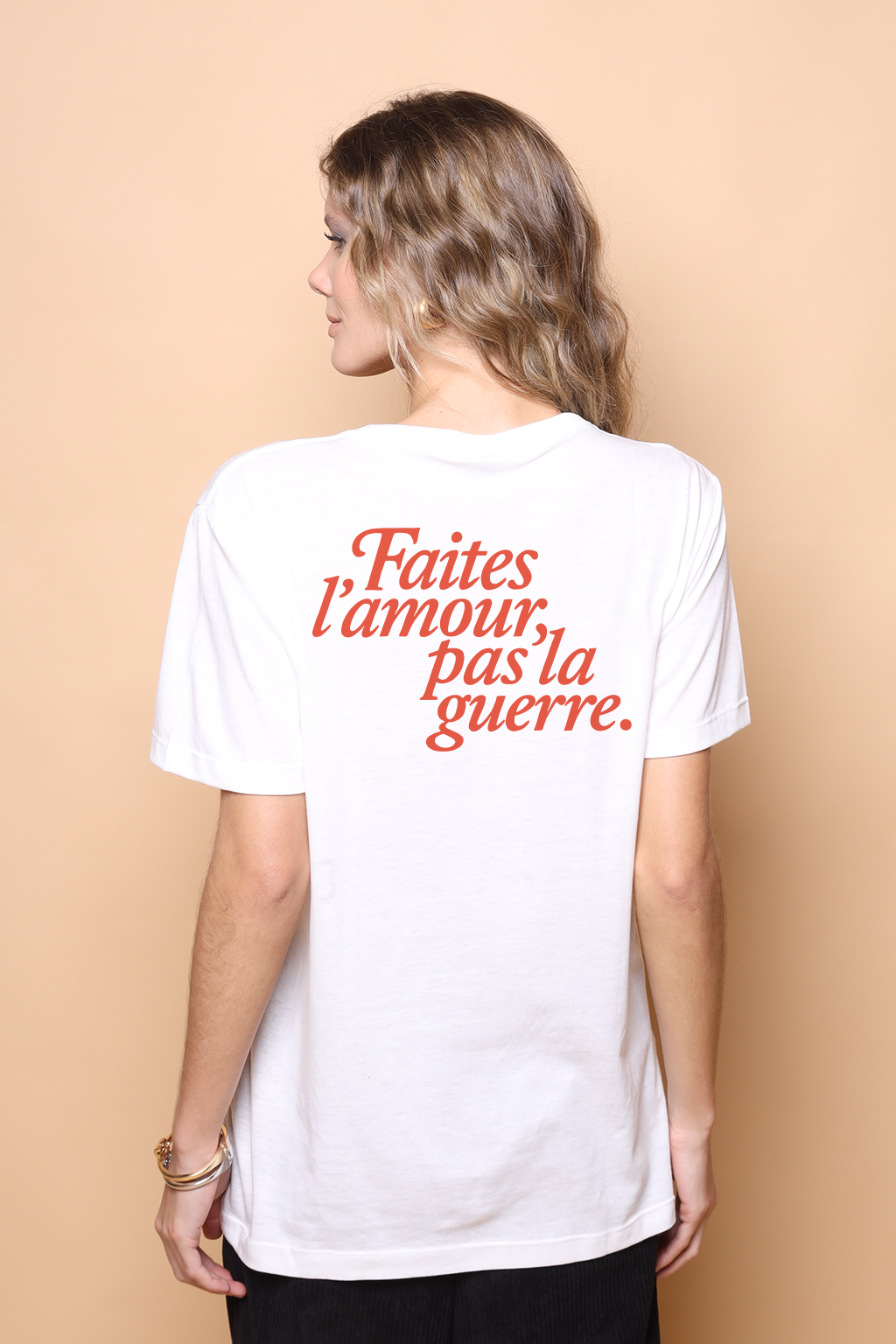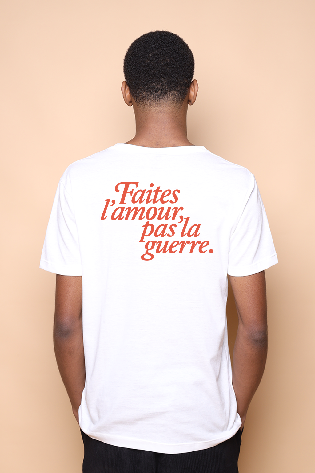 Camiseta collab Astrid Fontenelle. A modelo mede 1,72 e o modelo mede 1,78 e ambos usam tamanho P.