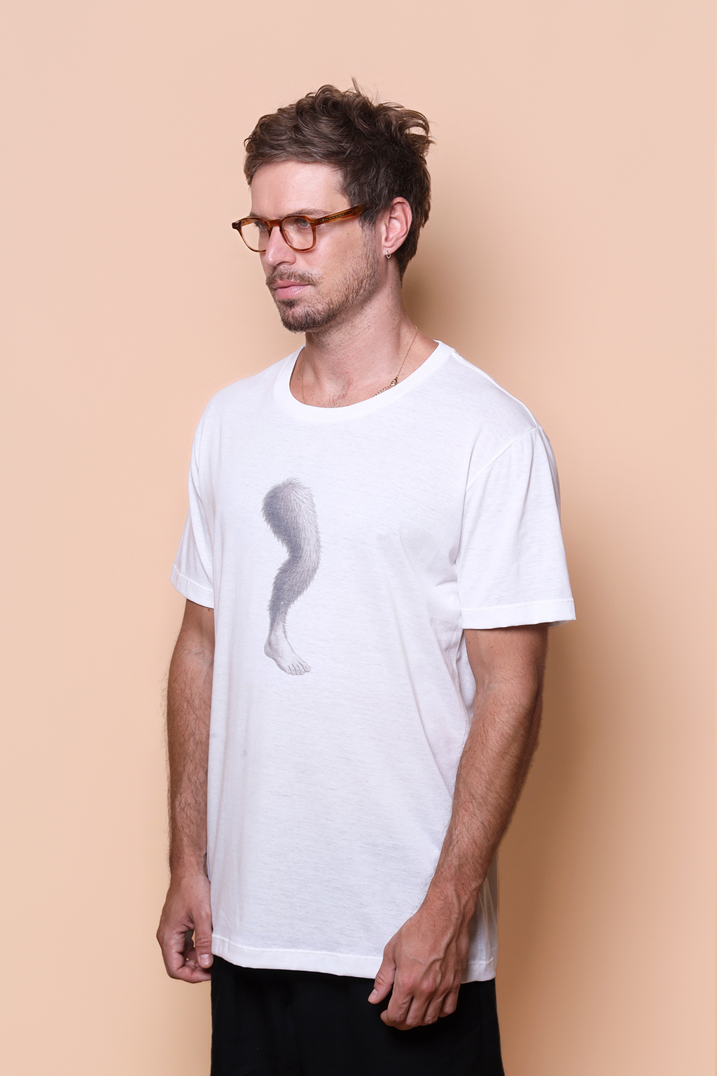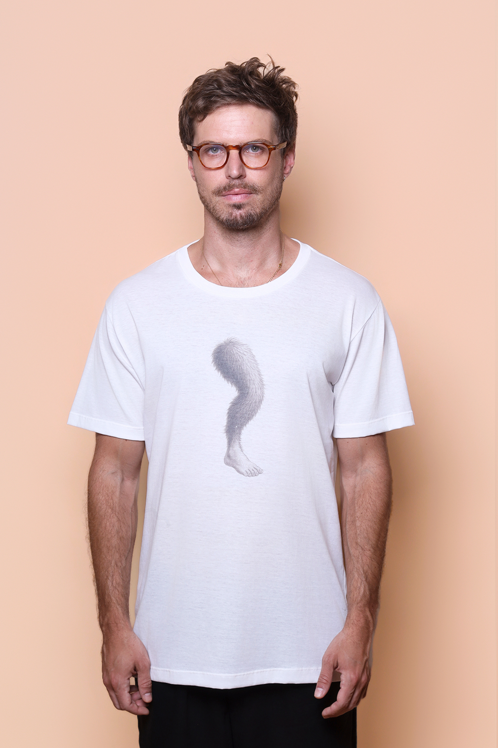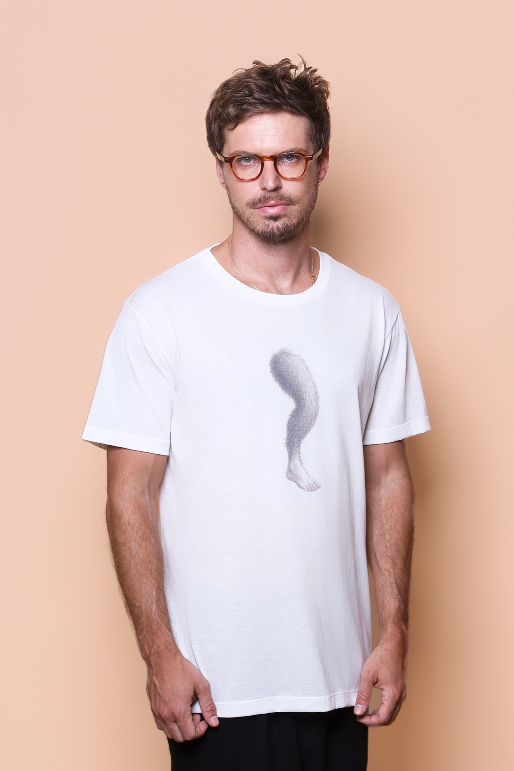 A camiseta perna cabeluda é confeccionada em tecido meia malha de algodão para um toque mais macio e agradável. Essa peça faz parte de uma coleção collab com o filme O Agente Secreto, novo filme de Kleber Mendonça Filho indicado ao Globo de Ouro. Em especial, a camiseta perna cabeluda traz como estampa a lenda urbana famosa em Recife, e citada por Kleber Mendonça no filme, que se passa na capital pernambucana. O conto nasceu na década de 1970, e diz que a Perna Cabeluda, um membro inferior peludo de unhas longas, anda sozinha pelas ruas da cidade, principalmente de noite, e ataca as pessoas, sempre de maneira repentina e sem razão, passando rasteiras e dando chutes até que tenha causado terror suficiente. Essa história foi publicada pela primeira vez em fevereiro de 1976 e, depois disso, ganhou fama, com cada vez mais relatos sobre a perna cabeluda.