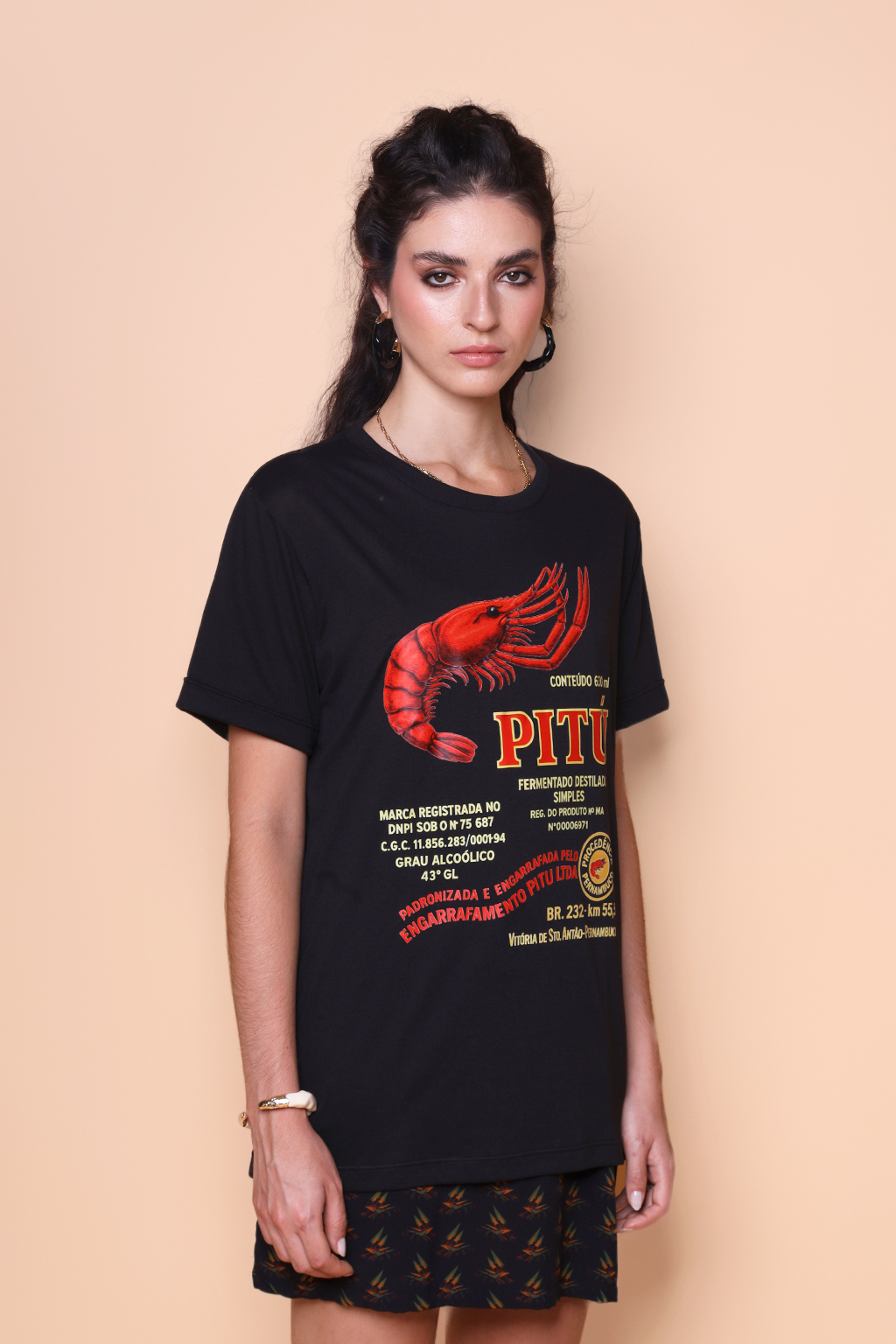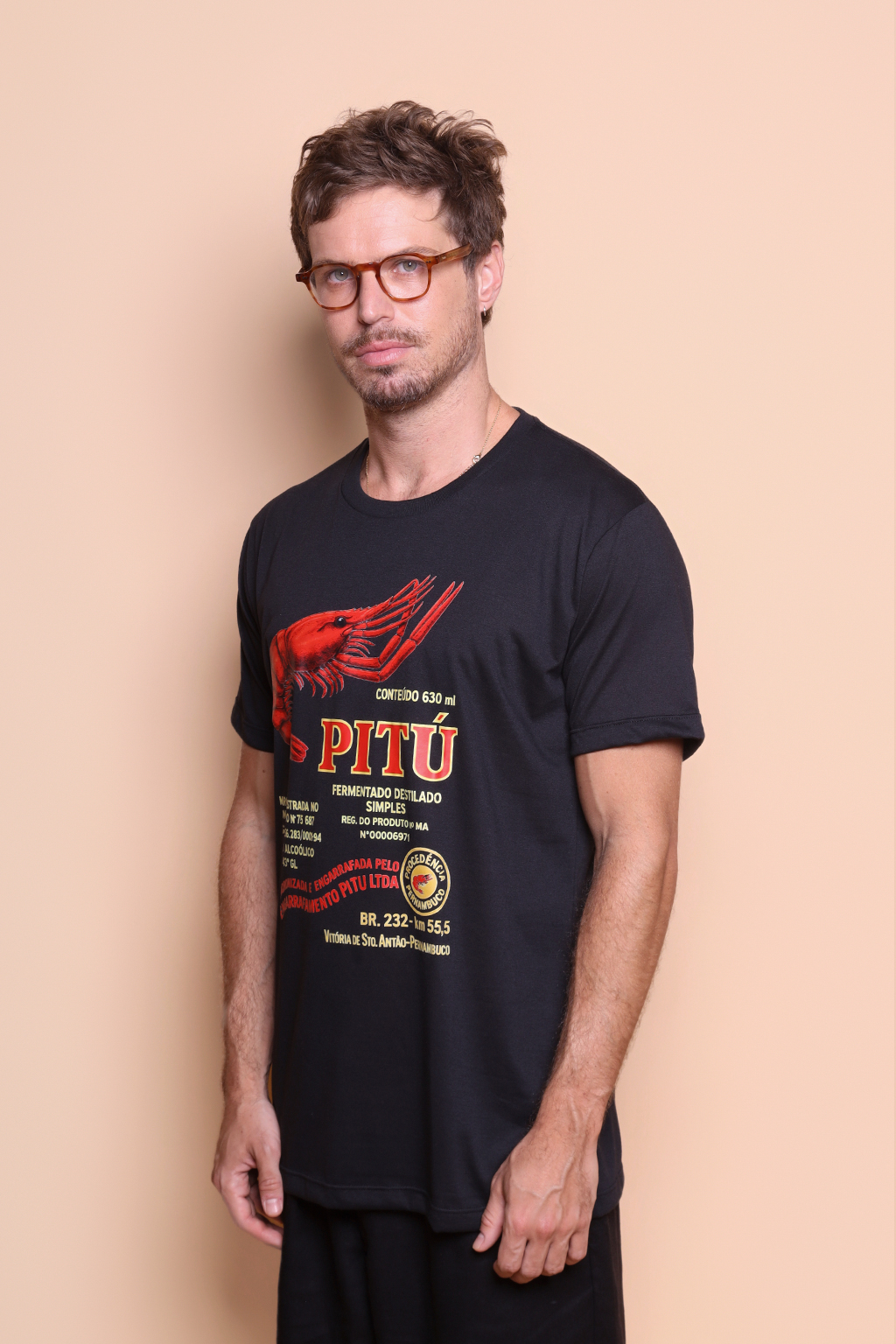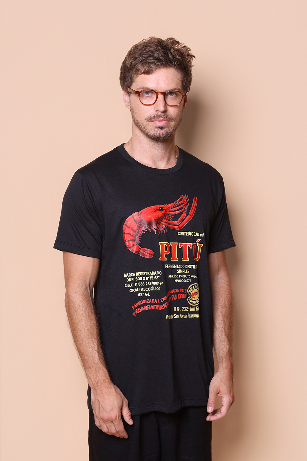 A camiseta Pitú é confeccionada em tecido meia malha de algodão para um toque mais macio e agradável. Essa peça faz parte de uma coleção collab com o filme O Agente Secreto, novo filme de Kleber Mendonça Filho indicado ao Globo de Ouro. Em especial, a camiseta Pitú traz como estampa o logo da cachaça criada pela empresa de nome homônimo, em 1938. A empresa foi fundada em Vitória de Santo Antão, apenas 46 km da capital pernambucana, Recife, cenário do filme. É a maior exportadora de cachaça do país, sendo reconhecida internacionalmente como uma bebida típica brasileira, exportada para diversos países como Alemanha, EUA, Canadá, Japão e países do Mercosul.