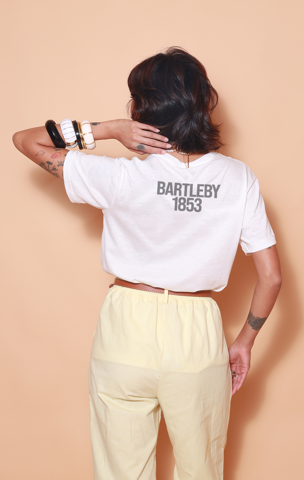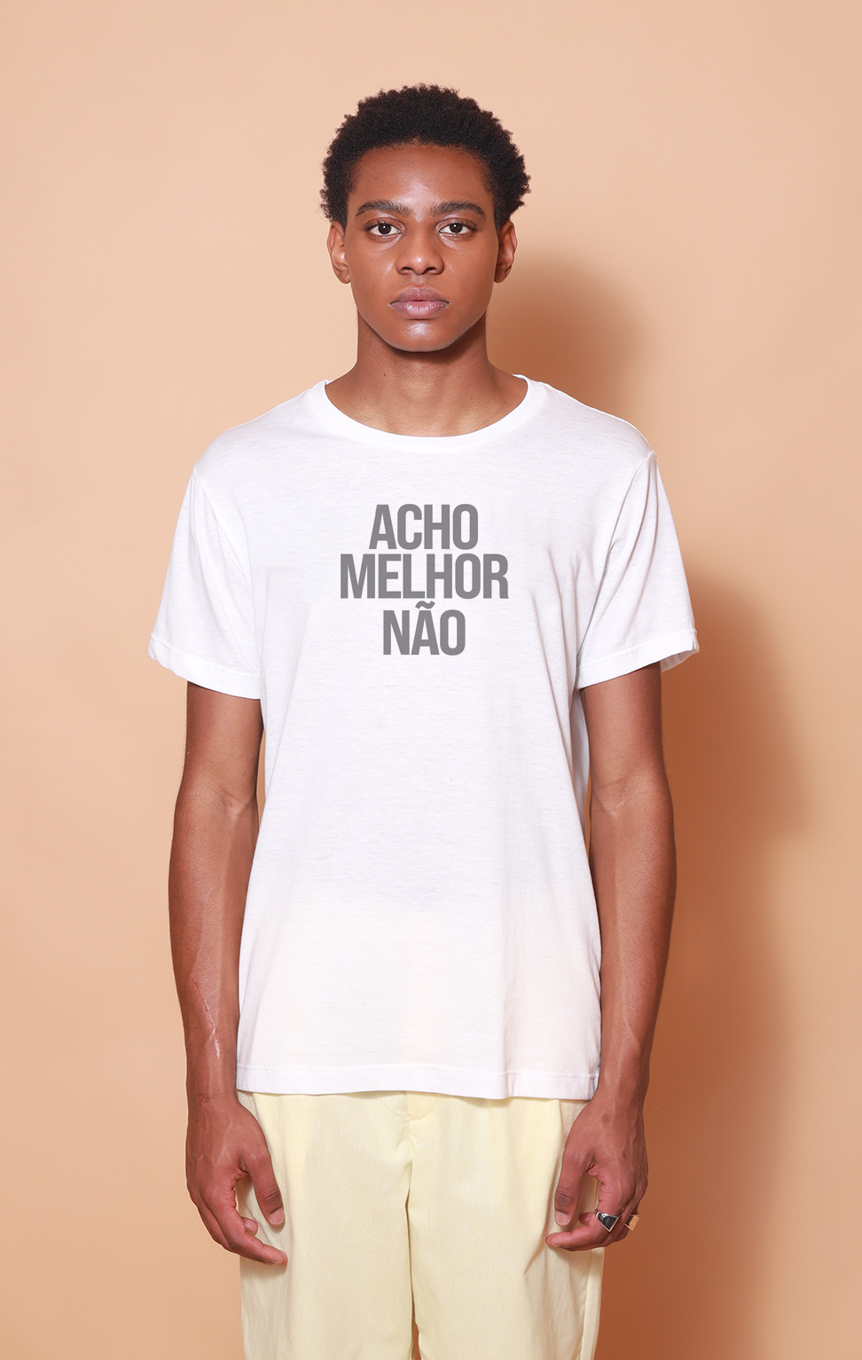 A camiseta Acho melhor não AMP é uma peça unissex, com modelagem reta, manga curta e confeccionada em tecido meia malha de algodão, dando um toque mais macio e agradável. A camiseta Acho melhor não tem como estampa a frase que “guia” a vida de Bartleby, personagem criado por Herman Melville em seu livro “Bartleby, o escrivão”, publicado em 1853. Essa estampa foi pensada e desenvolvida em colaboração com a editora Ubu,