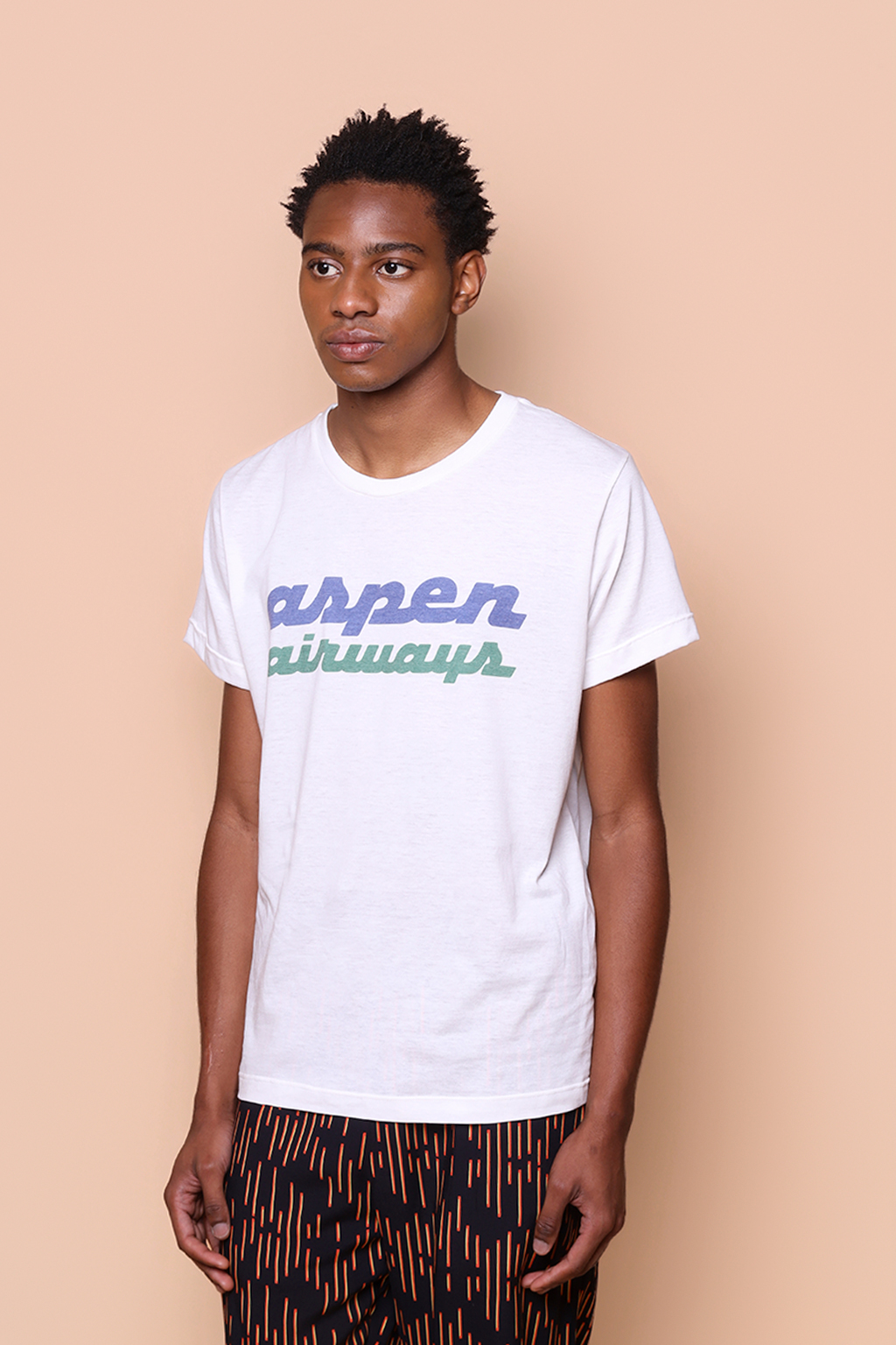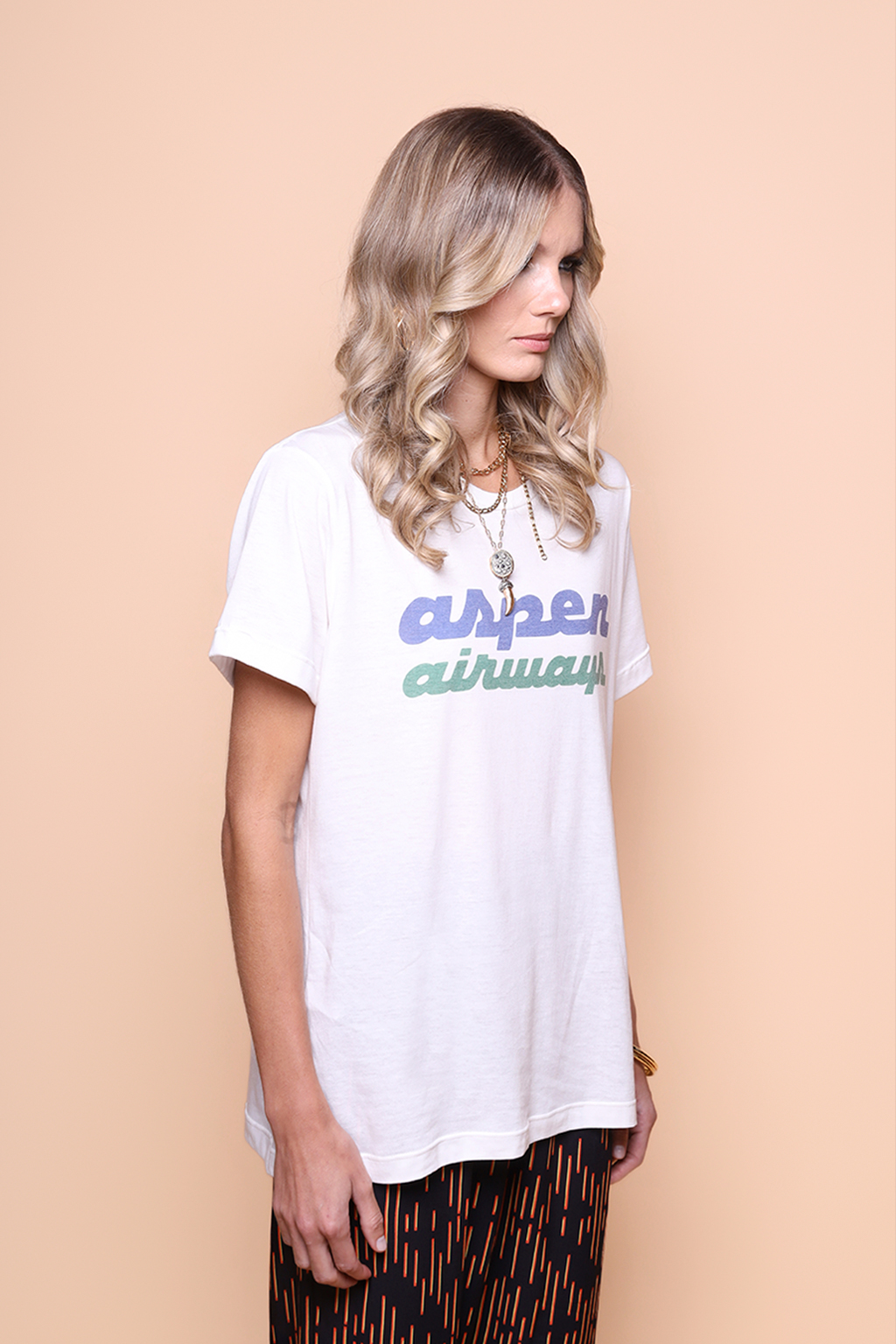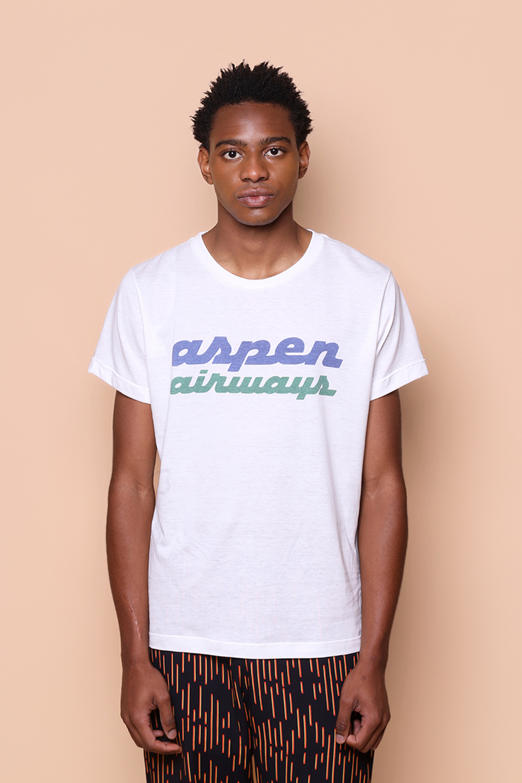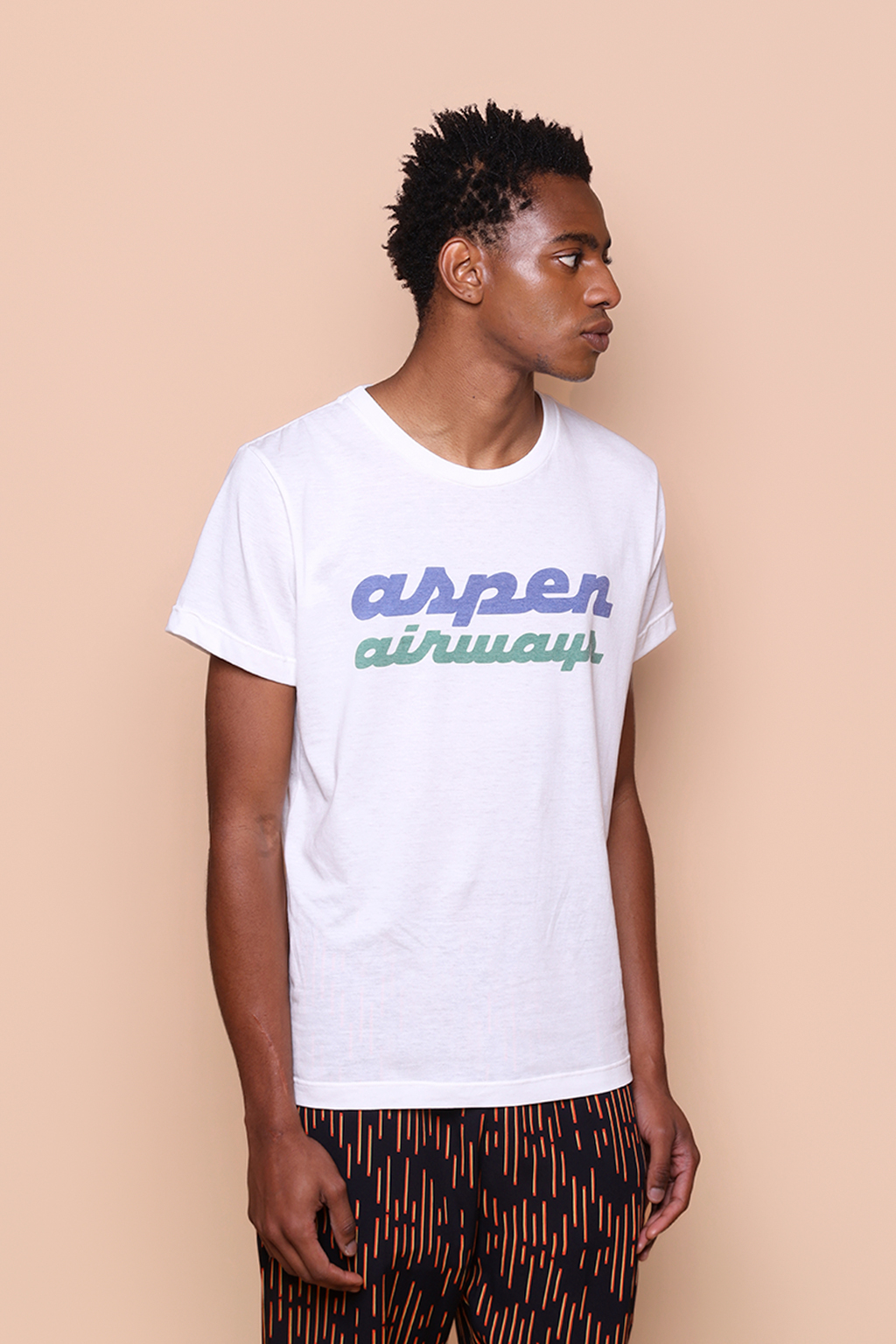 A camiseta Aspen Airways é confeccionada em tecido meia malha de algodão, dando um toque mais macio e agradável. Além disso, tem como estampa o logo da empresa de aviação estadunidense Aspen Airways. A empresa era um filial regional da United Express, e tem como sede o hangar 5 do aeroporto internacional de Denver, Colorado. Fundada em 1952, a empresa encerrou suas operações em 1990, ao ser vendida e incorporada pela Mesa Airlines e Air Winsconsin Services Inc.