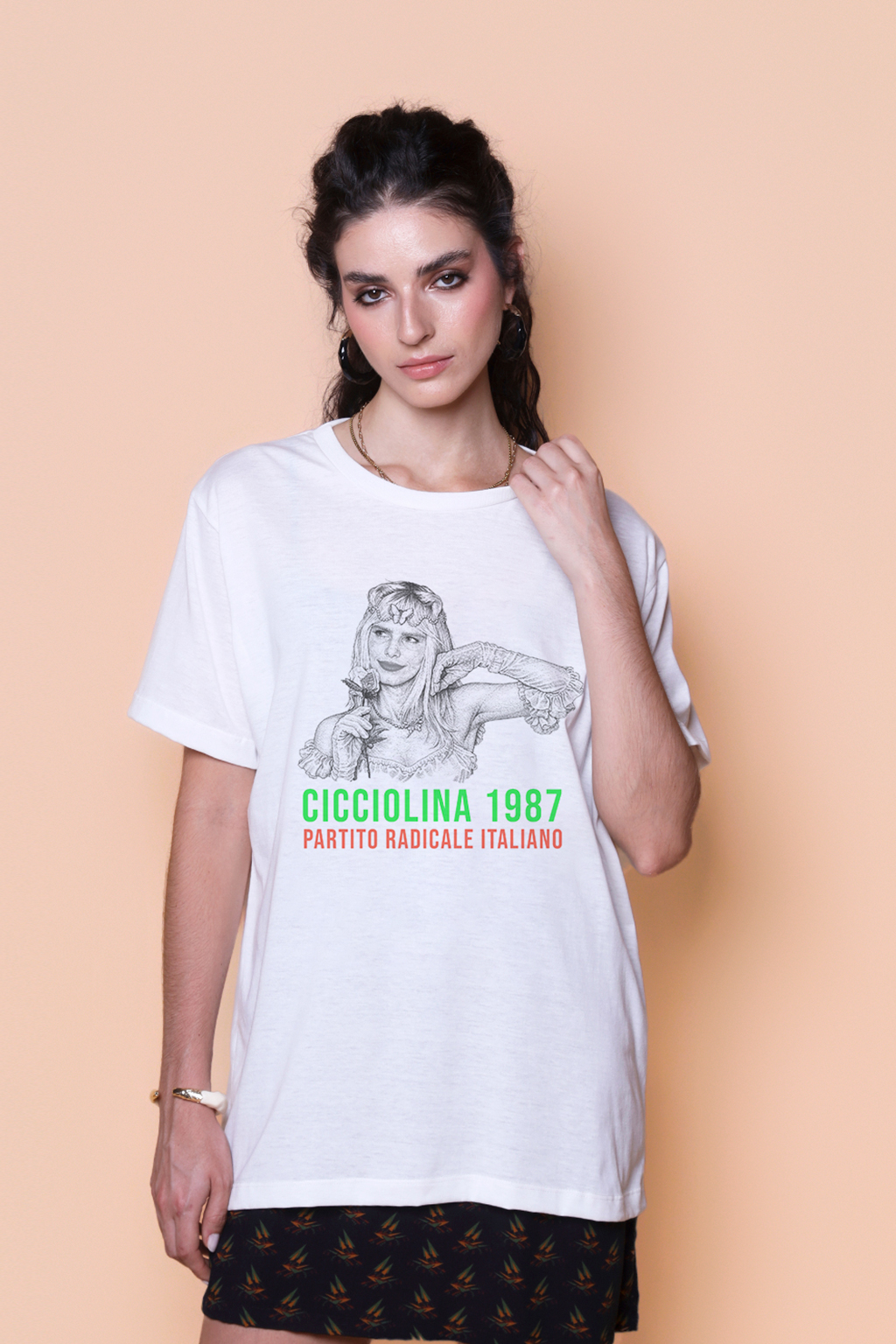 A camiseta Cicciolina 1987 é confeccionada em tecido meia malha de algodão, dando um toque mais macio e agradável. Além disso, tem como estampa uma espécie de propaganda eleitoral para Cicciolina, nome artístico de Ilona Anna Staller, uma ex-atriz de filmes adultos que foi eleita para o parlamento italiano em 1987. Representando o distrito de Lácio de Roma, recebeu 20 mil votos e foi a segunda deputada mais votada de seu partido. Suas principais bandeiras eram a luta contra a energia nuclear e contra a OTAN.
