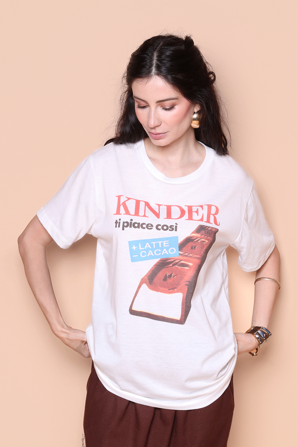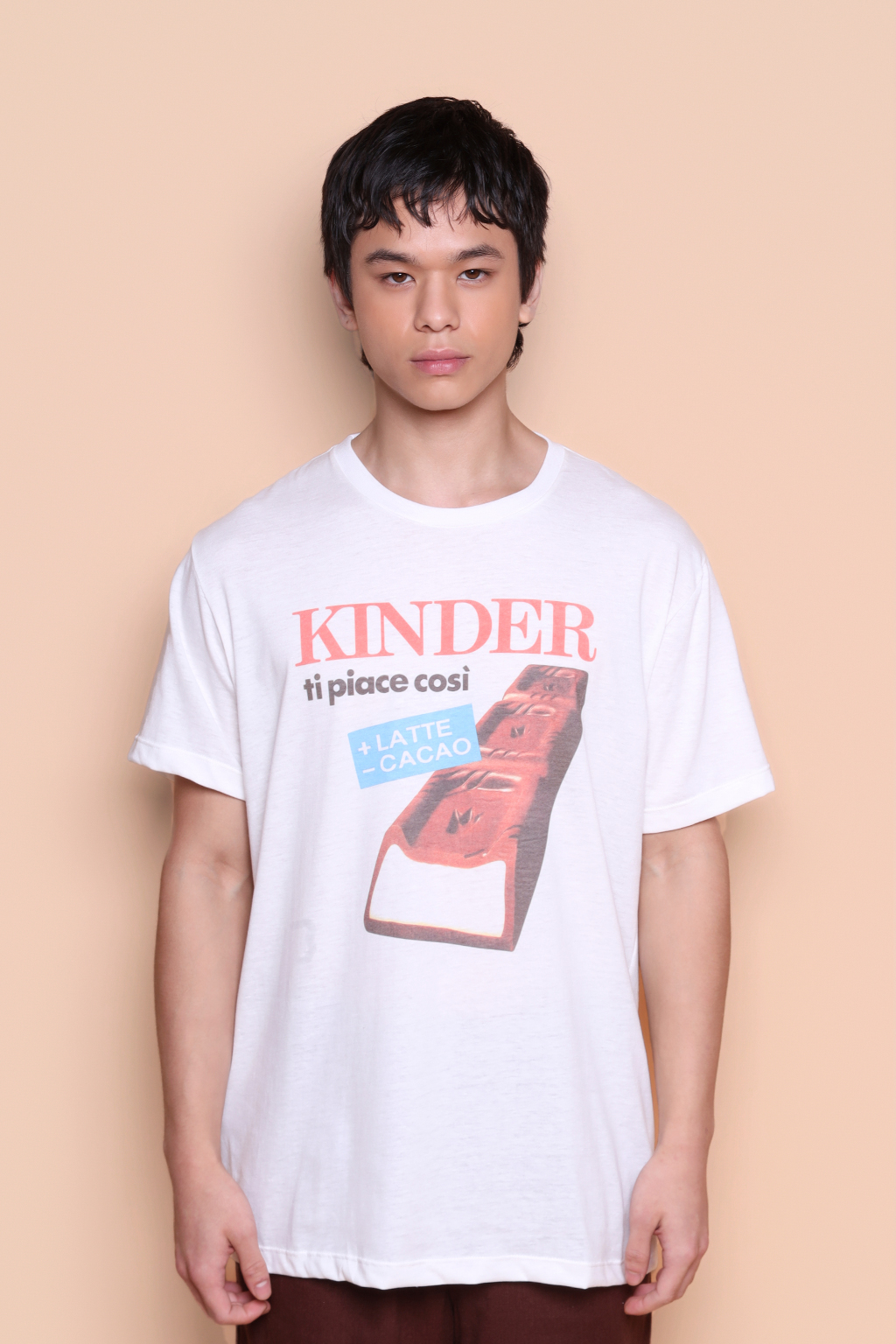A camiseta Ferrero Kinder é confeccionada em tecido meia malha de algodão, dando um toque mais macio e agradável. Além disso, tem como estampa uma peça publicitária do Kinder, chocolate italiano da Ferrero, lançado em 1968. O slogan “+ leite, – cacau” buscava reconfortar e mostrar às que seu produto era o melhor para as crianças. Além disso, tem a frase em italiano “Ti piase cosi”, que pode ser traduzida para “Vocês gostam assim”.