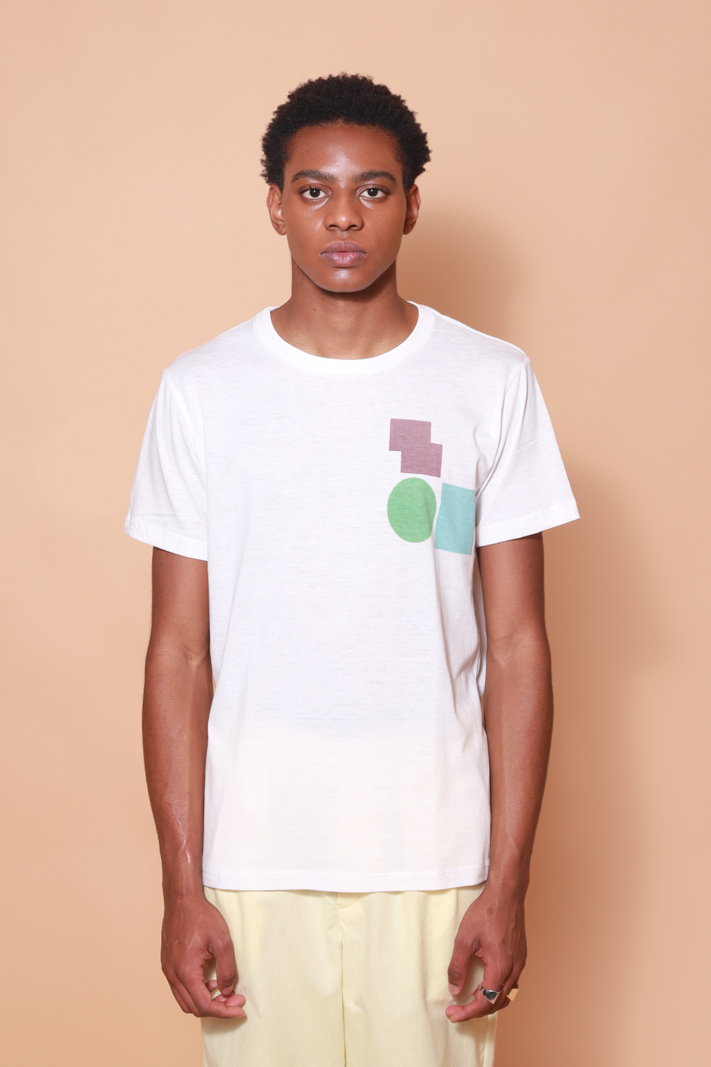 Camiseta estampada Formas coloridas. O modelo mede 1,78 e usa tamanho P.