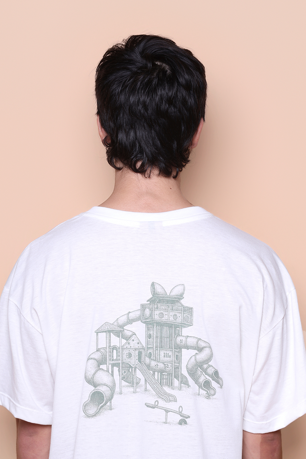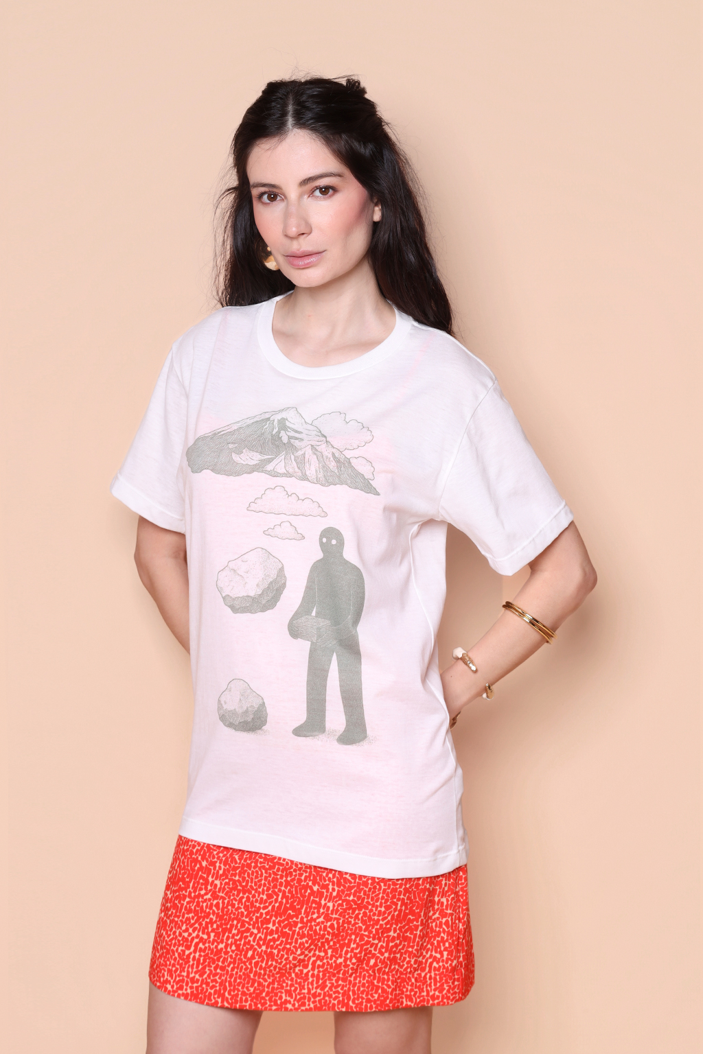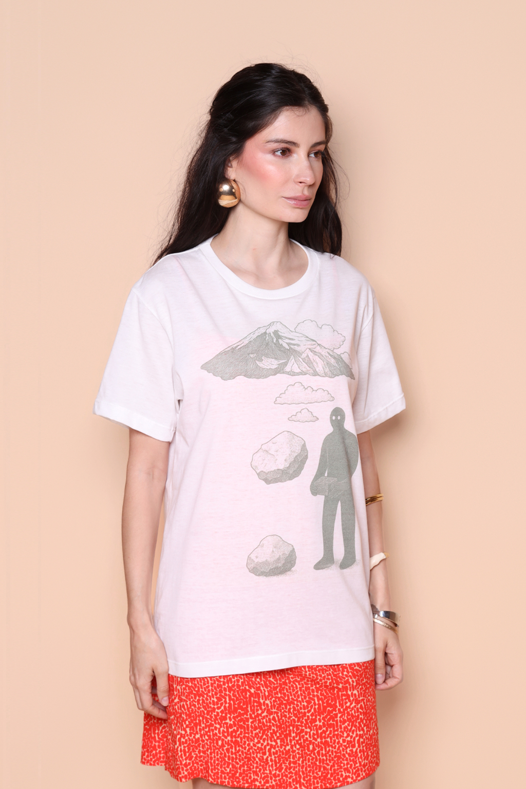 A camiseta Homem Pedra é confeccionada em tecido meia malha de algodão, dando um toque mais macio e agradável. Além disso, tem como estampa um desenho nonsense estilizado com pontilismo de uma criatura com silhueta de homem carregando pedras.