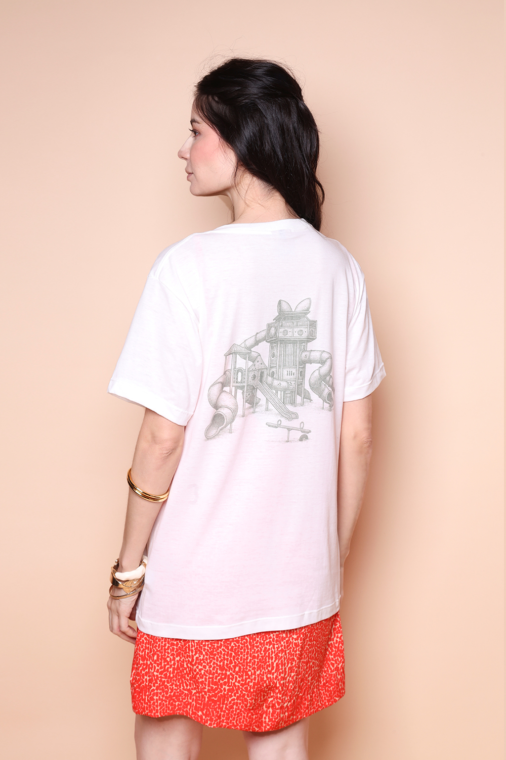 Camiseta estampada Homem Pedra. A modelo mede 1,72 e usa tamanho P.
