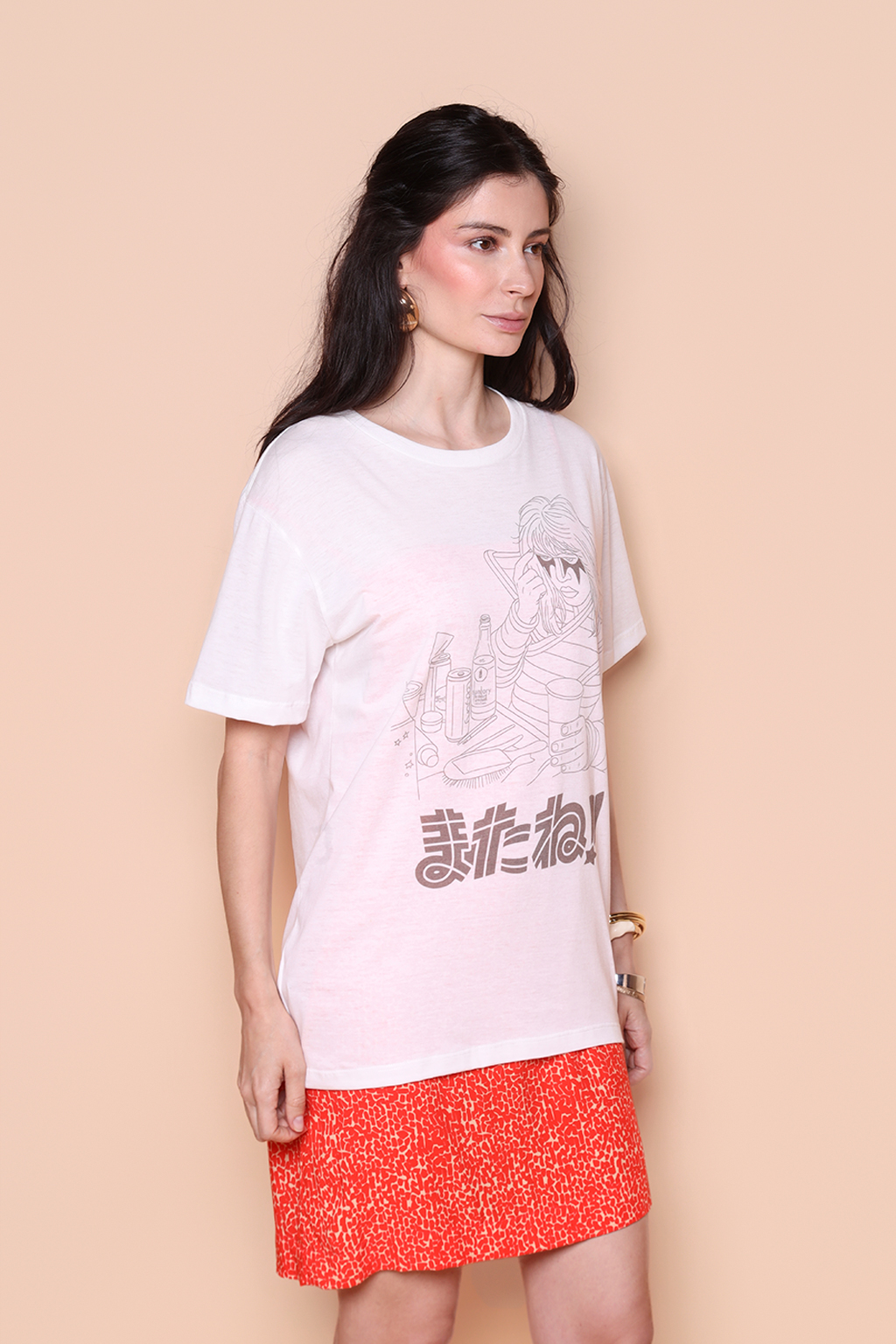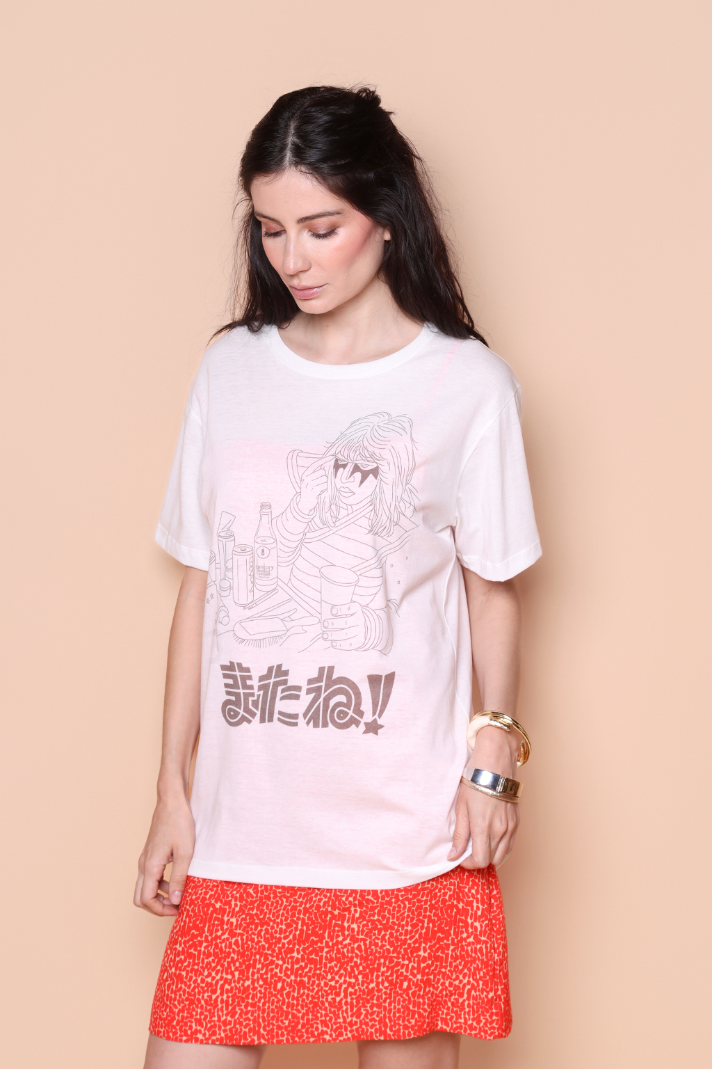 Camiseta estampada Kiss japonês. A modelo mede 1,72 e usa tamanho P.