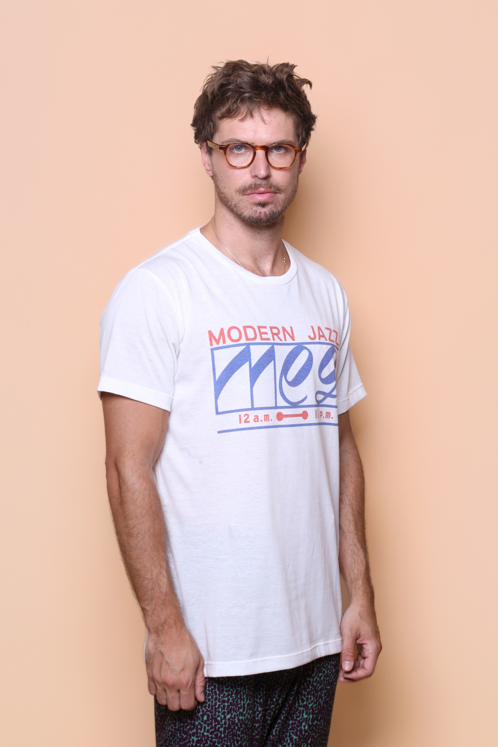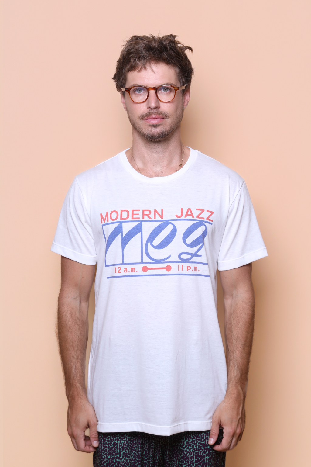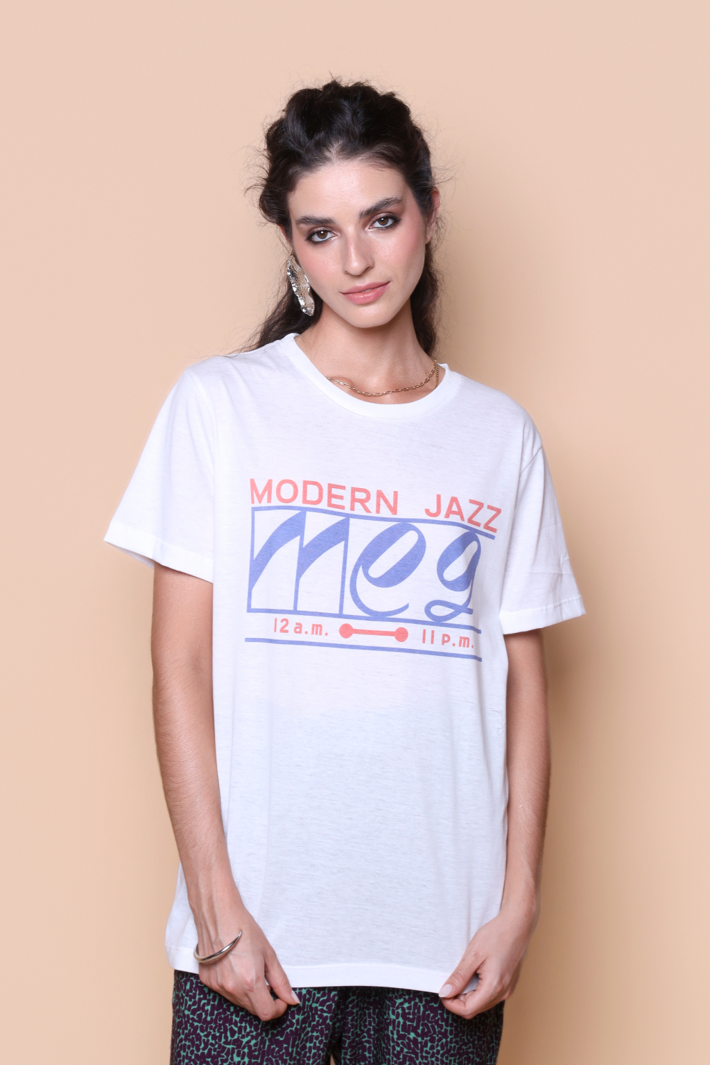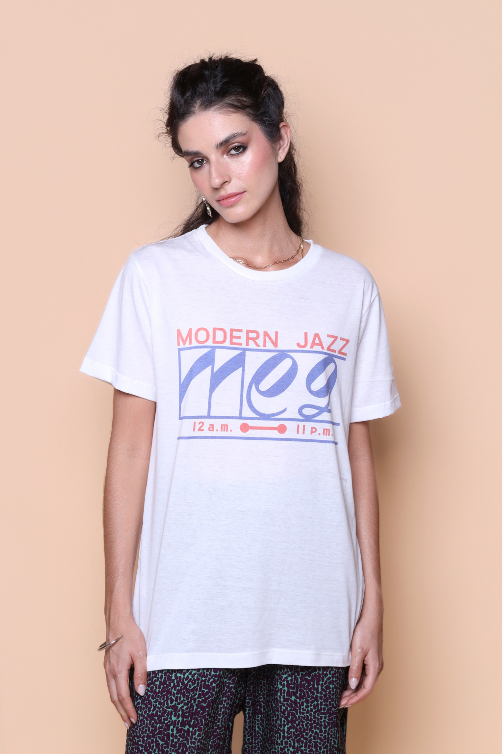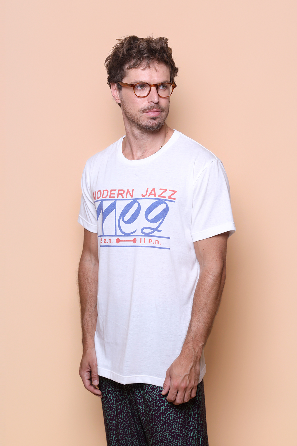 A camiseta Meg é confeccionada em tecido meia malha de algodão, dando um toque mais macio e agradável. Além disso, tem como estampa o logo de um café de jazz japonês, propriedade de famoso crítico de jazz japonês, Yasukuni Terashima. O café está localizado no distrito de Kichijoji, na zona oeste de Tóquio, e é uma clássica “kissaten”, cafeterias tradicionais japonesas que focam em um ambiente calmo e relaxante.