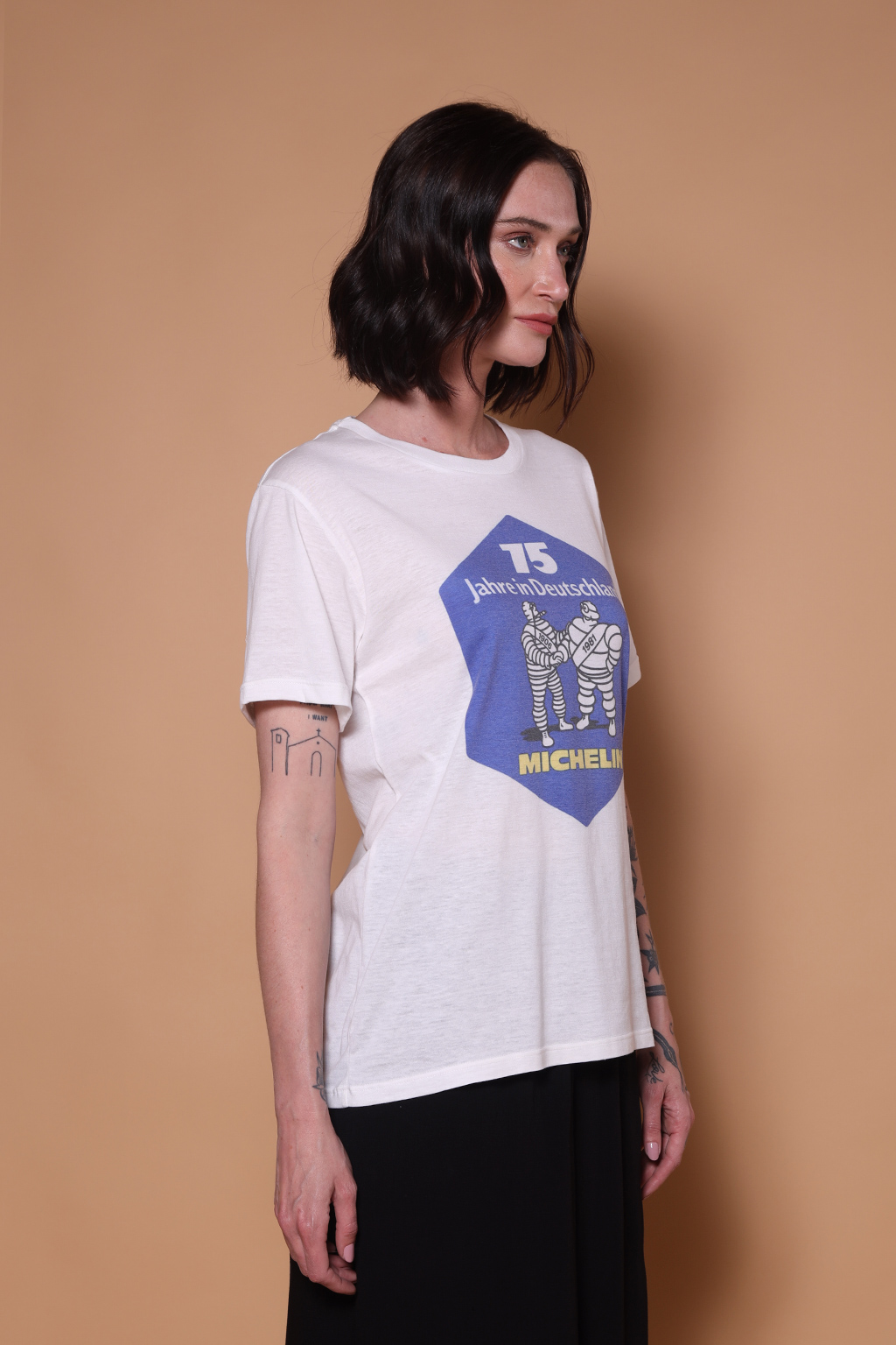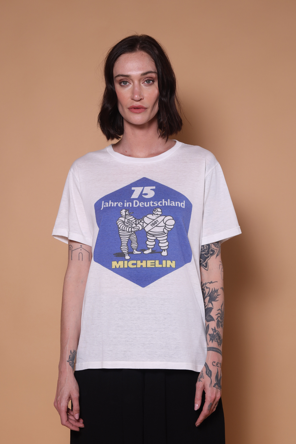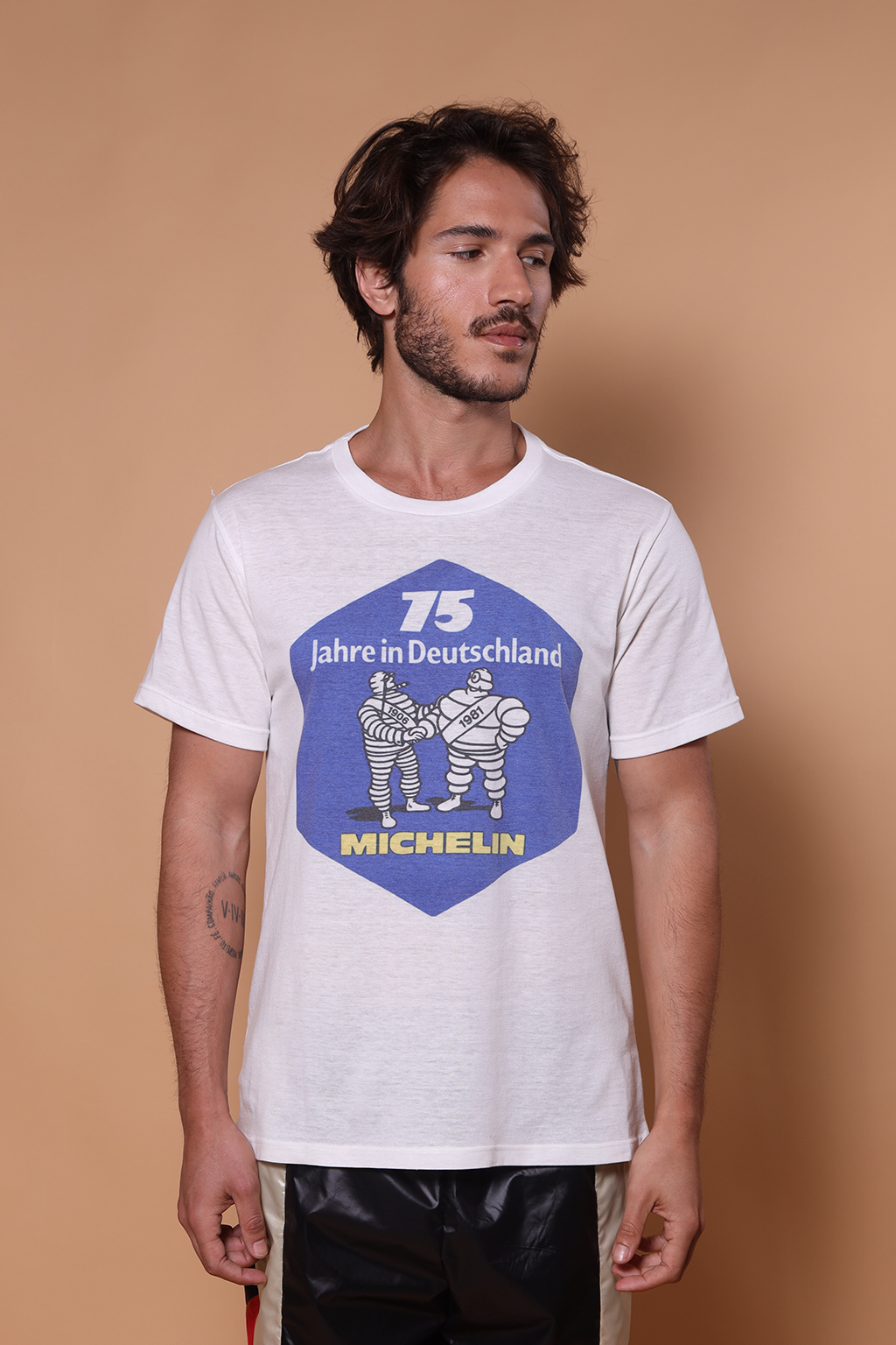 A camiseta Michelin AMP é uma camiseta unissex, com modelagem reta e manga curta. Nossa camiseta de malha é feita em tecido meia malha de algodão, que confere um toque mais macio e agradável. A camiseta Michelin tem como estampa uma peça publicitária da empresa de pneus com a frase “75 anos na Alemanha”, em alemão. Fundada em 1889, a empresa francesa de pneus atua em mais de 170 países no mundo. O icônico mascote da marca, o “Bibendum”, é um dos mascotes mais famosos e antigos do mundo, tendo sido criado em 1898. O nome tem origem na frase latina ” nunc est bibendum” (Bebamos agora), brincando com a ideia de que o passar dos anos o deixa mais refinado.