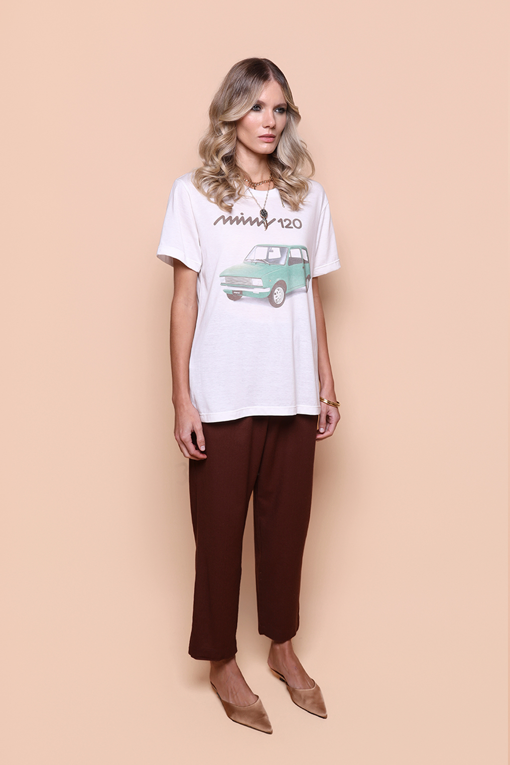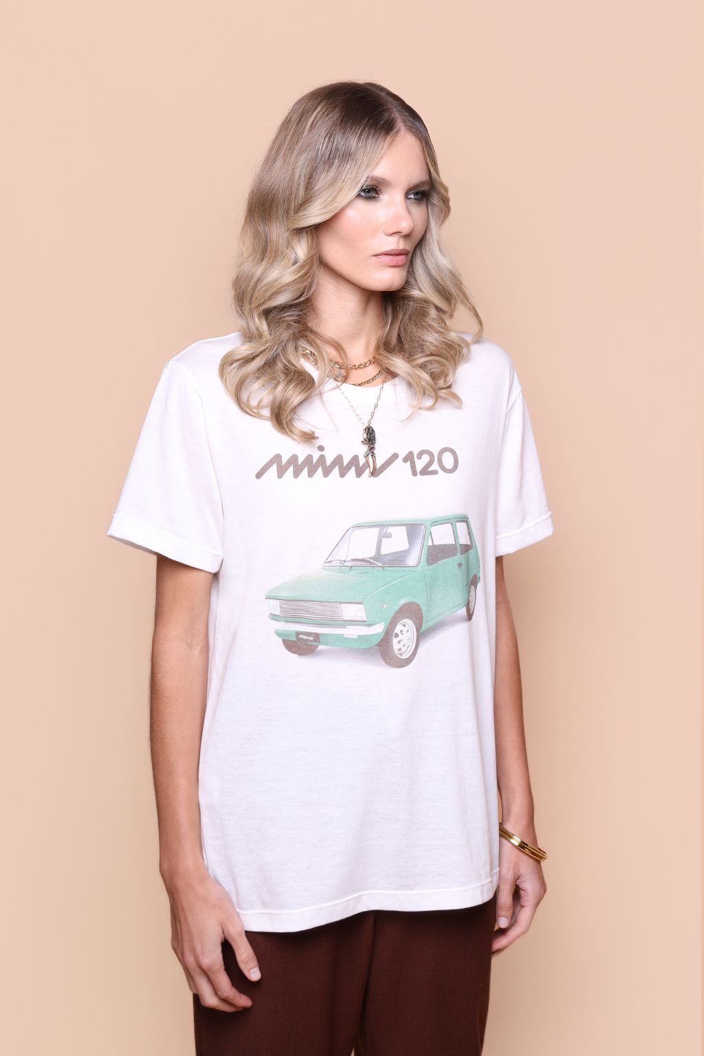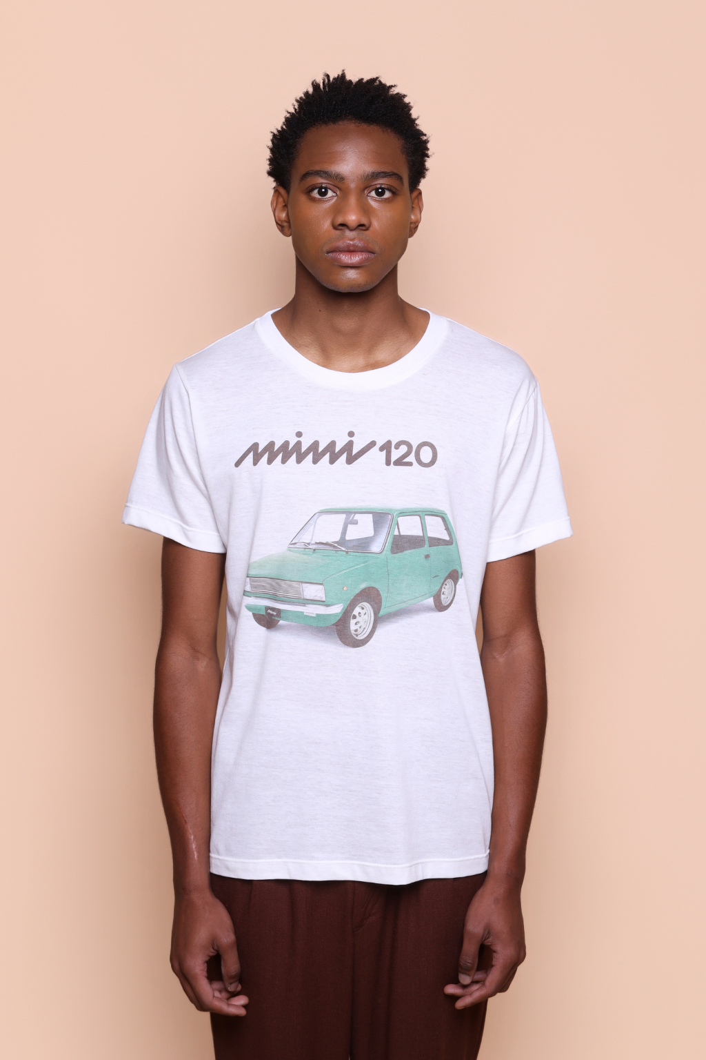 A camiseta Mini 120 é confeccionada em tecido meia malha de algodão, dando um toque mais macio e agradável. Além disso, tem como estampa uma campanha publicitária do Innocenti Mini 120, lançado em 1974 pela montadora italiana Innocenti, mesma responsável pela famosa scooter Lambretta. O modelo mais vendido do Mini 120 foi a versão hatchback com 3 portas, e motor de 3 cilindros.