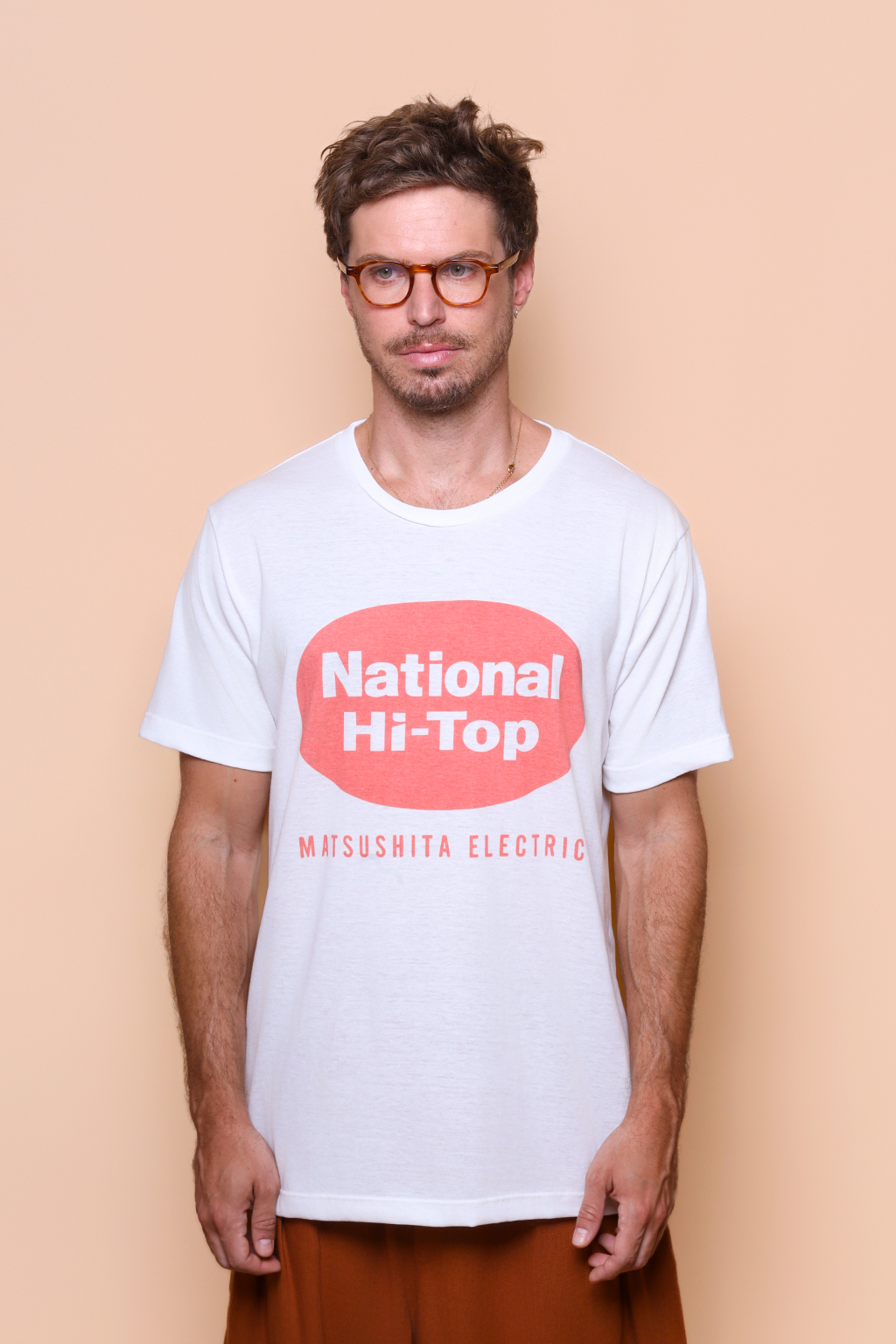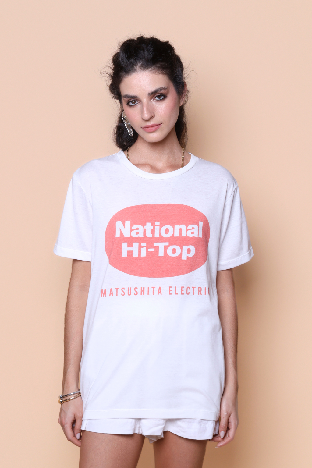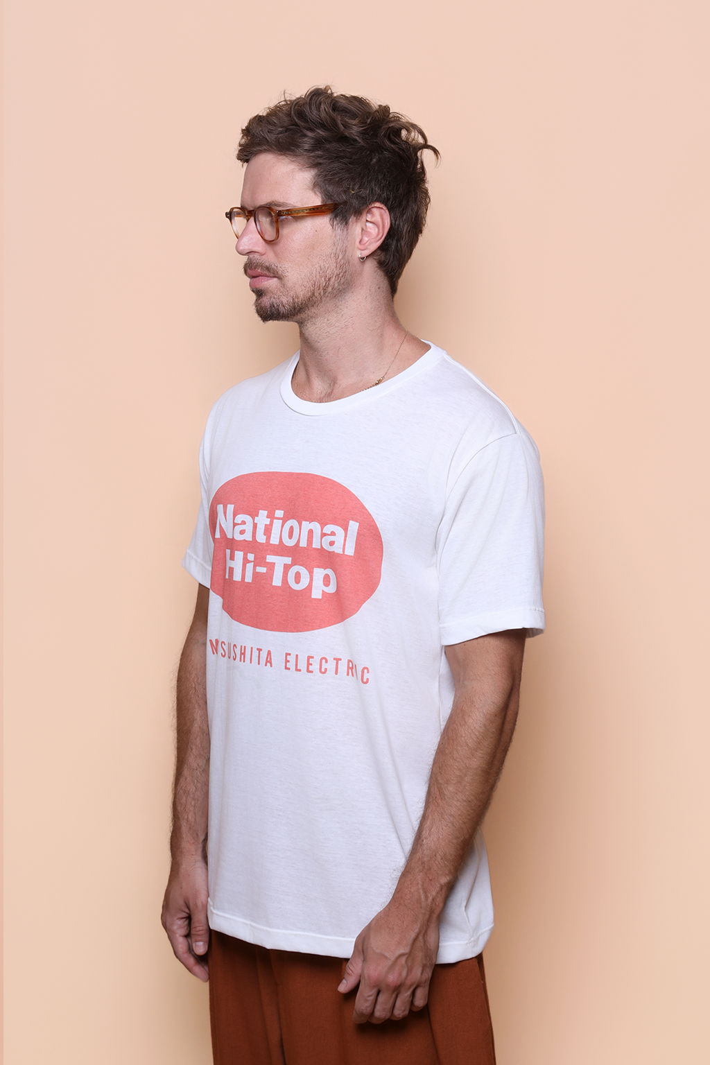 A camiseta National Hi-Top é confeccionada em tecido meia malha de algodão, dando um toque mais macio e agradável. Além disso, tem como estampa o logo da Matsushita Electric, empresa japonesa fabricante de eletrodomésticos que viria a se tornar a Panasonic. Fundada em 1918, a empresa mudou o nome para Panasonic em 2008, para unificar sua identidade global. Durante décadas, a Matsushita Electric operou sob diversas marcas, sendo a National utilizada para eletrodomésticos no Japão, enquanto Panasonic e Technics eram utilizada para áudio e eletrônicos no mercado externo.