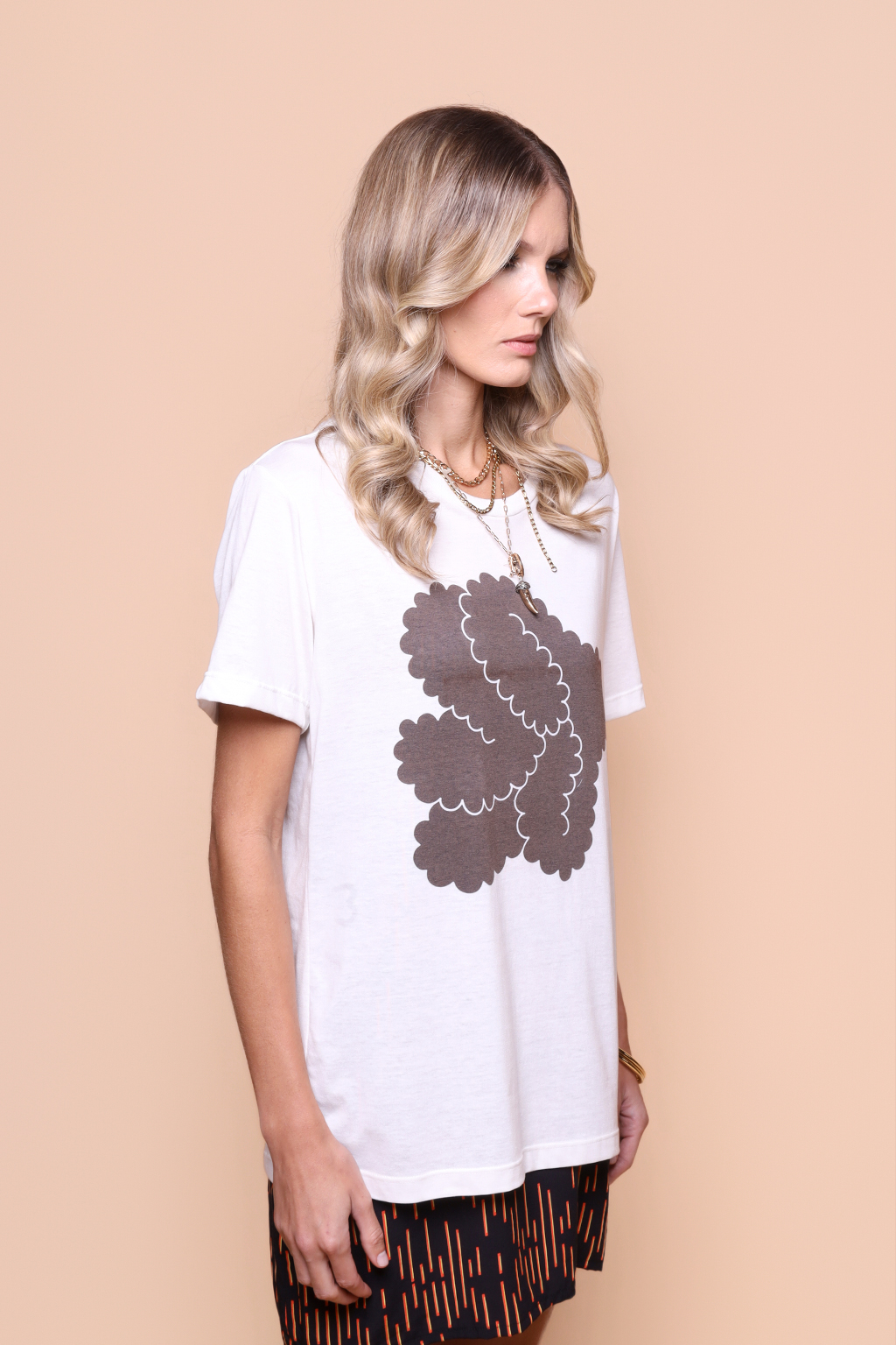 Camiseta estampada Nuvem preta. A modelo mede 1,72 e o modelo mede 1,78 e ambos usam tamanho P.
