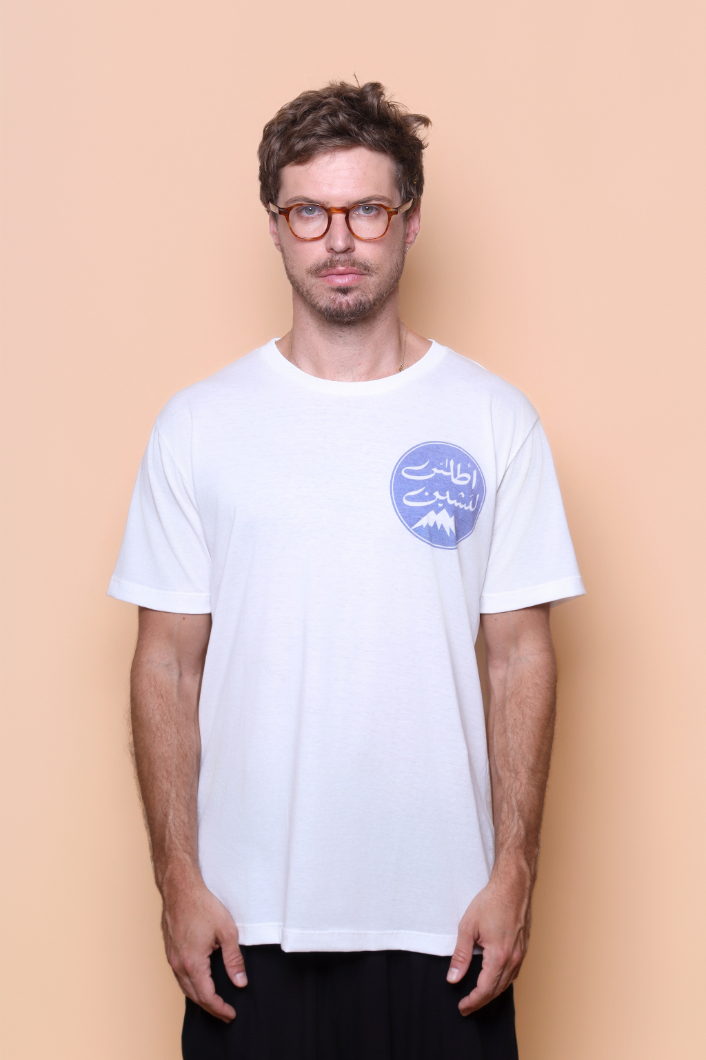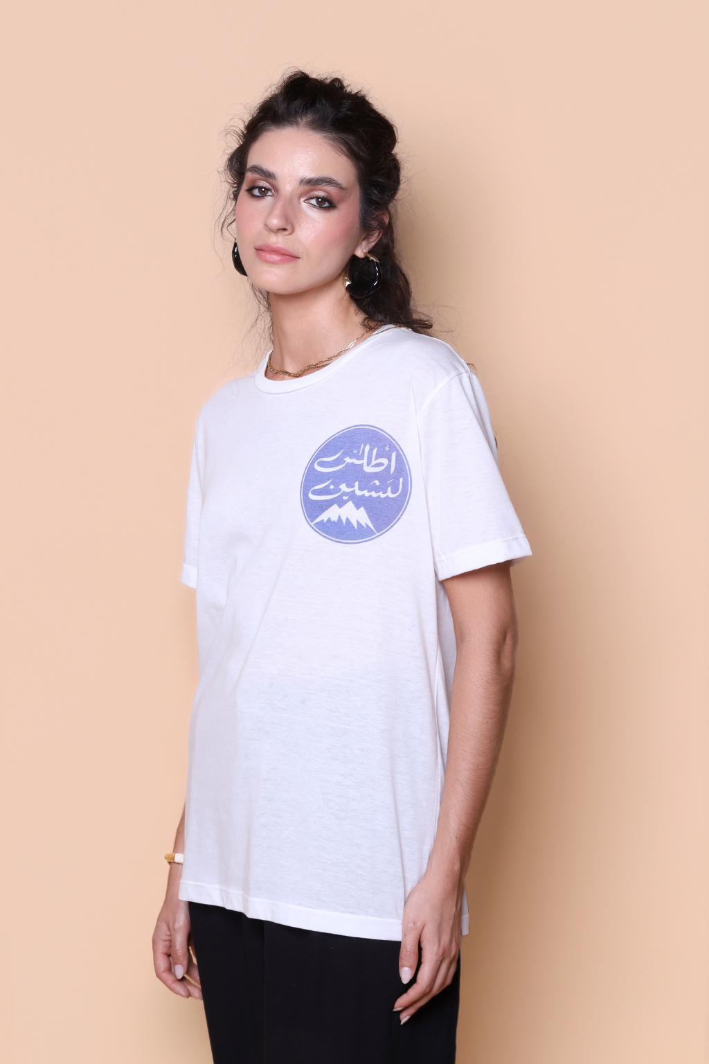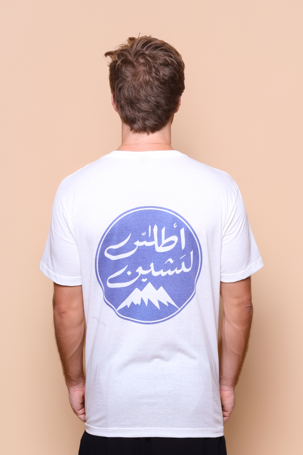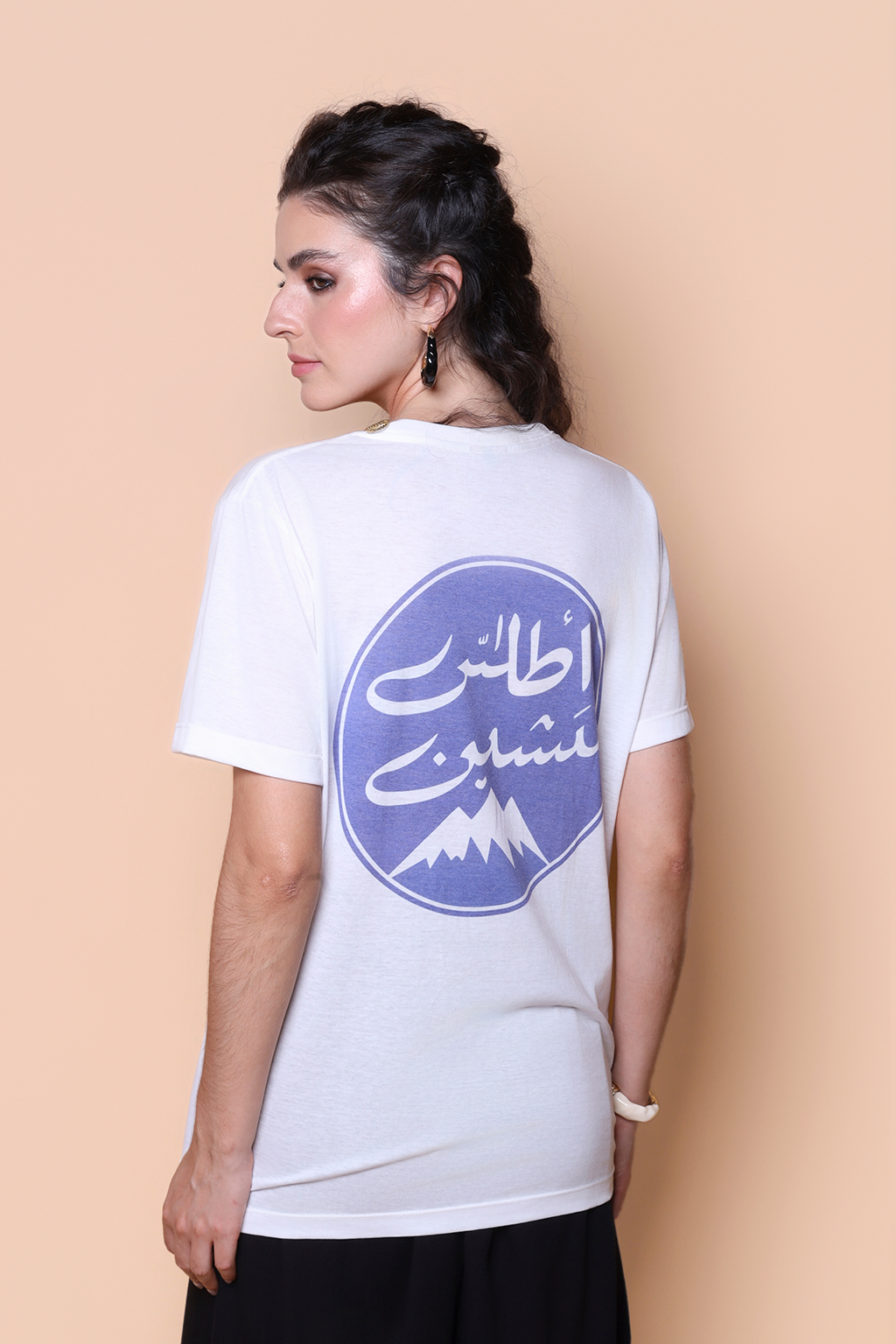 A camiseta Abecedário é confeccionada em tecido meia malha de algodão, dando um toque mais macio e agradável. Além disso, tem como estampa uma espécie de logo com uma montanha com seu pico coberto em neve, e palavras em árabe.
