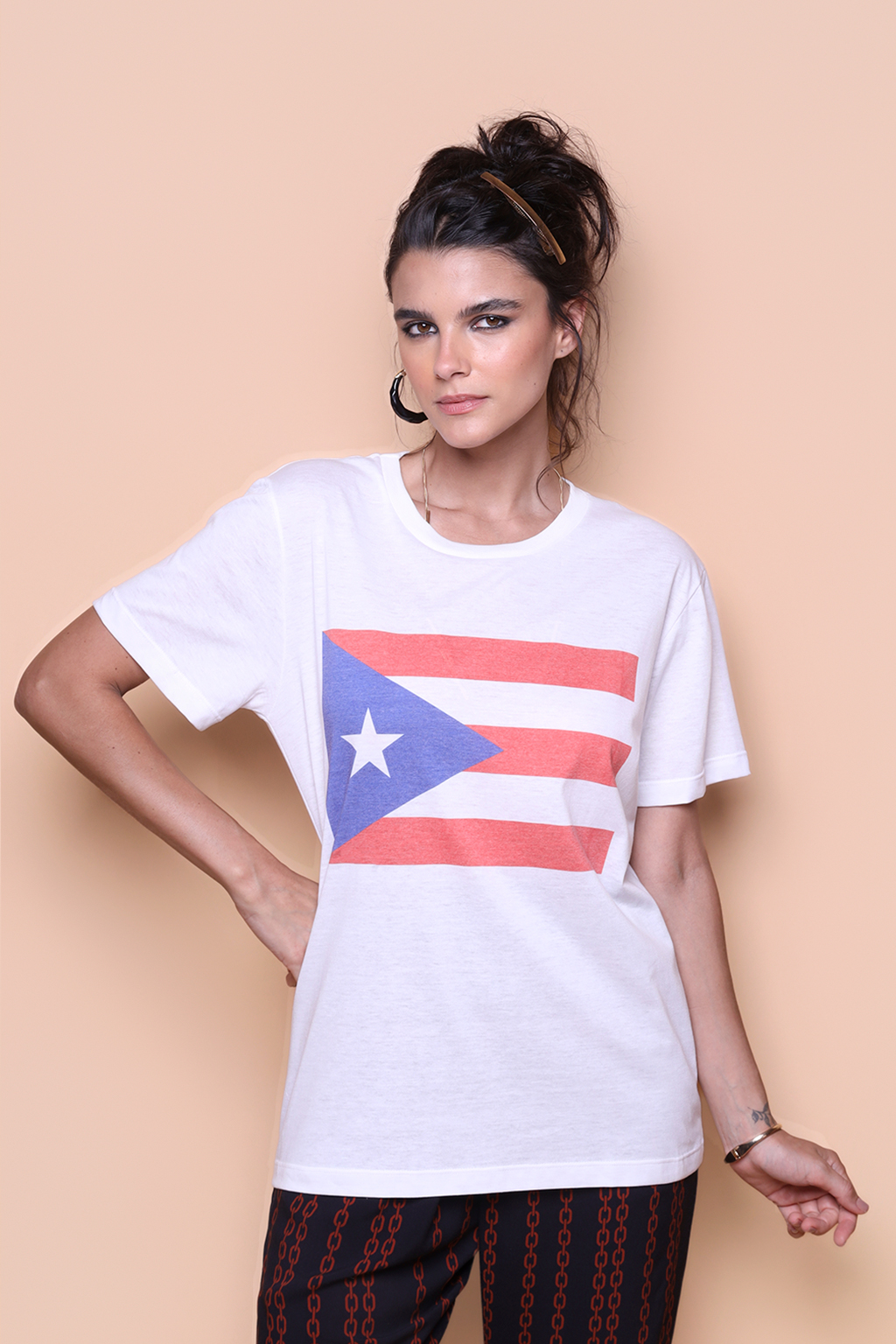 Camiseta estampada Porto Rico. Ambos modelos vestem tamanho P.