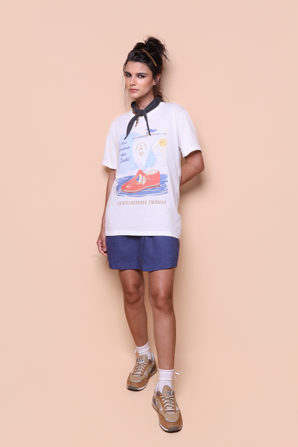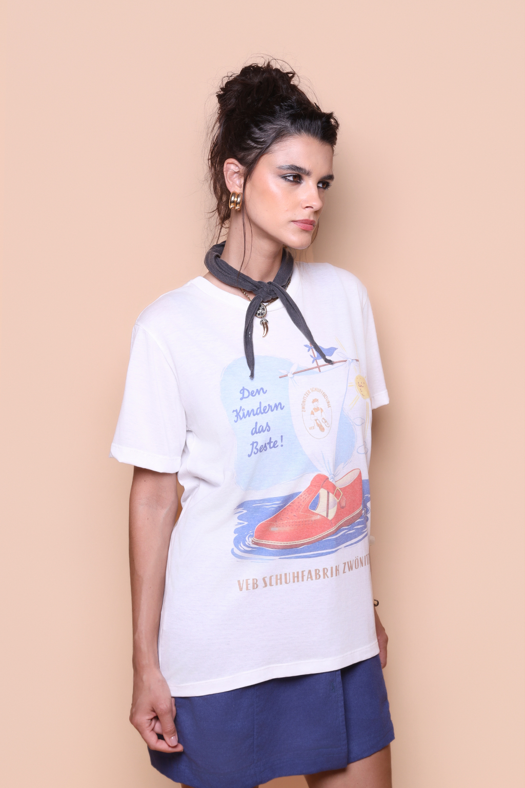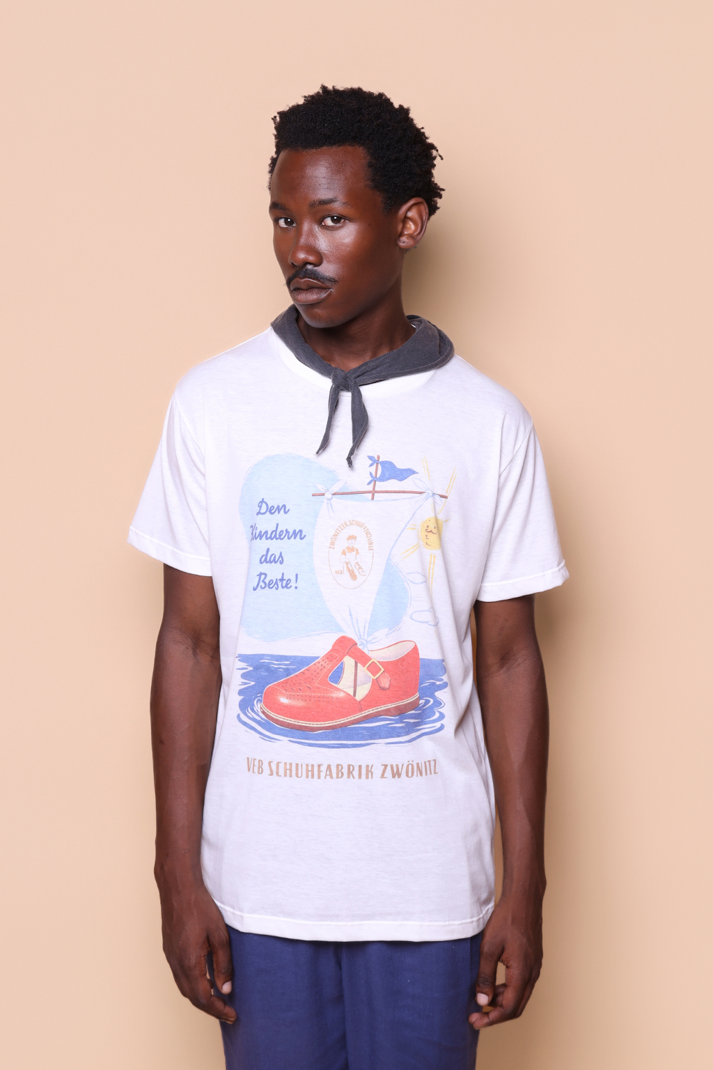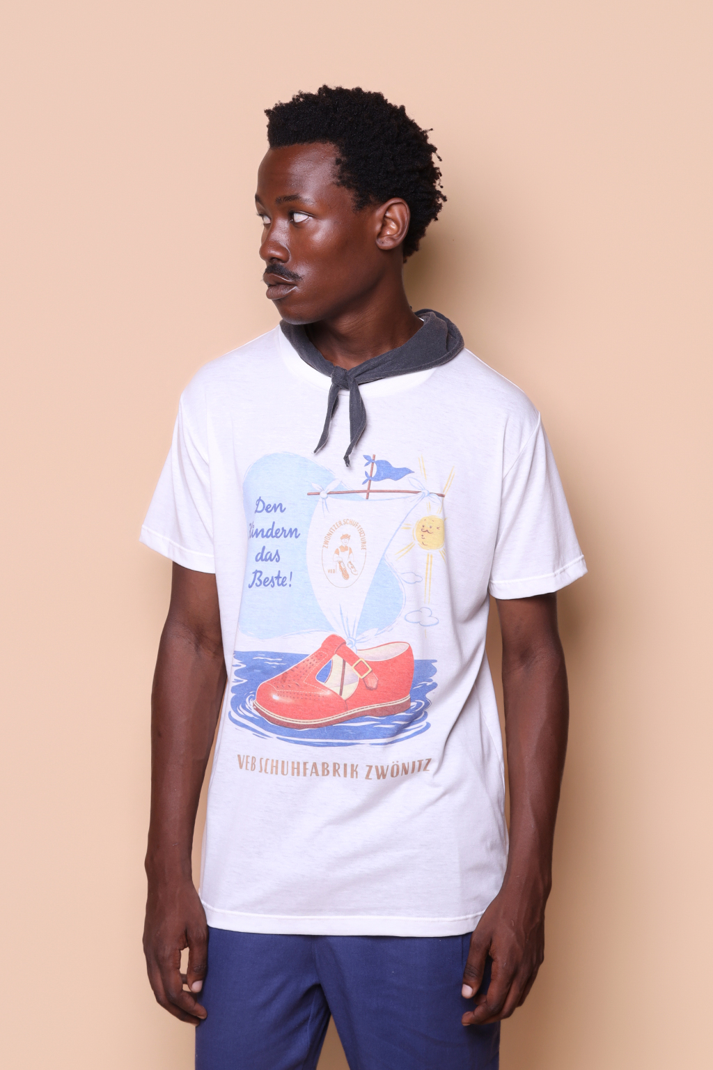 A camiseta Schuhfabrik é confeccionada em tecido meia malha de algodão, dando um toque mais macio e agradável. Além disso, tem como estampa uma campanha publicitária de uma fábrica de sapatos da Alemanha Oriental, a VEB Schuhfabrik Zwonitz. O texto principal do anúncio pode ser traduzido para “o melhor para as crianças!”, enquanto o texto inferior diz “Fábrica de Sapatos VEB Zwonitz.