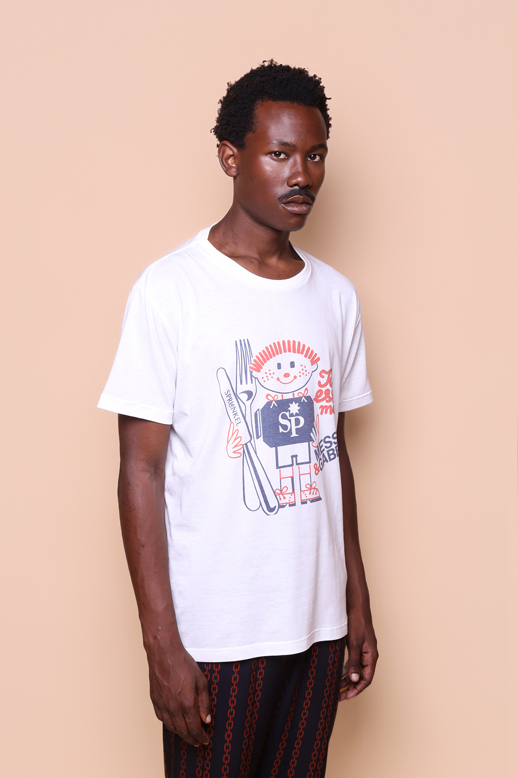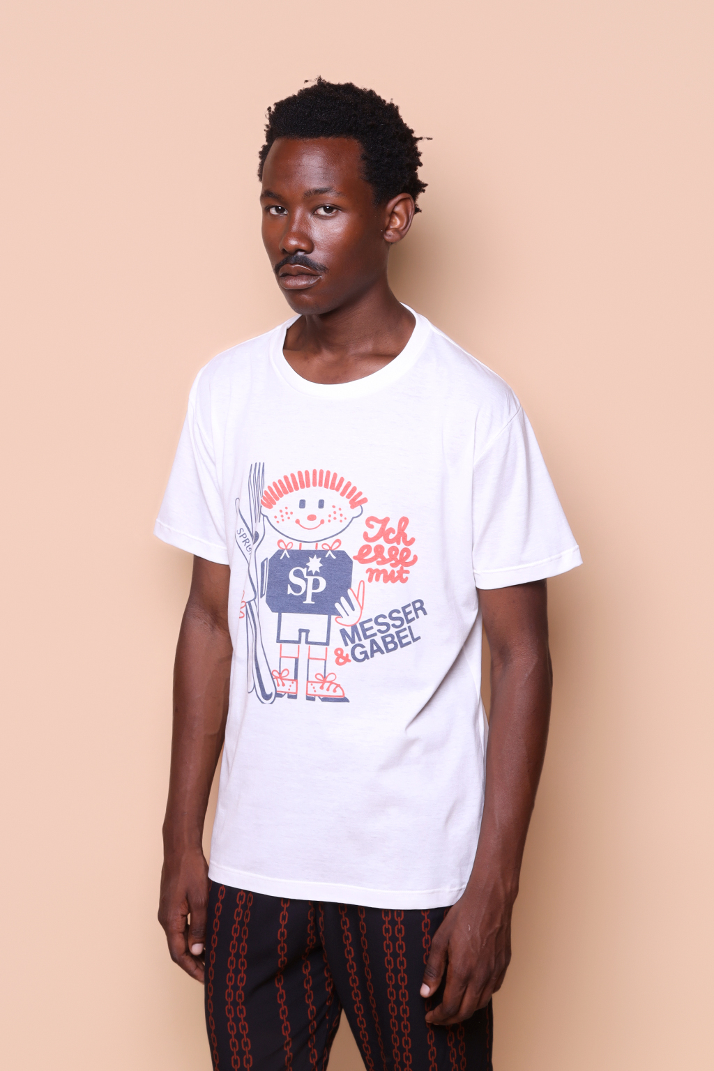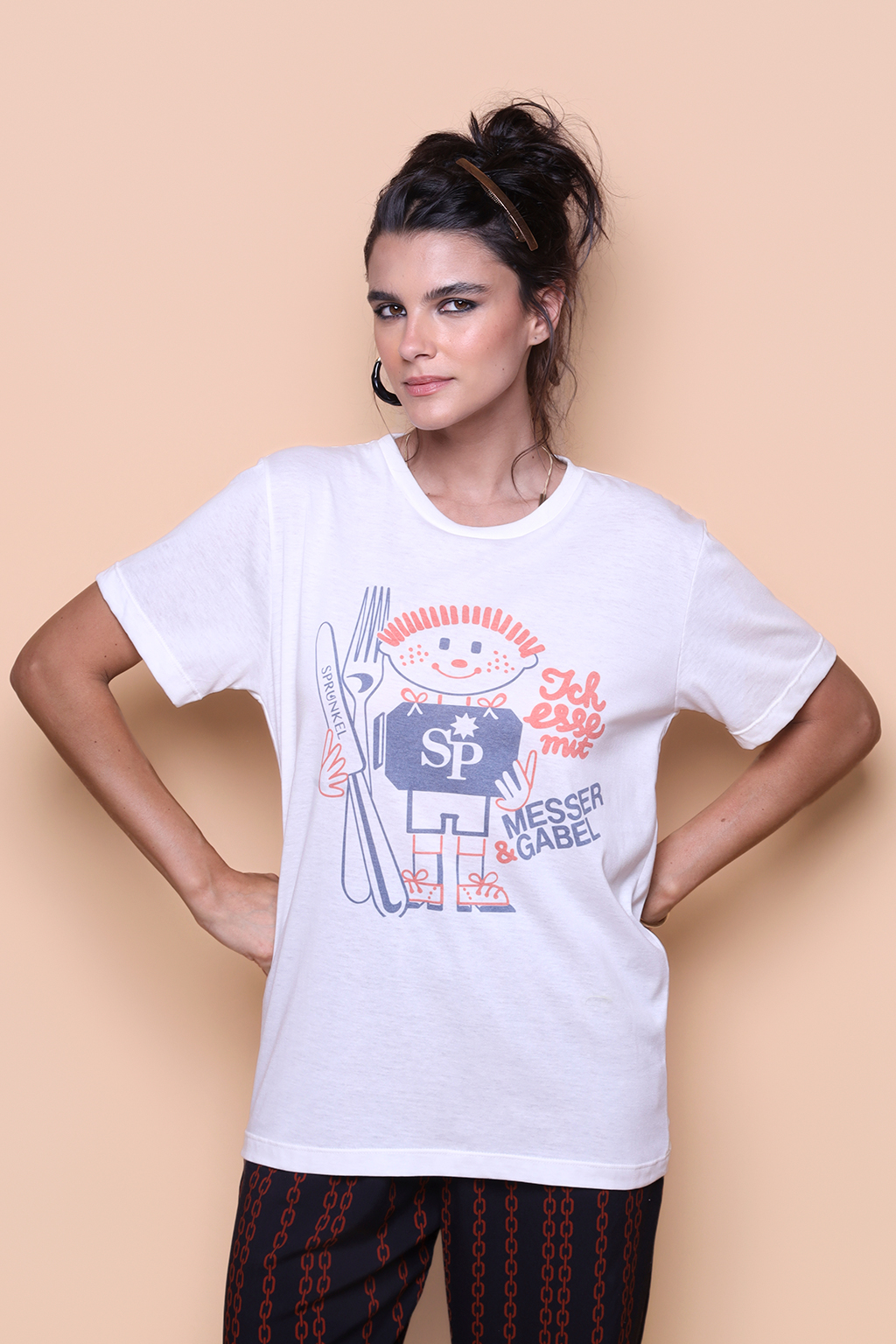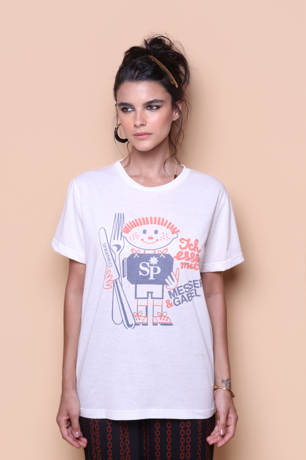 A camiseta Sprunkel é confeccionada em tecido meia malha de algodão, dando um toque mais macio e agradável. Além disso, tem como estampa um anúncio publicitário alemão da marca de talheres Sprunkel. O anúncio mostra um desenho de uma criança segurando um garfo e uma faca, com a frase “ich esse mit messer & gabel”, que pode ser traduzida para “eu como com faca e garfo”.