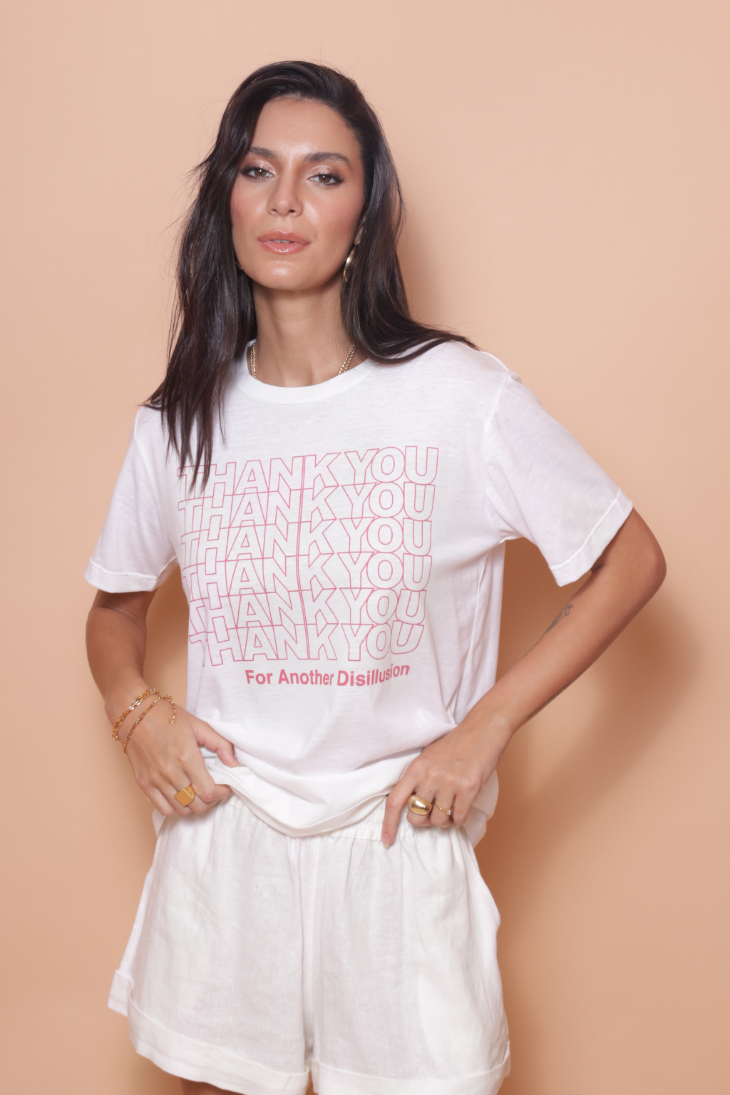 Camiseta estampada Thank you. A modelo mede 1,80 e usa tamanho P.