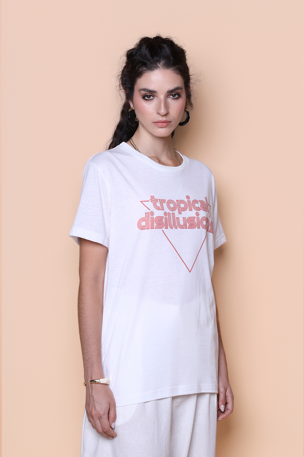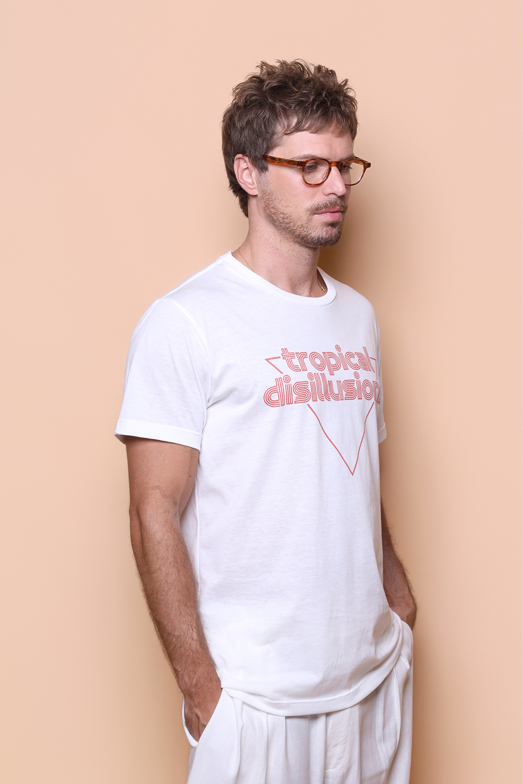 A camiseta Tropical Disillusions é confeccionada em tecido meia malha de algodão, dando um toque mais macio e agradável. Além disso, tem como estampa uma frase em inglês centralizada no peito que pode ser traduzida como “desilusão tropical”.