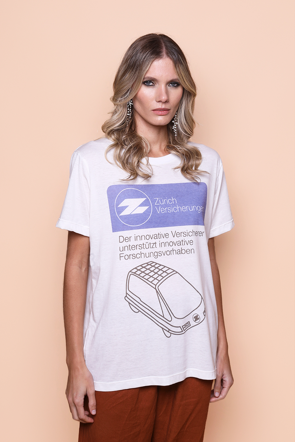 Camiseta estampada Zurich Seguros. A modelo mede 1,72 e o modelo mede 1,78 e ambos usam tamanho P.