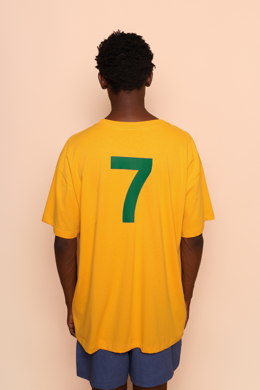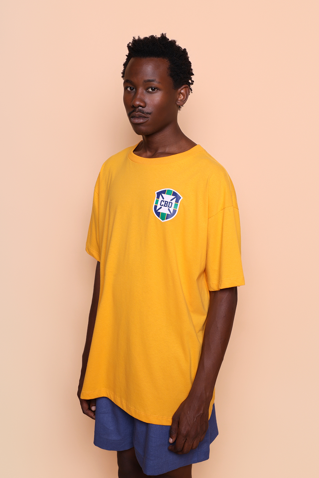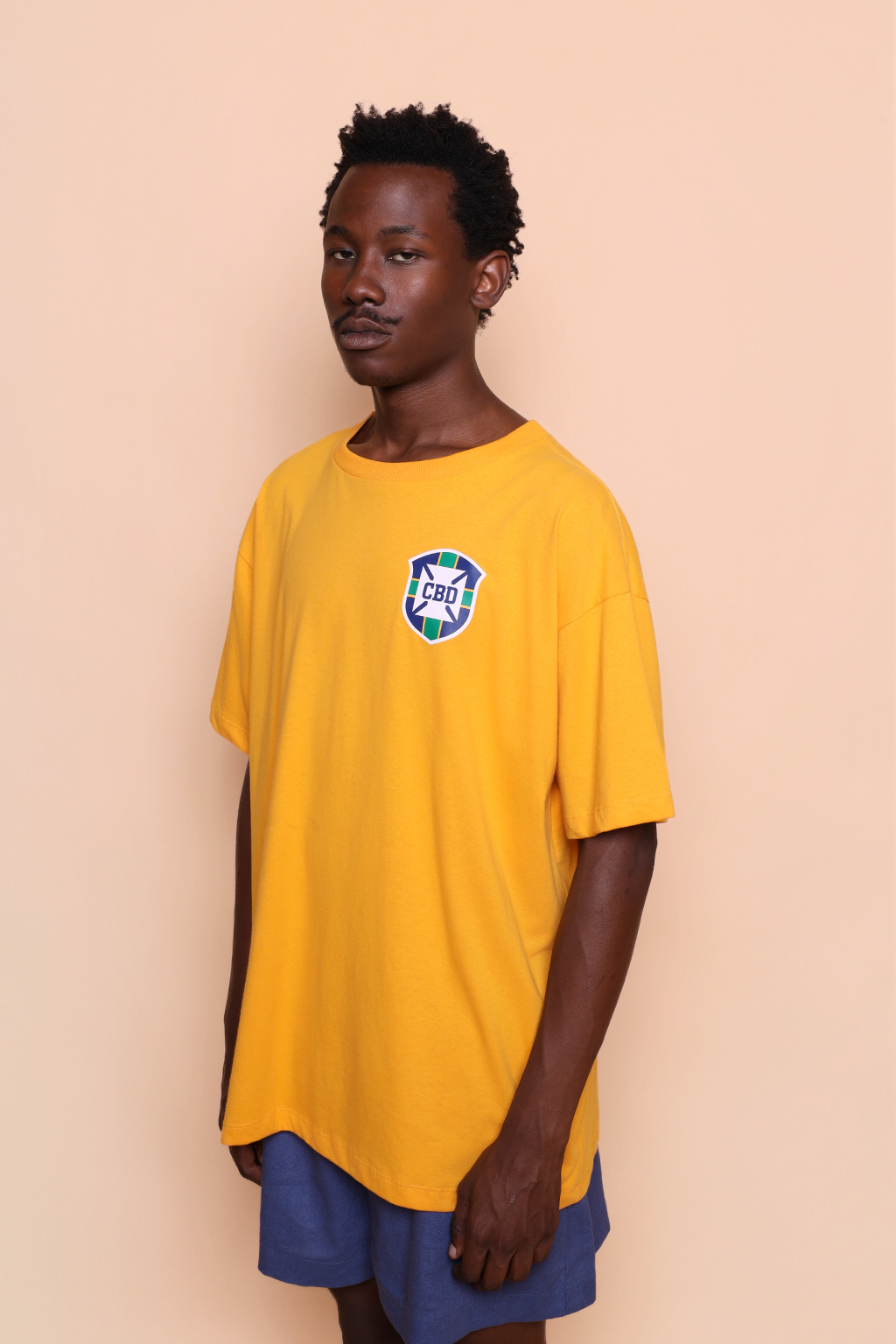 Camiseta oversize algodão amarela Seleção de 62. Ambos os modelos vestem tamanho 1.